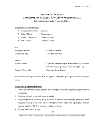 183 PROTOKÓŁ NR 29.2015 Z POSIEDZENIA ZARZĄDU POWIATU
