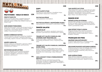 CZK ZUPY PRZYSTAWKI – MAŁE CO NIECO CZK ČERSTVÝ KOZÍ SÝR Świeży ser kozi obtoczony w popiele drzewnym, serwowany z domową marmoladą z rokitnika i jabłuszek, czipsy z chleba chia, włoskimi orzechami i nitkami chilli 189,NAŠE DOMÁCÍ POMAZÁNKA Nasza domowa pasta z wolno pieczonego boczku na rozmarynie i czosnku, serwowany na toście z chleba na zakwasie z marmoladą cebulową i pikantną sałatką z marynowanych warzyw 159.DOMÁCÍ ZVĚŘINOVÁ PAŠTIKA Domowy pasztet z dziczyzny z żurawiną, migdałami i winem porto, serwowany z cebulowo-jeżynową marmoladą, czipsem z boczku i orkiszowym chlebem 179,HOVĚZÍ CARPACCIO Wołowe carpaccio z majonezem z gorczycą, olejem bazyliowym, kaparami, rukolą i parmezanowocheddarowymi czipsami 219,RESTOVANÁ KACHNÍ JATÝRKA Duszona wątróbka z kaczki podlana koniakiem ze świeżym jabłuszkiem, suszonymi śliwkami i prażonymi migdałami, serwowana w cebuli z grzankami czosnkowymi 199,- SILNÝ SLEPIČÍ VÝVAR Aromatyczny rosół drobiowy z kawałkami mięsa, celestyńskim makaronem i warzywami POCTIVÁ GULÁŠOVÁ Zupa gulaszowa z ziemniakiem 79,- CZK 150G HOVĚZÍ FLAP STEAK 150g wołowy flam steak na rwanych liściach sałaty z karczochami, suszonymi pomidorami, oliwkami liguryjskimi, pomidorkami cherry, wiórkami parmezanu i dressingiem z bazyliowej musztardy dijon, miodu i octu balsamicznego 349,- ŚWIEŻE RYBY 89,- POCTIVÁ GULÁŠOVÁ V ROZPEČENÉM CHLEBU / Zupa gulaszowa z ziemniakiem w pieczonym chlebie 119,- PEČENÁ FILÁTKA ZE PSTRUHA Pieczony filet z pstrąga, serwowany z sałatką z fenkułu na ciepło, suszonych pomidorów, oliwek liguryjskich i ziemniaków grenaille oraz pikantnym sosem z pomidorków cherry ŚWIEŻE SAŁATKI CAESAR SALÁT Sałatka cezar z kurczakiem, grzankami, pieczonym boczkiem i parmezanowo-cheddarowymi czipsami 199,TRHANÉ LISTY SALÁTU S RUKOLOU, RED CHARDEM, BABY MOZZARELLOU Rwane liście salaty z rukolą, red chardem, baby mozzarellą, pomidorkami cherry i bazyliową oliwą extra 200G PEČENÝ STEAK Z LOSOSA 200g pieczonego steku z łososia z panierką z wędzonego boczku pancetta, serwowany z ziemniaczanym purée ze szpinakiem i sosem z buraków i śmietany 359,- 359,- PRZEKĄSKI DO PIWA 189,- TRHANÉ LISTY SALÁTU S RUKOLOU, ZAPEČENÝM KOZÍM SÝREM Rwane liście sałaty z rukolą, zapieczonym serem kozim na toście, szynką parmeńską, marynowaną gruszką, orzechami włoskimi i dressingiem z czarnej porzeczki, octu malinowego i oleju z zielonych cytryn 299,200G LOSOSOVÝ STEAK S PARMAZÁNOVOU KRUSTOU 200g stek z łososia z parmezanową panierką, serwowany na sałacie z rukolą, fenkułem, oliwkami liguryjskimi, czerwonym grejpfrutem i dressingiem z pomarańczowego karmelu 339,- SMAŽENÉ CIBULOVÉ KROUŽKY Smażone krążki cebulowe w chrupiącej piwnej panierce z domowym sosem z powideł 159,- GRILOVANÉ PIKANTNÍ A BÍLÉ MINI KLOBÁSKY Grillowane pikantne białe mini kielbaski, serwowane na drewnianej desce z chrzanem jabłkowym, musztardą, cebulką wiedeńską, salsą warzywną i świeżym chlebem 259,NAŠE VEPŘOVÁ ŽEBRA Nasze żeberka wieprzowe zapiekane w sosie barbecue, serwowane na drewnianej desce z marynowanymi warzywami i dipami na zimno 299,- CZK PEČENÁ KUŘECÍ KŘIDÉLKA Pieczone skrzydełka z kurczaka w pikantnej marynacie, serwowane na drewnianej desce ze świeżymi warzywami, dipami na zimno i pieczoną bagietką 269,- VEPŘOVÉ KOLENO Golonka pieczona w marynacie piwnej z chrzanem, musztardą, ogórkiem i świeżym chlebem 359,150G TATARÁK 150g tatar z polędwicy wołowej, przygotowywany na miejscu, serwowany z grzankami i czosnkiem 349,NÁMI NAKLÁDANÉ ČESKÉ SÝRY Marynowane przez nas czeskie sery w oleju słonecznikowym z papryczką chilli, czerwoną cebulką, orzechami włoskimi i świeżymi ziołami, serwowane z chlebem na zakwasie 279,- CZK PEČENÉ KRÁLIČÍ STEHNO Pieczone udko z królika na musztardzie ze szpinakiem u domowymi smażonym domowym ziemniaczanym gnocchi na cebulce i wędzonym boczku 349,- 250G POMALU DUŠENÁ HOVĚZÍ LÍČKA 250g wolno duszone policzki wołowe na warzywach korzeniowych, czerwonym winie i świeżych ziołach, serwowane z ziemniaczanym purée 349,KACHNÍ STEHNO PEČENÉ Udko z kaczki pieczone na złoty kolor, serwowane z duszoną kapustą z żurawiną i ziemniaczanocebulowym knedlikiem 200G SMAŽENÝ KUŘECÍ ŘÍZEK 200g smażony kotlet z kurczaka z ziemniaczanym purée, ogórkiem i cytryną 349,- 239,- CZESKA KUCHNIA SPECJAŁY „KOTLET“ NAŠE HOVĚZÍ SVÍČKOVÁ NA SMETANĚ Nasza polędwica wołowa na śmietanie z domowym knedlem bułczanym i żurawiną 219,- 400G GRILOVANÁ VEPŘOVÁ KOTLETA 400g grillowany kotlet wieprzowy w panierce pieprzowej, serwowany z pikantną fasolką w pieczonym chlebie, karmelizowaną cebulką i naszym wiśniowo-miodowym sosem z whiskey 389,- STAROPRAŽSKÝ HOVĚZÍ GULÁŠ Gulasz staropraski z czerwoną cebulą i domowym knedlem bułczanym 219,- 400G PEČENÉ ŠPALÍČKY 400g pieczone kawałki z boczku wieprzowego i łopatki na kminku i czosnku, serwowane z czerwoną duszoną kapustą, domowym bułczanym i ziemniaczanym knedlikiem 319,- 200G BIFTEK Z MLADÉHO BÝČKA 200g biftek z młodego byczka z gratynowanymi parmezanowymi ziemniakami, ragout z fasoli, pomidorków cherry, czerwonej cebulki i wędzonego boczku, sosem z zielonego pieprzu lub wina porto i fig 499,400G VEPŘOVÁ KRKOVICE 400g karkówka wieprzowa marynowana w dzikich ziołach, serwowana z ziemniakami pieczonym na kaczym smalcu, podsmażanymi jabłkami na cebuli i sosem z cydru 389,- CZK 250G ARGENTINSKÝ RIB EYE STEAK 250g argentyński rib eye steak, serwowany z podsmażanym groszkiem na wędzonym boczku, pieczonymi ziemniaczkami grenaille i sosem estragonowym 479,- KŘUPAVÉ KUKUŘIČNÉ KUŘÁTKO S KŘIDÉLKEM Chrupiący kukurydziany kurczaczek ze skrzydełkiem, serwowane na pieczonych warzywach korzeniowych ze świeżymi ziołami, ziemniaczkami grenaille i kremowym sosem grzybowym 329,200G NÁŠ SIGNATURNÍ „KOTLE