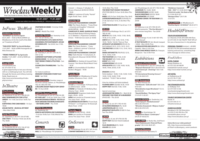 WrocławWeekly Free City Guide to Events, Music, Film, Theatre, Museum, Pubs & More Issue #73 05.01.2007 - 11.01.2007 > we are now online: www.WroclawWeekly.pl > [email protected] InFocus: ThisWeek (Partners in Crime) - Fri & Sat 19:00; Sun 20:00 Smycz - Wed & Thu 19:00 “EX NIHILO” by Ewelina Gąsior 05.01.2007 - 19:00 @ MLECZARNIA (ul. Włodkowica 5) On the motif of the Biblical “Creations of Earth.” Komedia Theatre (pl. Teatralny 4, tel. 071/ 316-07-78 thru -80) Psychoterapia czyli seks w życiu człowieka (Psychotherapy, or sex in human life) - Sat 20:00; Sun 17:00, 20:00 Exhibition Openings “The Gypsy Trips” by Harald Medbøe 11.01.2007 - 18:00 @ BWA Awangarda (ul. Wita Stwosza 32) “Trans-formacje” by Agnieszka Ćwikła / 11.01.2007 - 23:59 @ RURA (ul. Łazienna 4) Quad Biking ActivePoland.com tel. 071/354-47-42 A great opportunity to test your driving skill on a challenging track. You will ride through the forests and military training fields. Read more at: http://www.wroclawweekly.pl/index. php/activities/ InTheatre Współczesny (Contemporary) Theatre (ul. Rzeźnicza 12, tel. 071/ 358-89-22) Mały Kominiarczyk (The Little Sweep) - Fri 11:00; Sat & Sun 16:00; Tue 11:00 Kartoteka (The Card Index) - Fri-Sun 19:00 Dolne partie – musical intymny - Mon-Wed 19:00 Polski Theatre (1) (ul. Zapolskiej 3, tel. 071/ 316-07-80) One (They) - Fri & Sun 19:30; Sat 20:30; Thu 18:00 Polski Theatre (2) (ul. Świdnicka 28, tel. 071/ 316-07-52) Małe zbrodnie małżeńskie Lalek (Puppet) Theatre (pl. Teatralny 4, tel. 071/ 344-76-77, 344-12-16) Czerwony Kapturek (Little Red Riding Hood) - Fri 10:00; Sat 15:00 Trzy Świnki (Three Little Pigs) - Sun 11:00 Calineczka (Thumbelina) - Tue-Thu 10:00 For mature audience: Śmieszny Staruszek (Funny Old Man) - Sat 19:00 Ad Spectatores (Chamber stage at the main railway station, ul. Piłsudskiego 103, tel. 502-210-735) 3 żelazne zasady mężczyzny seniora - Fri-Sun 20:00 CAPITOL Musical Theatre (ul. Piłsudskiego 67, tel. 071/789-04-00) My Fair Lady - Fri & Sat 19:00; Sun 17:00 W 80 dni dookoła świata - po stu latach (Around the World in 80 days - 100 years later) - Thu 10:30 OPERA Wrocławska (ul. Świdnicka 35) Zemsta nietoperza (Die Fledermaus) - Fri & Sat 19:00; Sun 17:00; Wed & Thu 19:00 Concert - J. Strauss, F. Schubert, R. Strauss (Classical: 60/40/25/15PLN) - 19:00 RURA (ul. Łazienna 4) Funky “Kasiuk” Night (Funk: Free) - 20:30 Saturday 6th WROCŁAW PHILHARMONIC CONCERT HALL The Classic Buskers - “Crazy Show - virtuosity and laughter” (Classical: 60/40/20PLN) - 18:00 CHURCH OF ST. MARY, QUEEN OF PEACE (Kościół Matki Bożej Królowej Pokoju, ul. O. Oblatów 1, Popowice) Cantilena (Choir) - 19:00 (Service starts at 18:00) Sunday 7th WROCŁAW PHILHARMONIC CONCERT HALL The Classic Buskers - “Crazy Show - children’s carnival” (Classical: 15/10/5PLN) - 11:00 WROCŁAW PHILHARMONIC CONCERT HALL Violin Recital - R. Schumann, D. Shostakovich (Classical: 30/20/15PLN) - 18:00 MADNESS (ul. Hubska 6) Coward Pride / Zaszyty / Von Kossel (Rock/Metal: Free) - 18:30 ALIBI (ul. Grunwaldzka 67) EastWest Rockers (Reggae) - 19:00 Tuesday 9th MLECZARNIA (ul. Włodkowica 5) Sueño Andaluz (Flamenco: Free) - 20:00 Wednesday 10th LA LUZ (ul. Krainskiego 14) Krzywa Grzywa (Ethno/Jazz) - 20:00 ŁYKEND (ul. Podwale 37/38) Betty Blue (Shanty: Free) - 20:00 BEZSENNOŚĆ Organizm (Indie Sond Night: 5PLN) - 20:30 RURA Jam session w/ Przemek Jarosz Trio (Jazz: Free) - 20:30 OD ZMIERZCHU DO ŚWITU (“From Dusk Till Dawn” / ul. Krupnicza 15) Staszczyk (Rock: Free) - 21:00 Thursday 11th ŁYKEND Buraky (5PLN) - 20:00 RURA Jam session w/ Przemek Jarosz Trio (Jazz: Free) - 20:30 14:45; Mon-Thu 14:30 The Wind That Shakes the Barley (FR/IT/DE/GB/IE) Fri-Sun 16:45; Mon-Thu 16:30 Babel (US) Fri-Sun 19:00; Mon-Thu 18:45 Laitakaupungin valot (FI/FR/DE) Fri 21:30; Sat & Sun 13:15, 21:30; Mon-Thu 21:15 Christmas in Love (IT) Sat & Sun 11:15 HELIOS (Kazimierza Wielkiego 19a-21, tel. 071/ 786-65-66) Déjà Vu (US) 12:00, 14:30, 17:00, 18:45, 19:30, 21:15, 22:00 Saw III (US) 11:45, 13:45, 15:45, 17:45, 19:45, *20:45, *22:45 (* Not on Thu) Arthur et les Minimoys (FR/US: Polish Dubbed) 10:15, 12:15, 14:15, 16:15 The Prestige (US/GB) 11:15, 15:45, 18:15, 21:45 Marie Antoinette (FR/JP/US) 12:15, 16:15, 18:30, 21:00 The Fountain (US) 17:30, 21:30 The Holiday (US) 15:00, 20:00 Borat (US) 13:45 Casino Royale (US) 22:30 Apocalypto (US) 11:30, 14:00, 16:30, 18:00, 19:00, 20:30, 21:30 Eragon (US/HU) Polish dubbed - 10:00, 11:30, 12:00, 13:30, 14:00, 15:30, 16:00, 17:30 Subtitled - *19:30 (* Not on Wed) Films for children (all Polish dubbed): Flushed Away (US/GB) 10:30, 14:30 Happy Feet (AU/US) 11:00, 13:00 Special screenings: Jasne błękitne okna (PL) - Wed 20:30 Perfume: The Story of a Murderer (FR/ES/DE) - Thu 20:30 LALKA (ul. Prusa 32, tel. 071/ 792-44-05) Co słonko widziało (PL) 16:30 Jungfrukällan (SE) 18:30 Breakfast on Pluto (IE/GB) Fri-Sun, Tue-Thu 20:00 LWOW Concerts OnScreen ATOM (ul. Hallera 15, tel. 071/793-50-78) Happy Feet (AU/US: Polish Dubbed) 16:15 Plac Zbawiciela (PL) 18:00 Volver (ES) 20:00 WROCŁAW PHILHARMONIC CONCERT HALL (ul. Piłsudskiego 19) Symphonic (ul. Piłsudskiego 74, tel. 071/ 347-14-65) L’Enfant endormi (BE/MA) Fri-Sun WARSZAWA Friday 5th Contact: Wrocław Tourist Information Center, Rynek 14, 50-101 Wrocław, tel. (+48 71) 344 31 11, [email protected] (ul. Piłsudskiego 64, tel. 071/ 792-43-83) Jasminum (PL) 16:00, 18:00 The Wicker Man (US/DE) 16:00 Black Christmas (US/CA) 18:00 The Departed (US) 20:00 Leonard Cohen: I’m Your Man (US) 20:00 RURA (ul. Łazienna 4, tel. 071/799-09-07) WroFilm presents: “The One Minutes” / one-minute-long films - Tue 20:00 LA LUZ (ul. Kraińskiego 14, tel. 0-661-927-476, www.laluz.pl) À tout de suite (FR/ dir. Benoît Jacquot / 2004) - Mon 20:00 /Free Globalization and Health (dir. Gilles Capelle) - Mon 21:30 /Free Manu Chao World Tour (dir. François Bergeron) - Tue 21:00 /Free Exhibitions Museum
