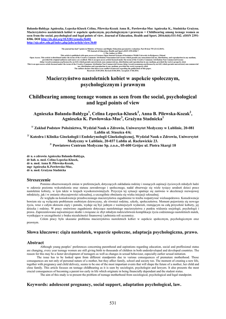 Bałanda-Bałdyga Agnieszka, Łepecka-Klusek Celina, Pilewska-Kozak Anna B., Pawłowska-Muc Agnieszka K., Stadnicka Grażyna. Macierzyństwo nastoletnich kobiet w aspekcie społecznym, psychologicznym i prawnym = Childbearing among teenage women as seen from the social, psychological and legal points of view. Journal of Education, Health and Sport. 2016;6(6):531-542. eISSN 23918306. DOI http://dx.doi.org/10.5281/zenodo.56481 http://ojs.ukw.edu.pl/index.php/johs/article/view/3640 The journal has had 7 points in Ministry of Science and Higher Education parametric evaluation. Part B item 755 (23.12.2015). 755 Journal of Education, Health and Sport eISSN 2391-8306 7 © The Author (s) 2016; This article is published with open access at Licensee Open Journal Systems of Kazimierz Wielki University in Bydgoszcz, Poland Open Access. This article is distributed under the terms of the Creative Commons Attribution Noncommercial License which permits any noncommercial use, distribution, and reproduction in any medium, provided the original author(s) and source are credited. This is an open access article licensed under the terms of the Creative Commons Attribution Non Commercial License (http://creativecommons.org/licenses/by-nc/4.0/) which permits unrestricted, non commercial use, distribution and reproduction in any medium, provided the work is properly cited. This is an open access article licensed under the terms of the Creative Commons Attribution Non Commercial License (http://creativecommons.org/licenses/by-nc/4.0/) which permits unrestricted, non commercial use, distribution and reproduction in any medium, provided the work is properly cited. The authors declare that there is no conflict of interests regarding the publication of this paper. Received: 25.05.2016. Revised 25.06.2016. Accepted: 27.06.2016. Macierzyństwo nastoletnich kobiet w aspekcie społecznym, psychologicznym i prawnym Childbearing among teenage women as seen from the social, psychological and legal points of view Agnieszka Bałanda-Bałdyga1, Celina Łepecka-Klusek2, Anna B. Pilewska-Kozak2, Agnieszka K. Pawłowska-Muc3, Grażyna Stadnicka1 1/ Zakład Podstaw Położnictwa, Wydział Nauk o Zdrowiu, Uniwersytet Medyczny w Lublinie, 20-081 Lublin ul. Staszica 4/6; 2/ Katedra i Klinika Ginekologii i Endokrynologii Ginekologicznej, Wydział Nauk o Zdrowiu, Uniwersytet Medyczny w Lublinie, 20-037 Lublin al. Racławickie 23. 3/ Powiatowe Centrum Medyczne Sp. z.o.o., 05-600 Grójec ul. Piotra Skargi 10 dr n. o zdrowiu Agnieszka Bałanda-Bałdyga, dr hab. n. med. Celina Łepecka-Klusek, dr n. med. Anna B. Pilewska-Kozak, mgr Agnieszka K.Pawłowska-Muc, dr n. med. Grażyna Stadnicka Streszczenie Pomimo obserwowanych zmian w preferencjach, dotyczących zakładania rodziny i rosnących aspiracji życiowych młodych ludzi w zakresie poziomu wykształcenia oraz statusu zawodowego i społecznego, nadal obserwuje się wiele tysięcy urodzeń dzieci przez nastoletnie kobiety, w tym także w krajach wysokorozwiniętych. Przyczyn tej sytuacji upatruje się zarówno w akceleracji rozwojowej młodzieży, jak i w zmianie obyczajowości seksualnej, a szczególnie obniżaniu się wieku inicjacji seksualnej. Ze względu na konsekwencje przedwczesnego macierzyństwa zagadnienie to trzeba rozpatrywać wieloaspektowo. Konsekwencje bowiem nie są wyłącznie problemem osobistym dziewczyny, ale również rodziny, szkoły, społeczeństwa. Moment pojawienia się nowego życia, wraz z całym okresem ciąży i porodu, wydaje się być jednym z ważniejszych wydarzeń, rzutującym na całą przyszłość kobiety, jej dziecka i rodziny. W pracy omówiono zagadnienie dotyczące nastoletniego macierzyństwa z punktu widzenia socjologii, psychologii i prawa. Zaprezentowano najważniejsze skutki i związane ze zbyt młodym rodzicielstwem komplikacje życia codziennego nastoletnich matek, wynikające w szczególności z braku niezależności finansowej i pełnienia roli uczennicy. Celem pracy było ukazanie problemu macierzyństwa nastoletnich kobiet w aspekcie społecznym, psychologicznym oraz prawnym. Słowa kluczowe: ciąża nastolatek, wsparcie społeczne, adaptacja psychologiczna, prawo. Abstract Although young peoples’ preferences concerning parenthood and aspirations regarding education, social and proffesional status are changing, every year teenage women are still giving birth to thousands of children in both underdeveloped and developed countries. The reason for this may be a faster development of teenagers as well as changes in sexual behaviour, especially earlier sexual initiation. The issue has to be looked upon from different standpoints due to various consequences of premature motherhood. Those consequences are not only of personal nature of a mother, but they affect family, school and society too. The moment of creating a new life, together with pregnancy and child delivery, seems to be one of the most important events that will shape the future of a mother, her child and close family. This article focuses on teenage childbearing as it is seen by sociologist, psychologist and lawyers. It also presents the most crucial consequences of becoming a parent too early in life which originate in being financially dependant and the student status. The aim of this study is to present the problem of teenage motherhood from sociological, psychological and legal standpoint. Keywords: adolescent pregnancy, social support, adaptation psychological, law. 531 Wprowadzenie Przedwczesne macierzyństwo zaburza powszechnie przyjęty w naszym społeczeństwie model życia, w którym kolejno jest: zdobywanie wykształcenia, podjęcie pracy zawodowej i uzyskanie niezależności finansowej, a dopiero później założenie rodziny [1]. Narodziny dziecka nie czynią z nastoletniej dziewczyny kobiety. Nadal pozostaje ona dzieckiem, niedojrzałym emocjonalnie, intelektualnie i społecznie. Znajduje się teraz tylko w nowej sytuacji życiowej, która wymaga od niej pełnien
