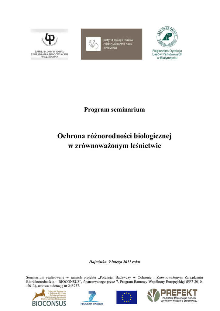 Program seminarium Ochrona różnorodności biologicznej w zrównoważonym leśnictwie Hajnówka, 9 lutego 2011 roku Seminarium realizowane w ramach projektu „Potencjał Badawczy w Ochronie i Zrównoważonym Zarządzaniu Bioróżnorodnością – BIOCONSUS”, finansowanego przez 7. Program Ramowy Wspólnoty Europejskiej (FP7 2010-2013), umowa o dotację nr 245737. Środa, 9 lutego 2011 r. 8:00-9:00 Rejestracja uczestników 9:00-9:10 Otwarcie seminarium, powitanie gości – dr hab. Sławomir Bakier – Dziekan Zamiejscowego Wydziału Zarządzania Środowiskiem Politechniki Białostockiej w Hajnówce; mgr inż. Ryszard Ziemblicki – Dyrektor Regionalnej Dyrekcji Lasów Państwowych w Białymstoku 9:10-9:20 Prezentacja projektu BIOCONSUS i idei Podlaskiego Regionalnego Forum Wymiany Wiedzy o Środowisku (PREFEKT) − mgr inż. Dorota Ławreszuk, Instytut Biologii Ssaków Polskiej Akademii Nauk, Białowieża 9:20-9:50 Bioróżnorodność lasów Polski – uwarunkowania naturalne i antropogeniczne – prof. dr hab. Bogumiła Jędrzejewska, dr Magdalena Niedziałkowska, mgr inż. Tomasz Borowik, Instytut Biologii Ssaków Polskiej Akademii Nauk, Białowieża 9:50-10:20 Rola Lasów Państwowych w kształtowaniu bioróżnorodności w ekosystemach leśnych – mgr inż. Marek Masłowski, Regionalna Dyrekcja Lasów Państwowych w Białymstoku 10:20-10:50 Tradycyjne, wielofunkcyjne użytkowanie Puszczy Białowieskiej w XV-XVIII wieku i jego wpływ na skład gatunkowy lasów – dr Tomasz Samojlik, Instytut Biologii Ssaków Polskiej Akademii Nauk, Białowieża 10:50-11:10 PRZERWA NA KAWĘ 11:10-11:30 Różnorodność biologiczna w Puszczy Białowieskiej jako funkcja georóżnorodności – dr Włodzimierz Kwiatkowski, Zamiejscowy Wydział Zarządzania Środowiskiem Politechniki Białostockiej w Hajnówce 11:30-11:50 Rola martwego drewna w zachowaniu bioróżnorodności w ekosystemach leśnych – dr Karol Zub, Instytut Biologii Ssaków Polskiej Akademii Nauk, Białowieża 11:50-12:10 Ochrona i zachowanie zasobów genowych drzew leśnych – dr hab. Adolf F. Korczyk, prof. Politechniki Białostockiej, Zamiejscowy Wydział Zarządzania Środowiskiem Politechniki Białostockiej w Hajnówce 12:10-12:30 Zróżnicowanie genetyczne drzewostanów i ich wpływ na zdrowotność – dr hab. Tomasz Oszako prof. IBL, dr hab. Justyna Nowakowska prof. IBL, Instytut Badawczy Leśnictwa Zakład Ochrony Lasu, Zakład Hodowli i Genetyki Drzew Leśnych, Sękocin Stary 12:30-12:50 Formy i metody ochrony różnorodności biologicznej w Leśnym Kompleksie Promocyjnym Puszcza Białowieska a zrównoważone leśnictwo w regionie białowieskim – mgr inż. Andrzej Antczak, Regionalna Dyrekcja Lasów Państwowych w Białymstoku 12:50-13:10 Monitoring stanu lasu źródłem wiedzy o dynamice procesów zachodzących w lasach chronionych na przykładzie Białowieskiego Parku Narodowego – mgr inż. Andrzej Keczyński, Białowieski Park Narodowy, Białowieża Seminarium realizowane w ramach projektu „Potencjał Badawczy w Ochronie i Zrównoważonym Zarządzaniu Bioróżnorodnością – BIOCONSUS”, finansowanego przez 7. Program Ramowy Wspólnoty Europejskiej (FP7 2010-2013), umowa o dotację nr 245737. 13:10-14:00 PRZERWA NA OBIAD 14:00-14:20 Ekologia i ochrona ptaków leśnych w świetle problemów gospodarki leśnej, obowiązującego ustawodawstwa oraz zmian klimatycznych – mgr Emilia Grzędzicka, Instytut Ochrony Przyrody Polskiej Akademii Nauk, Kraków 14:20-14:40 Ostoje różnorodności biologicznej w RDLP Szczecinek – koncepcja, realizacja, wnioski – mgr inż. Daniel Lemke, Regionalna Dyrekcja Lasów Państwowych, Szczecinek 14:40-15:00 Żubr – gatunek kluczowy dla ochrony różnorodności przyrodniczej – dr inż. Rafał Kowalczyk, Instytut Biologii Ssaków Polskiej Akademii Nauk, Białowieża 15:00-15:20 Bezkręgowce saproksyliczne w lasach Polski – prof. dr hab. Jerzy Gutowski, Europejskie Centrum Lasów Naturalnych Instytutu Badawczego Leśnictwa, Białowieża 15:20-15:40 Wpływ gospodarki leśnej na występowanie dzięcioła białogrzbietego Dendrocopos leucotos i trójpalczastego Picoides tridactylus w Puszczy Białowieskiej – dr hab. Wiesław Walankiewicz, Stowarzyszenie „Pracownia na rzecz Wszystkich Istot” Oddział Podlaski, Białystok 15:40-16:00 PRZERWA NA KAWĘ 16:00-16:20 Znaczenie gospodarki leśnej dla ochrony bioróżnorodności i jakości środowiska zbiorników i mokradeł śródleśnych oraz stref ekotonowych – dr Wojciech Puchalski, Pracownia Natury, Konstantynów 16:20-16:50 Wpływ zabiegów hodowlanych i ochronnych na poziom różnorodności biologicznej ekosystemów leśnych na obszarach chronionych i gospodarczych – mgr inż. Adam Kwiatkowski , Regionalna Dyrekcja Lasów Państwowych w Białymstoku 16:50-17:10 Stan i perspektywa ochrony pachnicy dębowej, kozioroga dębosza i jelonka rogacza w lasach Dolnego Śląska w przedziale 20 i 50 lat. – mgr inż. Wojciech Mazur, Regionalna Dyrekcja Lasów Państwowych, Wrocław 17:10-17:30 FunDivEurope: znaczenie różnorodności biologicznej dla funkcjonowania i produktywności ekosystemów leśnych w Europie. Założenie metodyczne projektu finansowanego z 7. Programu Ramowego UE. – dr inż. Bogdan Jaroszewicz, Uniwersytet Warszawski, Białowieska Stacja Geobotaniczna, Białowieża 17:30-17:50 Podsumowanie seminarium – prof. dr hab. Bogumiła Jędrzejewska, Instytut Biologii Ssaków Polskiej Akademii Nauk, Białowieża, mgr inż. Ryszard Ziemblicki, Regionalna Dyrekcja Lasów Państwowych, Białystok; dr hab. Sławomir Bakier, Zamiejscowy Wydział Leśnictwa Politechniki Białostockiej, Hajnówka; Seminarium realizowane w ramach projektu „Potencjał Badawczy w Ochronie i Zrównoważonym Zarządzaniu Bioróżnorodnością – BIOCONSUS”, finansowanego przez 7. Program Ramowy Wspólnoty Europejskiej (FP7 2010-2013), umowa o dotację nr 245737.