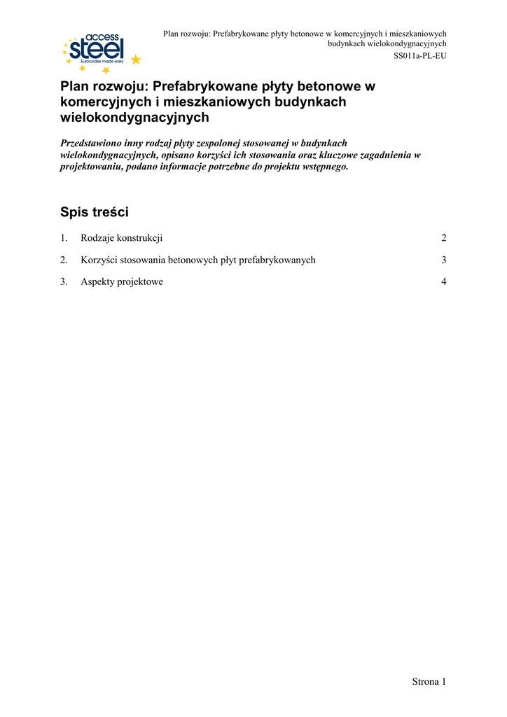 Plan rozwoju: Prefabrykowane płyty betonowe w komercyjnych i mieszkaniowych budynkach wielokondygnacyjnych SS011a-PL-EU Plan rozwoju: Prefabrykowane płyty betonowe w komercyjnych i mieszkaniowych budynkach wielokondygnacyjnych Przedstawiono inny rodzaj płyty zespolonej stosowanej w budynkach wielokondygnacyjnych, opisano korzyści ich stosowania oraz kluczowe zagadnienia w projektowaniu, podano informacje potrzebne do projektu wstępnego. Spis treści 1. Rodzaje konstrukcji 2 2. Korzyści stosowania betonowych płyt prefabrykowanych 3 3. Aspekty projektowe 4 Strona 1 Plan rozwoju: Prefabrykowane płyty betonowe w komercyjnych i mieszkaniowych budynkach wielokondygnacyjnych SS011a-PL-EU 1. Rodzaje konstrukcji Prefabrykowane płyty betonowe, jeŜeli są spręŜone, osiągają duŜe rozpiętości. Są produkowane o róŜnych grubościach. Rozpiętości płyt przyjmowana jest pomiędzy podpierającymi ją belkami, ścianami betonowymi lub murowanymi. Gdzie grubość konstrukcji jest ograniczona, płyty mogą być poparte na półkach kątowników przyspawanych z obu stron środnika belki. W stropach typu ‘slim floor’ lub zintegrowanych belkach konstrukcji, płyta moŜe być oparta na dolnym pasie lub półce belki tworząc strop o małej grubości. Istnieją dwa rodzaje płyt z betonu prefabrykowanego: Płyty kanałowe (z otworami) o typowej grubości od 120 do 250 mm (patrz Rys. 1.1) Płyty pełne o typowej grubości od 35 do 100 mm Płyty kanałowe mogą być stosowane z albo bez nadbetonu, podczas gdy płyty pełne są ogólnie stosowane z nadbetonem. W obu przypadkach, płyty mogą być zaprojektowane jako zespolone z belkami stalowymi przez uŜycie łączników ścinanych i poprzeczne zbrojenie. W przypadku płyt kanałowych, dodatkowe zbrojenie umieszcza się w wypełnionych otworach. Te rodzaje konstrukcji są ilustrowane na Rys. 1.2. 200 1194 Rys. 1.1 Typowa prefabrykowana płyta kanałowa Strona 2 Plan rozwoju: Prefabrykowane płyty betonowe w komercyjnych i mieszkaniowych budynkach wielokondygnacyjnych SS011a-PL-EU (1) (2) (4) (3) Oznaczenia: 1. Belka zespolona z kwadratowymi otworami na końcach płyty 2. Belka zespolona z płytą kanałową o sfazowanych końcach 3. Belka zespolona z (pełną) płytą prefabrykowaną 4. Belka zespolona z płytą w stropie ‘slim floor’ Rys. 1.2 Zastosowania płyt prefabrykowanych w konstrukcjach zespolonych 2. Korzyści stosowania betonowych płyt prefabrykowanych Korzyści stosowania betonowych płyt prefabrykowanych w konstrukcjach o szkielecie stalowym mogą być przedstawione następująco: Szybkość budowy − Nie są potrzebne Ŝadne tymczasowe podparcia Suchy system montaŜu − Potrzebny jest jedynie monolityczny nadbeton Stropy o duŜej rozpiętości są układane na miejscu montaŜu − Elementy prefabrykowane są produkowane o odpowiedniej rozpiętości, przy zastosowaniu płyt kanałowych belki drugorzędne są generalnie niepotrzebne. Belki mogą być zespolone z płytami − Łączniki ścinane są spawane do belki Izolacja akustyczna − MoŜna osiągnąć od 56 do 60 dB (decybeli) redukcji przenoszonego powietrzem dźwięku dzięki z spręŜystej warstwie stropu Strona 3 Plan rozwoju: Prefabrykowane płyty betonowe w komercyjnych i mieszkaniowych budynkach wielokondygnacyjnych SS011a-PL-EU 3. Aspekty projektowe Projekt konstrukcyjny betonowych płyt prefabrykowanych zaleŜy od rodzaju płyty i stosunku jej rozpiętości do grubości. Typowe przypadki są pokazane poniŜej razem z nadbetonem. Minimalna grubość nadbetonu wynosi 50 mm i wzrasta do co najmniej 80 mm w przypadku pełnych płyt zespolonych z belką. Tablica 3.1 Typowe maksymalne rozpiętości betonowych płyt prefabrykowanych Grubość przekroju prefabrykowanego (mm) Całkowita grubość płyty (wraz z nadbetonem) (mm) Maksymalna rozpiętość (m) Płyta pełna 70 120 150 250 3,5 7,0 Płyta kanałowa 150 200 250 200 250 300 6,0 7,5 9,0 Rodzaj płyty 2 2 ObciąŜenie uŜytkowe = 3kN/m plus 1kN/m ścianki działowe itp. Dla budynków mieszkaniowych i biurowców, odporność poŜarowa R120 i większa jest wystarczająca w całym zakresie powyŜszych przypadków, pod warunkiem, Ŝe odpowiednie szczegóły zbrojenia są prawidłowo wykonane, co zapewni osiągnięcie krzepkości i przestrzennej pracy konstrukcji. Przy projektowaniu belek zespolonych z płytami kanałowymi moŜna zastosować rozwiązania pokazane na szczegółach Rys. 1.2, co zapewni dobre zespolenie. Poprzeczne zbrojenie wykonuje się z prętów o minimalnej średnicy 12 mm. Pręty te powinny wystawać co najmniej 1 m z kaŜdej strony belki (mieć długość przynajmniej 2 m). W przypadku stropu ‘slim floor’ lub belek zintegrowanych z zastosowaniem płyt betonowych, projektant potrzebuje rozwaŜyć ogólną geometrię systemu stropu by zapewnić łatwy montaŜ i betonowanie na miejscu budowy. Kluczowe zagadnienia są następujące: • Związek między grubością płyty a minimalną wysokością środnika przekroju stalowego. • Układ planu, to jest rozpiętość płyty, odległość między sąsiednimi belkami i wymiary górnych i dolnych pasów przekroju stalowego. Strona 4 Plan rozwoju: Prefabrykowane płyty betonowe w komercyjnych i mieszkaniowych budynkach wielokondygnacyjnych SS011a-PL-EU Protokół jakości TYTUŁ ZASOBU Plan rozwoju: Prefabrykowane płyty betonowe w komercyjnych i mieszkaniowych budynkach wielokondygnacyjnych Odniesienie DOKUMENT ORYGINALNY Imię i nazwisko Instytucja Data Stworzony przez R.M. Lawson SCI Jan 05 Zawartość techniczna sprawdzona przez G.W. Owens SCI May 05 Zawartość redakcyjna sprawdzona przez D.C. Iles SCI May 05 1. WIELKA BRYTANIA G.W. Owens SCI 26/5/05 2. Francja A. Bureau CTICM 26/5/05 3. Szwecja A. Olsson SBI 26/5/05 4. Niemcy C. Mueller RWTH 11/5/05 5. Hiszpania J. Chica Labein 20/5/05 6. Luksemburg M. Haller PARE 26/5/05 G.W. Owens SCI 26/4/06 Zawartość techniczna zaaprobowana przez: Zasób zatwierdzony przez Koordynatora Technicznego TŁ