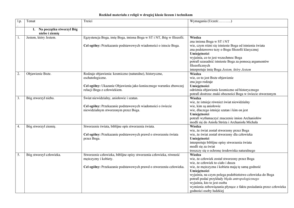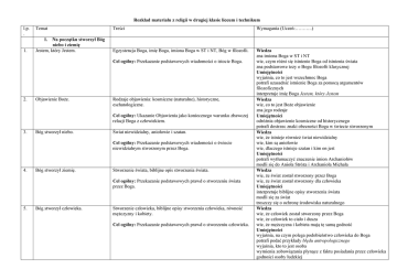 Rozkład materiału z religii w drugiej klasie liceum i technikum l.p. . 1. Temat Treści Wymagania (Uczeń:………..) 1. Na początku stworzył Bóg niebo i ziemię Jestem, który Jestem. Egzystencja Boga, imię Boga, imiona Boga w ST i NT, Bóg w filozofii. Wiedza zna imiona Boga w ST i NT wie, czym różni się istnienie Boga od istnienia świata zna podstawowe tezy o Bogu filozofii klasycznej Umiejętności wyjaśnia, co to jest wszechmoc Boga potrafi uzasadnić istnienie Boga za pomocą argumentów filozoficznych interpretuje imię Boga Jestem, który Jestem Wiedza wie, co to jest Boże objawienie zna jego rodzaje Umiejętności odróżnia objawienie kosmiczne od historycznego potrafi dostrzec znaki obecności Boga w świecie stworzonym Wiedza wie, że istnieje również świat niewidzialny wie, kim są aniołowie wie, dlaczego istnieje szatan i kim on jest Umiejętności potrafi wytłumaczyć znaczenie imion Archaniołów modli się do Anioła Stróża i Archanioła Michała Wiedza wie, że świat został stworzony przez Boga wie, że świat został stworzony dla człowieka Umiejętności interpretuje biblijne opisy stworzenia świata modli się za świat troszczy się o ochronę środowiska naturalnego Wiedza wie, że człowiek został stworzony przez Boga wie, że człowiek to ciało i dusza wie, że mężczyzna i kobieta mają tę samą godność Umiejętności wyjaśnia, na czym polega podobieństwo człowieka do Boga potrafi podać przykłady błędu antropologicznego wyjaśnia, kto to jest osoba wymienia zobowiązania płynące z faktu posiadania przez człowieka godności osoby ludzkiej Cel ogólny: Przekazanie podstawowych wiadomości o istocie Boga. 2. Objawienie Boże. Rodzaje objawienia: kosmiczne (naturalne), historyczne, eschatologiczne. Cel ogólny: Ukazanie Objawienia jako koniecznego warunku zbawczej relacji Boga z człowiekiem. 3. Bóg stworzył niebo. Świat niewidzialny, aniołowie i szatan. Cel ogólny: Przekazanie podstawowych wiadomości o świecie niewidzialnym stworzonym przez Boga. 4. Bóg stworzył ziemię. Stworzenie świata, biblijne opis stworzenia świata. Cel ogólny: Przekazanie podstawowych prawd o stworzeniu świata przez Boga. 5. Bóg stworzył człowieka. Stworzenie człowieka, biblijne opisy stworzenia człowieka, równość mężczyzny i kobiety. Cel ogólny: Przekazanie podstawowych prawd o stworzeniu człowieka. 6. Stworzenie świata a ewolucja. Teoria ewolucji, kreacjonizm, teoria inteligentnego projektu, teologia opisu stworzenia świata. Cel ogólny: Przekazanie podstawowych wiadomości w konfrontacji teorii ewolucji z prawdą o stworzeniu świata przez Boga. 7. Człowiek a religia. Określenie religii, wielość religii w świecie, człowiek – istota religijna. Cel ogólny: Przekazanie podstawowych wiadomości o religii i religijności. 8. Chrześcijaństwo a inne religie. Wielkie religie świata (charakterystyka), dialog międzyreligijny. Cel ogólny: Przekazanie podstawowych wiadomości o relacji chrześcijaństwa do innych religii. Wiedza wie, co to jest teoria ewolucji wie, co to jest kreacjonizm Umiejętności potrafi wyjaśnić teorię inteligentnego projektu pragnie poznawać prawdę o świecie i jego początku wyjaśnia, pod jakimi warunkami teoria ewolucji może być zaakceptowana przez Kościół Wiedza wie, czym jest religia wie, dlaczego na świecie jest wiele religii wie, jakie elementy tworzą strukturę religii Umiejętności wyjaśnia pojęcie religii rozumie, co to znaczy, że człowiek jest istotą religijną potrafi wyjaśnić, co daje człowiekowi religia Wiedza wie, jakie są największe religie na świecie wie, co to jest dialog międzyreligijny Umiejętności potrafi scharakteryzować cztery wielkie religie świata rozumie, że inne religie osiadają ,,ziarna prawdy” rozumie różnicę między ekumenizmem a dialogiem międzyreligijnym potrafi wyjaśnić, na jakich zasadach powinien opierać się dialog między religiami 2. Tak Bóg umiłował świat 9. Grzech pierworodny. Biblijny opis grzechu pierworodnego, teologia grzechu pierworodnego, skutki grzechu pierworodnego. Cel ogólny: Przekazanie podstawowych wiadomości o grzechu pierworodnym. 10. Bóg dawca życia. Życie jako dar, prawo do życia, świętość życia. Cel ogólny: Przekazanie podstawowych wiadomości o życiu jako darze od Boga. Wiedza zna biblijny opis grzechu pierworodnego wie, że istotą grzechu pierworodnego jest odwrócenie się człowieka od Boga wie, że sakrament chrztu gładzi grzech pierworodny Umiejętności potrafi wymienić skutki grzechu pierworodnego rozumie rozumie błędy generacjonizmu i nauki o preegzystencji dusz Wiedza wie, że życie ludzkie jest świętym darem Boga wie, że zaczyna się w chwili poczęcia wie, że Bóg jest jego absolutnym Panem Umiejętności 11. Nie zabijaj – aborcja i eutanazja. Aborcja, eutanazja. Cel ogólny: Przekazanie podstawowych wiadomości o aborcji i eutanazji. 12. Pokusa panowania nad życiem. Klonowanie, zapłodnienie in vitro, metody leczenia niepłodności. Cel ogólny: Przekazanie podstawowych wiadomości o moralnej ocenie klonowania i zapłodnienia in vitro. 13. Seksualność darem od Boga. Integracja seksualna, antykoncepcja, AIDS. Cel ogólny: Przekazanie podstawowych prawd o seksualności jako darze od Boga. 14. Bóg szuka człowieka. Przymierze w Starym Testamencie, trudności wiary. Cel ogólny: Przekazanie podstawowych wiadomości o Przymierzu w Starym Testamencie. 15. Chrystus - Emmanuel. Nowe Przymierze, odkupienie i zbawienie, Jezus i godność człowieka. Cel ogólny: Przekazanie podstawowych wiadomości o Nowym Przymierzu. potrafi wymienić, dlaczego prawdziwe życie jest w Bogu potrafi uzasadnić, że życie ludzkie jest święte potrafi uzasadnić, dlaczego każdy człowiek ma prawo do życia Wiedza wie, że aborcja i eutanazja są głęboko sprzeczne z prawem moralnym wie, jaką karę nakłada Kościół za aborcję wie, jakie są skutki aborcji dla kobiety Umiejętno