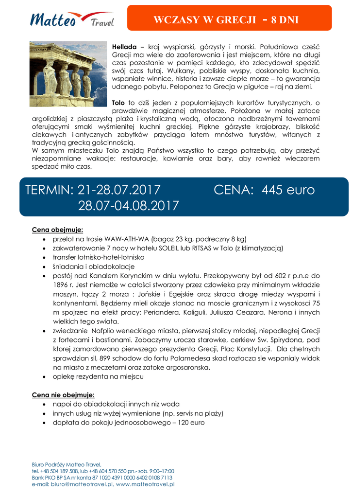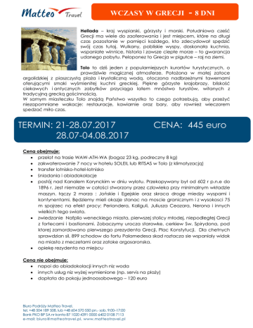 WCZASY W GRECJI - 8 DNI Hellada – kraj wyspiarski, górzysty i morski. Południowa cześć Grecji ma wiele do zaoferowania i jest miejscem, które na długi czas pozostanie w pamięci każdego, kto zdecydował spędzić swój czas tutaj. Wulkany, pobliskie wyspy, doskonała kuchnia, wspaniałe winnice, historia i zawsze ciepłe morze – to gwarancja udanego pobytu. Peloponez to Grecja w pigułce – raj na ziemi. Tolo to dziś jeden z popularniejszych kurortów turystycznych, o prawdziwie magicznej atmosferze. Położona w małej zatoce argolidzkiej z piaszczystą plaża i krystaliczną wodą, otoczona nadbrzeżnymi tawernami oferującymi smaki wyśmienitej kuchni greckiej. Piękne górzyste krajobrazy, bliskość ciekawych i antycznych zabytków przyciąga latem mnóstwo turystów, witanych z tradycyjną grecką gościnnością. W samym miasteczku Tolo znajdą Państwo wszystko to czego potrzebują, aby przeżyć niezapomniane wakacje: restauracje, kawiarnie oraz bary, aby rownież wieczorem spedzać miło czas. TERMIN: 21-28.07.2017 28.07-04.08.2017 CENA: 445 euro Cena obejmuje: przelot na trasie WAW-ATH-WA (bagaz 23 kg, podreczny 8 kg) zakwaterowanie 7 nocy w hotelu SOLEIL lub RITSAS w Tolo (z klimatyzacją) transfer lotnisko-hotel-lotnisko śniadania i obiadokolacje postój nad Kanalem Korynckim w dniu wylotu. Przekopywany był od 602 r p.n.e do 1896 r. Jest niemalże w całości stworzony przez czlowieka przy minimalnym wkładzie maszyn. łączy 2 morza : Jońskie i Egejskie oraz skraca drogę miedzy wyspami i kontynentami. Będziemy mieli okazje stanac na moscie granicznym i z wysokosci 75 m spojrzec na efekt pracy: Periandera, Kaliguli, Juliusza Ceazara, Nerona i innych wielkich tego swiata. zwiedzanie Nafplio weneckiego miasta, pierwszej stolicy młodej, niepodległej Grecji z fortecami i bastionami. Zobaczymy urocza starowke, cerkiew Sw. Spirydona, pod ktorej zamordowano pierwszego prezydenta Grecji, Plac Konstytucji. Dla chetnych sprawdzian sil, 899 schodow do fortu Palamedesa skad roztacza sie wspanialy widok na miasto z meczetami oraz zatoke argosaronska. opiekę rezydenta na miejscu Cena nie obejmuje: napoi do obiadokolacji innych niz woda innych uslug niz wyżej wymienione (np. servis na plaży) dopłata do pokoju jednoosobowego – 120 euro Biuro Podróży Matteo Travel, tel. +48 504 189 508, lub +48 604 570 550 pn.- sob. 9:00–17:00 Bank PKO BP SA nr konta 87 1020 4391 0000 6402 0108 7113 e-mail: [email protected], www.matteotravel.pl WCZASY W GRECJI - 8 DNI ZAKWATEROWANIE HOTELE 3* - WEDŁUG KLASYFIKACJI MIEJSCOWEJ HOTEL SOLEIL - TOLO PELOPONEZ http://www.hotelsoleil.gr Hotel Soleil położony jest w znanym kurorcie Tolo na Peloponezie, 60 metrów od plaży, która spogląda na wyspy zatoki saronskiej. Na miejscu do dyspozycji Gości znajduje sie odkryty basen otoczony palmami. Obiekt oferuje zakwaterowanie w klimatyzowanych pokojach z balkonem i widokiem na okolicę. Wszystkie pokoje w hotelu zapewniają bezpłatny bezprzewodowy dostęp do Internetu. W każdym z nich znajduje się telewizor i mała lodówka oraz suszarka do wlosów. Niektóre pokoje oferują widok na Morze Egejskie. Codziennie rano w hotelu serwowane jest śniadanie w formie bufetu, ktore można zjeść w restauracji hotelowej lub na tarasie przy basenie. Klimatyzacja w cenie. Posiłki: śniadania w formie bufetu, obiadokolacje: bufet sałatkowy, przystawka ciepła (typu leczo lub spagetti ect.) danie głowne mięsne lub rybne, woda, deser: owoc lub ciasto. HOTEL RITSAS – TOLO PELOPONEZ http://www.ritsashotel.gr/pegasus/h001/index.php?pcode=H001_INDEX&lang=EN Hotel Ritsas to rodzinnie prowadzony hotel z miłą i domową atmosferą. Położony jest w spokojnej dzielnicy Tolo a jednocześnie blisko centrum, które oferuje liczne bary tawerny oraz kawiarnie. Położony dokładnie 50 m od piaszczystej plaży”Hrisi Amo”, co znaczy złota plaża. Hotel oferuje swoim gościom komfortowy wypoczynek, miłą obsługę oraz dysponuje: basenem z dużym ogrodem, gdzie znajdują sie parasole i leżaki, tawerną, kawiarnią, barem przy basenie, WiFi, siłownią. Pokoje wyremontowane w 2015 roku, przestronne i gustownie urządzone wyposażone są w: balkon, łazienkę, suszarkę do włosów, klimatyzację, telefon, TV SAT, WiFi, lodówkę oraz sejf. Klimatyzacja w cenie. Posilki: śniadania w formie bufetu, obiadokolacje w formie bufetu. Biuro Podróży Matteo Travel, tel. +48 504 189 508, lub +48 604 570 550 pn.- sob. 9:00–17:00 Bank PKO BP SA nr konta 87 1020 4391 0000 6402 0108 7113 e-mail: [email protected], www.matteotravel.pl