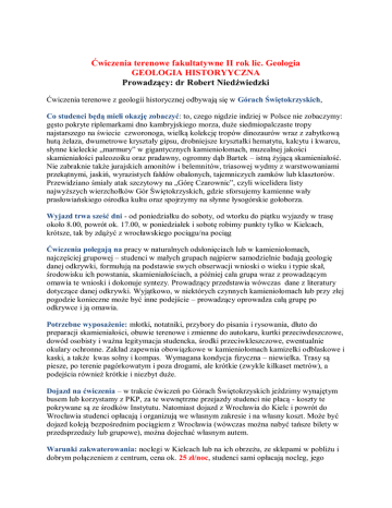 Ćwiczenia terenowe fakultatywne II rok lic. Geologia GEOLOGIA HISTORYYCZNA Prowadzący: dr Robert Niedźwiedzki Ćwiczenia terenowe z geologii historycznej odbywają się w Górach Świętokrzyskich, Co studenci będą mieli okazję zobaczyć: to, czego nigdzie indziej w Polsce nie zobaczymy: gęsto pokryte riplemarkami dno kambryjskiego morza, duże siedmiopalczaste tropy najstarszego na świecie czworonoga, wielką kolekcję tropów dinozaurów wraz z zabytkową hutą żelaza, dwumetrowe kryształy gipsu, drobniejsze kryształki hematytu, kalcytu i kwarcu, słynne kieleckie „marmury” w gigantycznych kamieniołomach, muzealnej jakości skamieniałości paleozoiku oraz pradawny, ogromny dąb Bartek – istną żyjącą skamieniałość. Nie zabraknie także jurajskich amonitów i belemnitów, triasowej wydmy z warstwowaniami przekątnymi, jaskiń, wyrazistych fałdów obalonych, tajemniczych zamków lub klasztorów. Przewidziano śmiały atak szczytowy na „Górę Czarownic”, czyli wicelidera listy najwyższych wierzchołków Gór Świętokrzyskich, gdzie sforsujemy kamienne wały prasłowiańskiego ośrodka kultu oraz spojrzymy na słynne łysogórskie gołoborza. Wyjazd trwa sześć dni - od poniedziałku do soboty, od wtorku do piątku wyjazdy w trasę około 8.00, powrót ok. 17.00, w poniedziałek i sobotę robimy punkty tylko w Kielcach, krótsze, tak by zdążyć z wrocławskiego pociągu/na pociąg Ćwiczenia polegają na pracy w naturalnych odsłonięciach lub w kamieniołomach, najczęściej grupowej – studenci w małych grupach najpierw samodzielnie badają geologię danej odkrywki, formułują na podstawie swych obserwacji wnioski o wieku i typie skał, środowisku ich powstania, skamieniałościach, a później cała grupa wraz z prowadzącym omawia te wnioski i dokonuje syntezy. Prowadzący przedstawia wówczas dane z literatury dotyczące danej odkrywki. Wyjątkowo, w niektórych czynnych kamieniołomach lub przy złej pogodzie konieczne może być inne podejście – prowadzący oprowadza całą grupę po odkrywce i ją omawia. Potrzebne wyposażenie: młotki, notatniki, przybory do pisania i rysowania, dłuto do preparacji skamieniałości, obuwie terenowe i zmienne do autokaru, kurtki przeciwdeszczowe, dowód osobisty i ważna legitymacja studencka, środki przeciwkleszczowe, ewentualnie okulary ochronne. Zakład zapewnia obowiązkowe w kamieniołomach kamizelki odblaskowe i kaski, a także kwas solny i kompas. Wymagana kondycja fizyczna – niewielka. Trasy są piesze, po terenie pagórkowatym i poza drogami, ale krótkie (zwykle kilkaset metrów), a podejścia również krótkie i niezbyt duże. Dojazd na ćwiczenia – w trakcie ćwiczeń po Górach Świętokrzyskich jeździmy wynajętym busem lub korzystamy z PKP, za te wewnętrzne przejazdy studenci nie płacą - koszty te pokrywane są ze środków Instytutu. Natomiast dojazd z Wrocławia do Kielc i powrót do Wrocławia studenci opłacają i organizują we własnym zakresie i na własny koszt. Może być dojazd koleją bezpośrednim pociągiem z Wrocławia (wówczas można nabyć tańsze bilety w przedsprzedaży lub grupowe), można dojechać własnym autem. Warunki zakwaterowania: noclegi w Kielcach lub na ich obrzeżu, ze sklepami w pobliżu i dobrym połączeniem z centrum, cena ok. 25 zł/noc, studenci sami opłacają nocleg, jego wyszukaniem i rezerwacją zajmuje się prowadzący ćwiczenia. Pokoje zwykle 3-4 osobowe, dostęp do wspólnej kuchni, łazienki wspólne, ale czyste i zadbane. Limity w grupach wyjazdów autokarowych - nie ma limitów