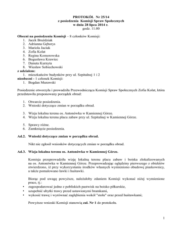 PROTOKÓŁ Nr 25/14 z posiedzenia Komisji Spraw Społecznych w dniu 28 lipca 2014 r. godz. 11.00 Obecni na posiedzeniu Komisji – 8 członków Komisji: 1. Jacek Bruździak 2. Adrianna Gęborys 3. Mariola Jaciuk 4. Zofia Kolat 5. Regina Komorowska 6. Bogusława Krawiec 7. Danuta Kurnyta 8. Wiesław Sobiechowski z udziałem: 1. mieszkańców budynków przy ul. Szpitalnej 1 i 2 nieobecni - 1 członek Komisji: 1. Bogdan Murawski Posiedzenie otworzyła i prowadziła Przewodnicząca Komisji Spraw Społecznych Zofia Kolat, która przedstawiła proponowany porządek obrad: 1. Otwarcie posiedzenia. 2. Wnioski dotyczące zmian w porządku obrad. 3. Wizja lokalna terenu os. Antonówka w Kamiennej Górze. 4. Wizja lokalna terenu placu zabaw przy ul. Szpitalnej w Kamiennej Górze. 5. Sprawy różne. 6. Zamknięcie posiedzenia. Ad.2. Wnioski dotyczące zmian w porządku obrad. Nikt nie zgłosił wniosków dotyczących zmian w porządku obrad. Ad.3. Wizja lokalna terenu os. Antonówka w Kamiennej Górze. Komisja przeprowadziła wizję lokalną terenu placu zabaw i boiska zlokalizowanych na os. Antonówka w Kamiennej Górze. Przeprowadzając oględziny pierwszego z obiektów stwierdzono, iż przy wykorzystaniu środków własnych wymieniono obudowę piaskownicy, a także pomalowano ławki i huśtawki. • • • Biorąc pod uwagę powyższe, należałoby zdaniem Komisji wykonać niżej wymienione prace, tj.: zagospodarować jedno z pobliskich pastwisk na boisko piłkarskie, uzupełnić ubytki trawy przed ustawionymi bramkami, wykosić trawę i wyrównać zagłębienia wokół "stołu" oraz przed huśtawkami; Powyższe wnioski Komisji stanowią zał. Nr 1 do protokołu. 1 Ad.4. Wizja lokalna terenu placu zabaw przy ul. Szpitalnej w Kamiennej Górze. Komisja przeprowadziła również wizję lokalną terenu placu zabaw przy ul. Szpitalnej w Kamiennej Górze. • • • Biorąc pod uwagę powyższe, należałoby zdaniem Komisji wykonać niżej wymienione prace, tj.: zakotwiczyć siatkę i uszczelnić plac zabaw, aby zapobiec wchodzeniu kotów, zabezpieczyć odpowiednio furtkę wejściową, zamontować kamienny stół do tenisa, w ramach posiadanych środków; Powyższe wnioski Komisji zostały ujęte w zał. Nr 1 do protokołu. Ad.5. Sprawy różne Komisja przeprowadziła także rozmowę z mieszkańcami budynków przy ul. Szpitalnej 1 i 2 dotyczącą problemu biegających szczurów w pobliżu budynków. Komisja zgłosiła wniosek o przeprowadzenie deratyzacji w/w terenu oraz przebudowę kanalizacji w celu usunięcia jednej z przyczyn występowania szczurów. Powyższy wniosek Komisji został ujęty w zał. Nr 1 do protokołu. Ad.6. Po wyczerpaniu porządku obrad posiedzenie Komisji zakończono. Protokołowała: Zofia Kolat Przewodnicząca KSS /-/ Zofia Kolat 2 Porządek obrad Komisji Spraw Społecznych w dniu 28 lipca 2014 r. godz. 11.00 1. Otwarcie posiedzenia. 2. Wnioski dotyczące zmian w porządku obrad. 3. Wizja lokalna terenu os. Antonówka w Kamiennej Górze. 4. Wizja lokalna terenu placu zabaw przy ul. Szpitalnej w Kamiennej Górze. 5. Sprawy różne. 6. Zamknięcie posiedzenia. 3