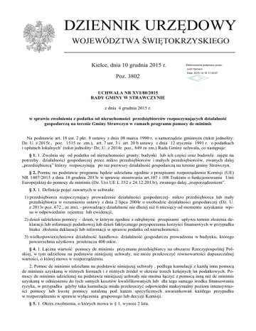 DZIENNIK URZĘDOWY WOJEWÓDZTWA ŚWIĘTOKRZYSKIEGO Kielce, dnia 10 grudnia 2015 r. Elektronicznie podpisany przez: Lech Hamera Poz. 3802 Data: 2015-12-10 11:30:07 UCHWAŁA NR XVI/80/2015 RADY GMINY W STRAWCZYNIE z dnia 4 grudnia 2015 r. w sprawie zwolnienia z podatku od nieruchomości przedsiębiorców rozpoczynających działalność gospodarczą na terenie Gminy Strawczyn w ramach programu pomocy de minimis Na podstawie art. 18 ust. 2 pkt. 8 ustawy z dnia 08 marca 1990 r. o samorządzie gminnym (tekst jednolity: Dz. U. z 2015r., poz. 1515 ze zm.), art. 7 ust. 3 i art. 20 b ustawy z dnia 12 stycznia 1991 r. o podatkach i opłatach lokalnych1 (tekst jednolity: Dz. U. z 2014r. poz., 849 ze zm.) Rada Gminy uchwala, co następuje: § 1. 1. Zwalnia się od podatku od nieruchomości grunty, budynki lub ich części oraz budowle zajęte na potrzeby działalności gospodarczej przez mikro przedsiębiorców i małych przedsiębiorców, zwanych dalej „przedsiębiorcą” którzy rozpoczynają po raz pierwszy działalność gospodarczą na terenie gminy Strawczyn. § 2. Pomoc na podstawie programu będzie udzielana zgodnie z przepisami rozporządzenia Komisji (UE) NR 1407/2013 z dnia 18 grudnia 2013r w sprawie stosowania art.107 i 108 Traktatu o funkcjonowaniu Unii Europejskiej do pomocy de minimis (Dz. Urz UE L 352 z 24.12.2013r), zwanego dalej „rozporządzeniem”. § 3. 1. Definicje pojęć zawartych w uchwale: 1) przedsiębiorca rozpoczynający prowadzenie działalności gospodarczej- mikro przedsiębiorca lub mały przedsiębiorca w rozumieniu ustawy z dnia 2 lipca 2004r o swobodzie działalności gospodarczej (Dz. U. z 2013r poz. 672 , ze zm), - prowadzący działalność nie dłużej niż 6 miesięcy od momentu uzyskania wpisu w odpowiednim rejestrze lub ewidencji; 2) dzień udzielenia pomocy – dzień, w którym zgodnie z odrębnymi przepisami upływa termin złożenia deklaracji lub informacji podatkowej lub dzień faktycznego przysporzenia korzyści finansowych w przypadku braku złożenia deklaracji lub informacji w sprawie podatku od nieruchomości; 3) wielkopowierzchniowa działalność handlowa- działalność gospodarcza prowadzona w budynku, którego powierzchnia użytkowa przekracza 400 mkw. § 4. 1. Łączna wartość pomocy de minimis przyznana przedsiębiorcy na obszarze Rzeczypospolitej Polskiej, w tym udzielona na podstawie niniejszej uchwały, nie może przekroczyć równowartości dopuszczalnej wartości, o której mowa w rozporządzeniu. 2. Pomoc de minimis udzielana na podstawie niniejszej uchwały , podlega kumulacji z każdą inna pomocą de minimis uzyskaną w różnych formach i z różnych źródeł w okresie trzech kolejnych lat podatkowych. Pomocy de minimis udzielonej na podstawie niniejszej uchwały nie można łączyć z pomocą inną niż de minimis uzyskaną w odniesieniu do tych samych kosztów kwalifikowanych lub dla tego samego środka finansowania ryzyka, w przypadku gdyby taka kumulacja miała przekroczyć odpowiedni maksymalny poziom intensywności pomocy lub kwotę pomocy ustaloną pod kątem specyficznych uwarunkowań każdego przypadku w rozporządzeniu w sprawie wyłączenia grupowego lub decyzji Komisji. § 5. 1. Okres zwolnienia, o których mowa w § 1, wynosi 2 lata. Dziennik Urzędowy Województwa Świętokrzyskiego –2– Poz. 3802 2. Zwolnienie przyznawane jest na wniosek podatnika. 3. Wnioski o udzielenie zwolnienia przedsiębiorcy mogą składać do dnia 30 czerwca 2021r. 4. Zwolnienie określone w ust. 1 przysługuje od pierwszego dnia miesiąca następującego po miesiącu, w którym Wójt Gminy Strawczyn potwierdzi spełnienie przez przedsiębiorcę warunków do uzyskania zwolnienia, a w przypadku wybudowania nowego budynku lub budowli zwolnienie przysługuje od 1 stycznia roku następującego po roku, w którym Wójt Gminy Strawczyn potwierdzi spełnienie przez przedsiębiorcę warunków do uzyskania zwolnienia i , w którym budowa została zakończona albo, w którym rozpoczęto użytkowanie budynku. 5. Podmiot ubiegający się o zwolnienie winien dołączyć do wniosku: 1) tytuł prawny do nieruchomości, 2) pozwolenie na użytkowanie budynku lub budowli, 3) wypis z KRS lub wypis z Centralnej Ewidencji i Informacji o Działalności Gospodarczej( CEIDG), 4) informacje i zaświadczenia, o których mowa w art. 37 ust. 1 ustawy z dnia 30 kwietnia 2004r o postępowaniu w sprawach dotyczących pomocy publicznej (Dz. U z 2007r Nr 59, poz. 404, ze zm) tj.: a) wszystkie zaświadczenia o pomocy de minimis, jakie otrzymał w roku, w którym ubiega się o pomoc oraz w ciągu 2 poprzedzających go lat albo oświadczenie o wielkości pomocy de minimis otrzymanej w tym okresie, albo oświadczenie o nieotrzymaniu takiej pomocy w tym okresie, jak również wszystkie zaświadczenia/oświadczenia o pomocy de minimis w rolnictwie i rybołówstwie ,jakie otrzymał w roku, w którym ubiega się o pomoc, oraz w ciągu 2 poprzedzających go lat, albo oświadczenie o nieotrzymaniu takiej pomocy w tym okresie, b) informacje niezbędne do udzielenia pomocy de minimis, dotyczące w szczególności wnioskodawcy i prowadzonej przez niego działalności oraz wielkości i przeznaczenia pomocy publicznej otrzymanej w odniesieniu do tych samych kosztów kwalifikujących się do objęcia pomocą, na pokrycie których ma być przeznaczona pomoc de minimis - na formularzu stanowiącym załącznik do rozporządzenia Rady Ministrów z dnia 29 marca 2010r w sprawie zakresu informacji przedstawianych przez podmiot ubiegający się o pomoc de minimis (Dz. U. z 2010 Nr 53, poz. 311, ze zm), 5) oświadczenie, zawierające zobowiązanie do prowadzenia działalności gospodarczej w nieruchomości objętej zwolnieniem przez cały okres jego trwania oraz, że nieruchomość, ani żadna jej część, nie będzie w tym okresie wynajęta, wydzierżawiona, zbyta lub oddana w użytkowanie na podstawie jakiegokolwiek innego tytułu na rzecz innego podmiotu, 6) oświadczenie w przedmi