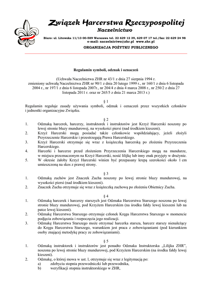 Naczelnictwo Biuro: ul. Litewska 11/13 00-589 Warszawa tel. 22 629 12 39, 629 07 17 tel./fax: 22 629 24 98 e-mail: [email protected] www.zhr.pl ORGANIZACJA POŻYTKU PUBLICZNEGO Regulamin symboli, odznak i oznaczeń (Uchwała Naczelnictwa ZHR nr 43/1 z dnia 27 sierpnia 1994 r. zmieniony uchwałą Naczelnictwa ZHR nr 90/1 z dnia 20 lutego 1999 r., nr 160/1 z dnia 6 listopada 2004 r., nr 197/1 z dnia 6 listopada 2007r., nr 204/4 z dnia 4 marca 2008 r., nr 250/2 z dnia 27 listopada 2011 r. oraz nr 265/5 z dnia 21 marca 2013 r.) §1 Regulamin reguluje zasady używania symboli, odznak i oznaczeń przez wszystkich członków i jednostki organizacyjne Związku. 1. 2. 3. 4. 5. 1. 2. 1. 2. 3. 1. 2. §2 Odznaką harcerek, harcerzy, instruktorek i instruktorów jest Krzyż Harcerski noszony po lewej stronie bluzy mundurowej, na wysokości piersi (nad środkiem kieszeni). Krzyż Harcerski mogą posiadać także członkowie współdziałający, jeżeli złożyli Przyrzeczenie Harcerskie i przestrzegają Prawa Harcerskiego. Krzyż Harcerski otrzymuje się wraz z książeczką harcerską po złożeniu Przyrzeczenia Harcerskiego. Harcerki i harcerze przed złożeniem Przyrzeczenia Harcerskiego mogą na mundurze, w miejscu przeznaczonym na Krzyż Harcerski, nosić lilijkę lub inny znak przyjęty w drużynie. W okresie żałoby Krzyż Harcerski winien być przepasany krepą szerokości około 1 cm umieszczoną na skos z prawej strony. §3 Odznaką zuchów jest Znaczek Zucha noszony po lewej stronie bluzy mundurowej, na wysokości piersi (nad środkiem kieszeni). Znaczek Zucha otrzymuje się wraz z książeczką zuchową po złożeniu Obietnicy Zucha. §4 Odznaką harcerek i harcerzy starszych jest Odznaka Harcerstwa Starszego noszona po lewej stronie bluzy mundurowej, pod Krzyżem Harcerskim (na środku fałdy lewej kieszeni lub na patce lewej kieszeni). Odznakę Harcerstwa Starszego otrzymuje członek Kręgu Harcerstwa Starszego w momencie podjęcia zobowiązania i rozpoczęcia jego realizacji. Odznakę Harcerstwa Starszego może otrzymać harcerka starsza, harcerz starszy nienależący do Kręgu Harcerstwa Starszego, warunkiem jest praca z zobowiązaniami (pod kierunkiem osoby znającej metodykę pracy ze zobowiązaniami). §5 Odznaką instruktorek i instruktorów jest ponadto Odznaka Instruktorska „Lilijka ZHR”, noszona po lewej stronie bluzy mundurowej, pod Krzyżem Harcerskim (na środku fałdy lewej kieszeni). Odznakę, o której mowa w ust. l, otrzymuje się wraz z legitymacją po: a) zdobyciu stopnia przewodniczki lub przewodnika, b) weryfikacji stopnia instruktorskiego w ZHR, c) 1. 2. otrzymaniu stopnia honorowego „Działacz Harcerski”. §6 Odznaką członków współdziałających jest Odznaka „Przyjaciel ZHR”. Odznakę, o której mowa w ust. l, otrzymuje się wraz z legitymacją po wstąpieniu do Koła Przyjaciół Harcerstwa albo rejestracji przy jednostce organizacyjnej ZHR. § 61 1. 2. 1. 2. 1. 2. Odznaczeniem przyznawanym za wybitne osiągnięcia na rzecz Związku Harcerstwa Rzeczypospolitej jest Krzyż Honorowy ZHR. Zasady przyznawania oraz noszenia Krzyża Honorowego ZHR, a także wzór Krzyża Honorowego ZHR i legitymacji, określa odrębny regulamin. §7 Odznaki, o których mowa w § 2 ust. 1-3 oraz w § 5, albo ich miniaturki, można nosić także na ubraniu cywilnym na lewej piersi, przy czym nie zaleca się stosowania obu tych odznak jednocześnie. Wzory odznak i legitymacji, o których mowa w § 2 ust. 1-3, § 3, § 4, § 5, § 6, a także zasady ich dystrybucji i rejestracji określi Naczelnictwo ZHR w formie instrukcji. §8 Oznaczeniem przynależności do Związku Harcerstwa Rzeczypospolitej jest czarny napis „ZHR” na biało-czerwonym tle noszony po prawej stronie bluzy mundurowej na wysokości piersi (nad kieszenią), którego wzór określa załącznik do niniejszego regulaminu. Uprawnionymi do używania oznaczenia, o którym mowa w ust. l, są wszyscy członkowie Związku, którym na podstawie odrębnych przepisów przysługuje prawo używania munduru organizacyjnego. §9 Związek używa tradycyjnego hymnu harcerskiego „Wszystko, co nasze Polsce oddamy”, którego treść i linię melodyczną określa załącznik do niniejszego regulaminu. § 10 Oznaką przynależności do wspólnoty skautowej, noszoną na przedniej części nakrycia głowy, jest: a) dla harcerek i instruktorek - tradycyjna lilijka lub koniczynka, b) dla harcerzy i instruktorów - tradycyjna lilijka. § 11 Oznaczenia stopni harcerek i harcerzy znajdują się na Krzyżu Harcerskim: a) ochotniczka/młodzik - krzyż oksydowany, b) tropicielka, starsza tropicielka/wywiadowca - krzyż ze srebrną lilijka, c) samarytanka, starsza samarytanka/ćwik - krzyż ze złotą lilijka, d) wędrowniczka, starsza wędrowniczka/Harcerz Orli - krzyż ze złotą lilijka i złotym kręgiem, e) Harcerka Rzeczypospolitej, Harcerz Rzeczypospolitej - krzyż ze złotą lilijka, złotym kręgiem i złotym wieńcem. 1. 2. § 12 Oznaczeniami stopni instruktorek i instruktorów są podkładki pod Krzyżem Harcerskim: a) przewodniczka/przewodnik - podkładka w kolorze granatowym, b) podharcmistrzyni/podharcmistrz - podkładka w kolorze zielonym, c) harcmistrzyni/harcmistrz - podkładka w kolorze czerwonym. Podkładki pod Krzyżem Harcerskim oznaczają ponadto: a) b) stopień honorowy „Działacz Harcerski” - podkładka w kolorze brązowym, kapelana harcerskiego, który nie posiada stopnia instruktorskiego - podkładka w kolorze fioletowym. § 13 Oznaczenia sprawności harcerek i harcerzy umieszcza się na prawym rękawie bluzy mundurowej, powyżej łokcia. 1. 2. 3. § 14 Funkcje pełnione w Związku oznaczane są przy pomocy sznurów funkcyjnych. Funkcje pełnione w Organizacji Harcerek albo Organizacji Harcerzy oznacza się w następujący sposób: a) w drużynie: - zastępowa, zastępowy - sznur brązowy noszony spod ramienia, - przyboczna, przyboczny - sznur zielony noszony spod ramienia, - drużynowa, drużynowy - sz