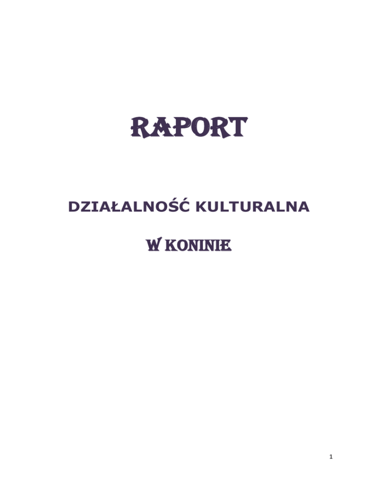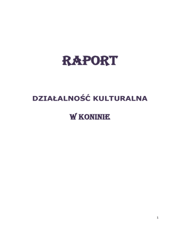 Raport DZIAŁALNOŚĆ KULTURALNA w koninie 1 CENTRUM KULTURY i SZTUKI Adres: CKiS - "Centrum" ul.Okólna 47a 62-510 Konin Opis CKiS jest Instytucją Samorządu Województwa Wielkopolskiego. Jest firma organizującą imprezy o zasięgu ogólnopolskim: Ogólnopolski Konkurs Filmów Amatorskich OKFA, o zasięgu wielkopolskim -Wielkopolskie Konfrontacje Chórów w Kole, Wielkopolski Konkurs na Monodram w Kleczewie oraz o zasięgu lokalnym Przegląd Dziecięcych i Młodzieżowych Zespołów Tanecznych, Przegląd Zespołów Ludowych. Firma współpracowała z Michałem Bajorem, Renatą Przemek, Mariuszem lubomskim, Iwoną Loranc, Andre Ochodlo, Mirosławem Czyżykiewiczem. Formy działalności: Centrum Kultury i Sztuki (wrzesień-listopad 2014r.) Forma działalności kulturalnej: koncerty Repertuar -Koncert Emanations Quartet (Akademia Gitary: festiwal), -Koncert Stanisława Soyki w ramach wydarzenia „Głosy dla hospicjów”, -Lekcje z filharmonią - „po prostu… Muzyka” (przeboje muzyki klasycznej), spotkania miłośników poezji i literatury spektakle teatralne -Czytanie nocą (Noc Kultury), -Teatr Dramatyczny GOK Brzeźno „Intryga” (Noc Kultury), -Przegląd Małych Form Teatralnych (Kazimierz Biskupi), Źródło informacji wywiad z: Danutą Pydyńską (kierownikiem Działu ArtystycznoOrganizacyjnego) Danutą Pydyńską, Pauliną Pachulską (instruktorem) Krystyną Mikołajczak (instruktorem) internet -Wędrowny Teatr Lalkowy Akademii Wyobraźni („O Stachu i Strachu” oraz „O Ignasiu, który nie lubił szkoły”, 2 wystawy - Grand Press Photo 2014, -„W poszukiwaniu fotografii”(Noc Kultury) -„Moje miasto po zmroku” – wystawa fotograficzna, -„Valahia. Całość z fragmentów”(Rumuńska Wołoszczyzna), -Wystawa fotografii „U trepiorza – dokumentacja projektu” w ramach projektu „U trepiorza – portrety ginących zawodów”, - wernisaż malarstwa Tadeusza Wieczorka, dokumentalny - film etnograficzny – „U trepiorza – portrety ginących zawodów” , najważniejsze wydarzenia kulturalne w roku 2013-14 m.in.: - Noc Kultury (19-20IX 2014), - VI Festiwal Kultur Regionów Europy – Rumuńska Wołoszczyzna (wystawa, spektakl, pokazy filmowe i warsztaty), - Kronika Nowej Sztuki, - Ogólnopolski Festiwal Filmów Niezależnych im. Prof. Henryka Kluby OKFA CKiS - GALERIA SZTUKI "WIEŻA CIŚNIEŃ" Adres ul. Kolejowa 1a 62-510 Konin Opis Kolejowa wieża ciśnień została wybudowana w 1924r, była pierwszą konińską kolejową wieżą wodną . Znajduje się w niej galeria sztuki współczesnej „Wieża ciśnień”. Największa sala wystawowa mieści się po dwóch wyciętych zbiornikach wodnych. Galeria Sztuki w Koninie została utworzona w 1977 roku jako "Biuro Wystaw Artystycznych". W 1994 została połączona z ówczesnym Wojewódzkim Ośrodkiem Kultury. Po reformie administracyjnej instytucję tę nazwano Centrum Kultury i Sztuki, a działającą w jej ramach galerię - Galerią Sztuki Współczesnej "Wieżą Ciśnień". Galeria zajmuje się popularyzacją sztuki współczesnej w miejscowym środowisku) poprzez realizację wystaw i innych projektów artystycznych, organizację wykładów, zajęć i warsztatów artystycznych dla zainteresowanych. W Galerii prezentują się artyści różnych kierunków i tendencji współczesnej sztuki, ze szczególnym uwzględnieniem prezentacji indywidualności artystycznych. 3 W galerii pojawiają się artyści początkujący jak i o uznanej renomie artystycznej, uprawiający różne sztuki, np. malarstwo, rzeźbę, grafikę, sztuki multimedialne. W ostatnich latach w "Wieży Ciśnień" gościli m.in.: Izabella Gustowska, Jan Tarasin, Jan Berdyszak, Marcin Berdyszak, Kiejstut Bereźnicki, Andrzej Dudek-Duerer, Henryk Musiałowicz, Aleksandra Mańczak. Formy działalności: CKiS - Galeria Sztuki Współczesnej "Wieża Ciśnień" (wrzesień-listopad 2014r.) Forma działalności kulturalnej: Repertuar Źródło informacji wystawy -wystawa malarstwa Stefana Rusina, -Grand Press Photo 2014, - Wernisaż „Fotografowie wielkopolscy”, - wystawa Andrzeja Leśnika „Kod Pamięci”, inne projekty artystyczne - Czytanie Nocą (Noc Kultury), internet -Kronika Nowej Sztuki to cykl 6 spotkań prowadzonych przez historyka sztuki Karolinę Leśnik, - Warsztaty filmu dokumentalnego, - Wartostrada Filmowa (pokazów krótkiego kina połączonych z panelami dyskusyjnymi: Ponton królowej, Raz na wodzie, raz pod wodą ), - Warsztaty recytatorskie, najważniejsze wydarzenia kulturalne w roku 2013-14 m.in.: wywiad z Robertem Brzęckim (kuratorem) Grand Press Photo 2014, 4 CKiS – DK i KINO OSKARD Adres Aleja 1 Maja 7a, 62-508 Konin Opis DK Oskard oferuje: - seanse filmowe - spektakle - koncerty - inne wydarzenia Projekty specjalne: -Kino Konesera. Filmy niszowe dzieła z niebanalną fabułą , mające na celu wzbogacić widza o nowe wartości, przeżycia i walory wizualne. -Konin Miast Kobiet. Oskard jest pomysłodawcą i koordynatorem projektu. To ponad trzydzieści różnorodnych wydarzeń, które powstały z myślą o kobietach i dla kobiet: koncerty, spektakle, wystawy, warsztaty, kulinaria, pokazy, moda i kino. -Dyskusyjny Klub Książki. Inicjatywa skierowana jest do wszystkich lubiących czytać i rozmawiać o literaturze. Organizowane są spotkania autorskie. -Jazz Festiwal „Jazzonalia”. To festiwal o kilkunastoletniej, bogatej tradycji, tworzony z dużym rozmachem organizacyjnym i interesującym programem. Łączy jazzową klasykę z improwizowaną muzyką młodego jazzowego pokolenia. Organizowane są warsztaty jazzowe z udziałem wybitnym jazzmanów, zakończone koncertem. Goszczono takich wykonawców jak Michał Urbaniak, Urszula Dudziak, Grażyna Auguścik, Tomasz Stańko, Lora Szafran, Leszek Możdżer, Henryk Miśkiewicz, Jarek Śmietana, Marek Napiórkowski, Włodzimierz Nahorny i wielu innych, znakomitych artystów. -Międzynarodowy Festiwal Blusowy „Blusonalia”. Przegląd tego, co w polskim bluesie ciekawe i tw