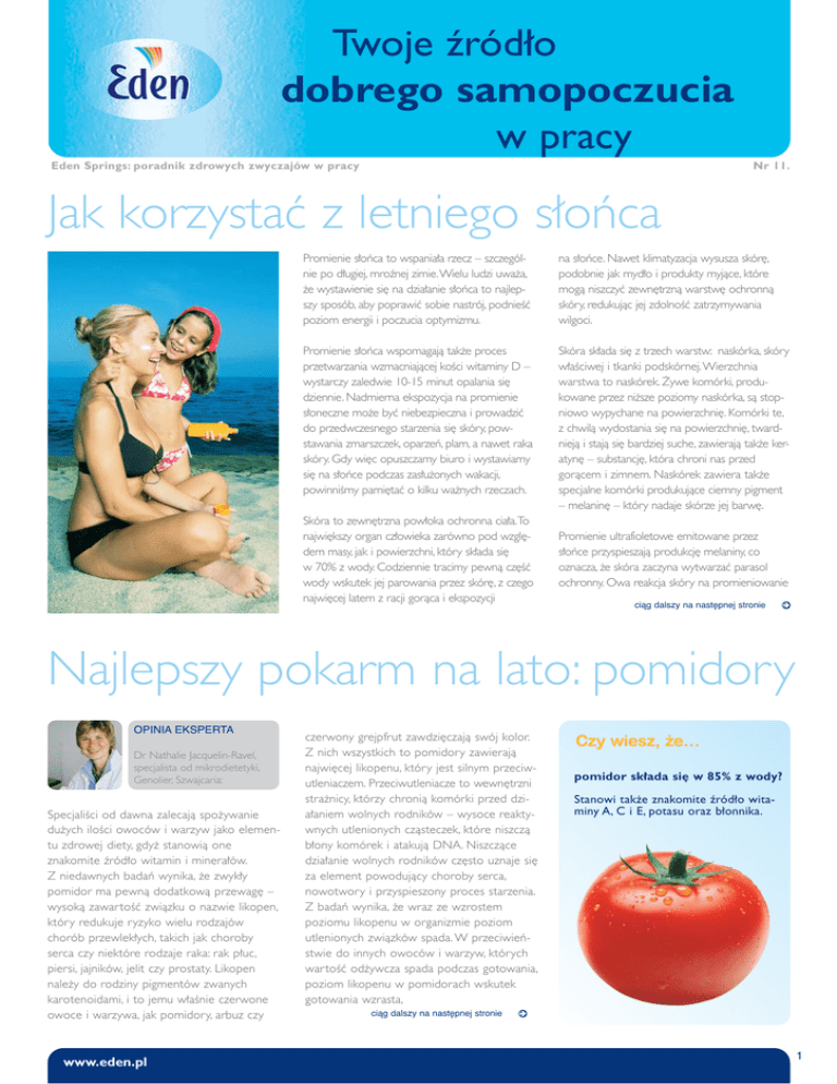 Twoje źródło dobrego samopoczucia w pracy Eden Springs: poradnik zdrowych zwyczajów w pracy Nr 11. Jak korzystać z letniego słońca Promienie słońca to wspaniała rzecz – szczególnie po długiej, mroźnej zimie. Wielu ludzi uważa, że wystawienie się na działanie słońca to najlepszy sposób, aby poprawić sobie nastrój, podnieść poziom energii i poczucia optymizmu. na słońce. Nawet klimatyzacja wysusza skórę, podobnie jak mydło i produkty myjące, które mogą niszczyć zewnętrzną warstwę ochronną skóry, redukując jej zdolność zatrzymywania wilgoci. Promienie słońca wspomagają także proces przetwarzania wzmacniającej kości witaminy D – wystarczy zaledwie 10-15 minut opalania się dziennie. Nadmierna ekspozycja na promienie słoneczne może być niebezpieczna i prowadzić do przedwczesnego starzenia się skóry, powstawania zmarszczek, oparzeń, plam, a nawet raka skóry. Gdy więc opuszczamy biuro i wystawiamy się na słońce podczas zasłużonych wakacji, powinniśmy pamiętać o kilku ważnych rzeczach. Skóra składa się z trzech warstw: naskórka, skóry właściwej i tkanki podskórnej. Wierzchnia warstwa to naskórek. Żywe komórki, produkowane przez niższe poziomy naskórka, są stopniowo wypychane na powierzchnię. Komórki te, z chwilą wydostania się na powierzchnię, twardnieją i stają się bardziej suche, zawierają także keratynę – substancję, która chroni nas przed gorącem i zimnem. Naskórek zawiera także specjalne komórki produkujące ciemny pigment – melaninę – który nadaje skórze jej barwę. Skóra to zewnętrzna powłoka ochronna ciała. To największy organ człowieka zarówno pod względem masy, jak i powierzchni, który składa się w 70% z wody. Codziennie tracimy pewną część wody wskutek jej parowania przez skórę, z czego najwięcej latem z racji gorąca i ekspozycji Promienie ultrafioletowe emitowane przez słońce przyspieszają produkcję melaniny, co oznacza, że skóra zaczyna wytwarzać parasol ochronny. Owa reakcja skóry na promieniowanie ciąg dalszy na następnej stronie Najlepszy pokarm na lato: pomidory OPINIA EKSPERTA Dr Nathalie Jacquelin-Ravel, specjalista od mikrodietetyki, Genolier, Szwajcaria: Specjaliści od dawna zalecają spożywanie dużych ilości owoców i warzyw jako elementu zdrowej diety, gdyż stanowią one znakomite źródło witamin i minerałów. Z niedawnych badań wynika, że zwykły pomidor ma pewną dodatkową przewagę – wysoką zawartość związku o nazwie likopen, który redukuje ryzyko wielu rodzajów chorób przewlekłych, takich jak choroby serca czy niektóre rodzaje raka: rak płuc, piersi, jajników, jelit czy prostaty. Likopen należy do rodziny pigmentów zwanych karotenoidami, i to jemu właśnie czerwone owoce i warzywa, jak pomidory, arbuz czy www.eden.pl czerwony grejpfrut zawdzięczają swój kolor. Z nich wszystkich to pomidory zawierają najwięcej likopenu, który jest silnym przeciwutleniaczem. Przeciwutleniacze to wewnętrzni strażnicy, którzy chronią komórki przed działaniem wolnych rodników – wysoce reaktywnych utlenionych cząsteczek, które niszczą błony komórek i atakują DNA. Niszczące działanie wolnych rodników często uznaje się za element powodujący choroby serca, nowotwory i przyspieszony proces starzenia. Z badań wynika, że wraz ze wzrostem poziomu likopenu w organizmie poziom utlenionych związków spada. W przeciwieństwie do innych owoców i warzyw, których wartość odżywcza spada podczas gotowania, poziom likopenu w pomidorach wskutek gotowania wzrasta, Czy wiesz, ˝e… pomidor składa się w 85% z wody? Stanowi także znakomite źródło witaminy A, C i E, potasu oraz błonnika. ciąg dalszy na następnej stronie 1 Twoje źródło dobrego samopoczucia w pracy Eden Springs: poradnik zdrowych zwyczajów w pracy Jak korzystać z letniego słońca z poprzedniej strony UV to właśnie opalenizna. Na tym jednak kończy się własna ochrona skóry. Ilość melaniny produkowana przez daną osobę jest uwarunkowana genetycznie, dlatego spotyka się tak wiele różnych karnacji. U wielu osób z jasną karnacją wytwarzany poziom melaniny jest zbyt niski, aby wystarczająco dobrze chronić skórę. Promienie UV prowadzą do bolesnych oparzeń, zaczerwienień i czasami również stanów zapalnych – nawet u osób o ciemnej karnacji. Innymi słowy, opalenizna to wskaźnik zniszczenia skóry przez słońce. Łatwość oparzeń zależy od rodzaju skóry oraz jej karnacji. U ludzi o jasnej karnacji z większym 7 porad na lato Wszyscy doskonale wiemy, że należy chronić skórę przed szkodliwym działaniem promieni UV. Naturalnie trudno całkowicie unikać promieni słonecznych, nie mówiąc już o tym, że po prostu nie chcemy chować się w mieszkaniu, kiedy na zewnątrz jest piękna pogoda. Wolimy wybrać się na plażę, popracować w ogródku lub jeszcze w inny sposób spędzać czas na świeżym powietrzu. Na te okazje radzimy zastosować się do kilku rozsądnych reguł: • Lepiej unikać słońca między godziną 10 a 16, ponieważ w tym czasie jego promieniotwórcze działanie jest najsilniejsze. Lepiej zatem tak zaplanować dzień, aby czas spędzony na słońcu przypadł na inne pory. W przeciwnym razie pamiętajmy o chowaniu się w cieniu, nakryciu głowy i postarajmy się skrócić czas spędzany na zewnątrz. • Podczas opalania, stosuj regularnie krem z filtrem UV. Najlepiej posmarować skórę już na 30 minut przed wyjściem na słońce, a następnie powtarzać czynność co dwie godziny. Jeśli dodatkowo kąpiemy się morzu czy basenie używajmy kremów za każdym razem po wyschnięciu, ponieważ nawet wodoodporne kremy w pewnym stopniu zmywają się. Zwłaszcza nad wodą, która odbija promienie UV, należy prawdopodobieństwem dojdzie do oparzeń niż u osób o ciemniejszej karnacji. Dzieje się tak dlatego, że osoby o ciemniejszej karnacji posiadają więcej melaniny, która umożliwia ochro