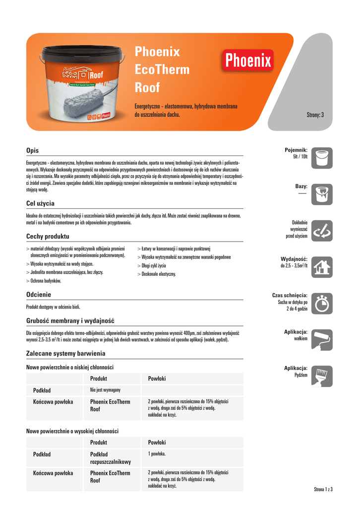 Phoenix EcoTherm Roof Energetyczno - elastomerowa, hybrydowa membrana do uszczelniania dachu. Opis Energetyczno - elastomeryczna, hybrydowa membrana do uszczelniania dachu, oparta na nowej technologii żywic akrylowych i poliuretanowych. Wykazuje doskonałą przyczepność na odpowiednio przygotowanych powierzchniach i dostosowuje się do ich ruchów skurczania się i rozszerzania. Ma wysokie parametry odbijalności ciepła, przez co przyczynia się do utrzymania odpowiedniej temperatury i oszczędności źródeł energii. Zawiera specjalne dodatki, które zapobiegają rozwojowi mikroorganizmów na membranie i wykazuje wytrzymałość na stojącą wodę. Strony: 3 Pojemnik: 5lt / 10lt Bazy: - Cel użycia Idealna do ostatecznej hydroizolacji i uszczelniania takich powierzchni jak dachy, złącza itd. Może zostać również zaaplikowana na drewno, metal i na budynki cementowe po ich odpowiednim przygotowaniu. Cechy produktu > materiał chłodzący (wysoki współczynnik odbijania promieni słonecznych emisyjności w promieniowaniu podczerwonym). > Łatwy w konserwacji i naprawie punktowej > Wysoka wytrzymałość na wody stojące. > Długi cykl życia > Jednolita membrana uszczelniająca, bez złączy. > Ochrona budynków. > Wysoka wytrzymałość na zewnętrzne warunki pogodowe Dokładnie wymieszać przed użyciem Wydajność: do 2,5 - 3,5m2/lt > Doskonale elastyczny. Odcienie Czas schnięcia: Sucha w dotyku po 2 do 4 godzin Produkt dostępny w odcieniu bieli. Grubość membrany i wydajność Dla osiągnięcia dobrego efektu termo-odbijalności, odpowiednia grubość warstwy powinna wynosić 400μm, zaś założeniowa wydajność wynosi 2,5-3,5 m2/lt i może zostać osiągnięta w jednej lub dwóch warstwach, w zależności od sposobu aplikacji (wałek, pędzel). Aplikacja: wałkiem Zalecane systemy barwienia Nowe powierzchnie o niskiej chłonności Produkt Podkład Nie jest wymagany Końcowa powłoka Phoenix EcoTherm Roof Powłoki Aplikacja: Pędzlem 2 powłoki, pierwsza rozcieńczona do 15% objętości z wodą, druga zaś do 5% objętości z wodą. nakładać na krzyż. Nowe powierzchnie o wysokiej chłonności Produkt Powłoki Podkład Podkład rozpuszczalnikowy 1 powłoka. Końcowa powłoka Phoenix EcoTherm Roof 2 powłoki, pierwsza rozcieńczona do 15% objętości z wodą, druga zaś do 5% objętości z wodą. nakładać na krzyż. Strona 1 z 3 Pojemnik: 5lt / 10lt Stare powierzchni Należy uprzednio przygotować powierzchnię zgodnie z instrukcją. Produkt Powłoki Podkład Podkład rozpuszczalnikowy 1 powłoka. Końcowa powłoka Phoenix EcoTherm Roof 2 powłoki, pierwsza rozcieńczona do 15% objętości z wodą, druga zaś do 5% objętości z wodą. nakładać na krzyż. Warunki aplikacji Bazy: - Dokładnie wymieszać przed użyciem Aplikować w temperaturze od 100C do 350C przy względnej do 70%. Wydajność: do 2,5 - 3,5m2/lt Instrukcje aplikacji Aplikować pędzlem lub wałkiem w temperaturze od 100C do 350C, przy względnej wilgotności do 70%. Nie aplikować na mokre powierzchnie lub jeśli występuje ryzyko opadów deszczu przez kolejne 48 godzin. Przygotowanie powierzchni Powierzchnia powinna być sucha i pozbawiona ubytków i obcych materiałów. Powierzchnia powinna być sucha i pozbawiona substancji sypkich i obcych materiałów. W przypadku starych powierzchni należy je dokładnie oczyścić z obcych materiałów (asfalt, pleśń, kurz, powłoki cementowe, substancje sypkie). Jeśli stara powierzchnia posiada kilkuletnią powłokę lub poliuretan, aplikację należy poprzedzić starciem powłoki papierem ściernym i kontrolą stabilizacji. Jeśli podłoże zawiera asfalt lub bitumen, z kruszcem lub bez, wymagane jest gruntowanie gruntem rozpuszczalnikowym, rozcieńczonym w proporcji 50% objętości z benzyną lakową. Następnie można zaaplikować Phoenix EcoTherm Roof. Czas schnięcia: Sucha w dotyku po 2 do 4 godzin Aplikacja: wałkiem Parametry techniczne Ciężar właściwy Lepkość pH Wydajność 1,30 ± 0,02 gr/cm3 (ISO 2811). 130 - 135 K.U. (ASTM D562). 8,1 ± 0,2. 1,5 m2/lt, dla dwóch warstw (400μm). Odporność na wydłużanie > 300% (ASTM D2370-98). Wytrzymałość na rozciąganie 3,5 MPa (ASTM D2370-98). Odporność ogniowa Współczynnik odbicia Promieniowania Emisyjność w podczerwieni Schnięcie Nakładanie kolejnej warstwy Aplikacja: Pędzlem Klasa E (EN ISO 11 925-2). 87% (ASTM E 903-96, ASTM G 159-98). 0,83 (ASTM E 408-71). Suche w dotyku po 2-4 godzinach w zależności od warunków. Dogłębnie suche po 48 godzinach (Czas schnięcia może się wydłużyć w zależności od warunków pogodowych i wilgotności). Po 12 godzinach w zależności od warunków pogodowych. (Czas nałożenia kolejnej warstwy może się wydłużyć w zależności od temperatury i wilgotności). Rozpuszczalnik Woda. Rozcieńczanie Rozcieńczać z wodą w proporcji 10-15% objętości. Strona 2 z 3 Właściwości certyfikacyjne jako ciało chłodne Pojemnik: 5lt / 10lt - Odbijanie promieniowania słonecznego (Solar Reflectance) = 0,87 (ASTM E 903-96, ASTM G 159-98). - Współczynnik emisyjności w promieniowaniu podczerwonym (e) = 0,83 [ASTM E 408-71 (2002)]. - Wskaźnik odbijania promieniowania słonecznego (Solar Reflectance) = 109 (ASTM E 1980-01). Zgodnie z 2004/42/EC Faza II, podkategoria c, ściany zewnętrzne z mineralnym podłożem, wartość graniczna LZO = 40gr/lt, Maksymalna zawartość LZO = 40gr/lt (rozcieńczona, gotowa do użytku), Rozcieńczanie: z wodą, do 15% objętości. Przechowywanie Przechowywać w szczelnie zamkniętych pojemnikach i chronić przed mrozem. W przypadku długoterminowego przechowywania, produkt należy przechowywać w zamkniętych pomieszczeniach aby uniknąć wystawiania go na bardzo niskie bądź bardzo wysokie temperatury, jak również na wilgoć. Cykl życia produktu: 2 lata od daty produkcji. Temperatura przechowywania: 5 - 400C. Bazy: - Dokładnie wymieszać przed użyciem Wydajność: do 2,5 - 3,5m2/lt Środki ostrożności – Z