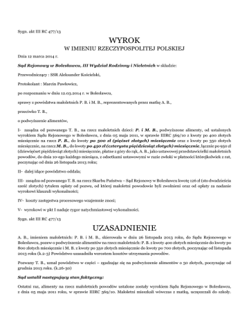 Sygn. akt III RC 477/13 WYROK W IMIENIU RZECZYPOSPOLITEJ POLSKIEJ Dnia 12 marca 2014 r. Sąd Rejonowy w Bolesławcu, III Wydział Rodzinny i Nieletnich w składzie: Przewodniczący : SSR Aleksander Kościelski, Protokolant : Marcin Pawłowicz, po rozpoznaniu w dniu 12.03.2014 r. w Bolesławcu, sprawy z powództwa małoletnich P. B. i M. B., reprezentowanych przez matkę A. B., przeciwko T. B., o podwyższenie alimentów, I- zasądza od pozwanego T. B., na rzecz małoletnich dzieci: P. i M. B., podwyższone alimenty, od ustalonych wyrokiem Sądu Rejonowego w Bolesławcu, z dnia 05 maja 2011, w sprawie IIIRC 569/10 z kwoty po 400 złotych miesięcznie na rzecz P. B., do kwoty po 500 zł (pięćset złotych) miesięcznie oraz z kwoty po 350 złotych miesięcznie, na rzecz M. B., do kwoty po 450 zł (czterysta pięćdziesiąt złotych) miesięcznie, łącznie po 950 zł (dziewięćset pięćdziesiąt złotych) miesięcznie, płatne z góry do rąk, A. B., jako ustawowej przedstawicielki małoletnich powodów, do dnia 10-ego każdego miesiąca, z odsetkami ustawowymi w razie zwłoki w płatności którejkolwiek z rat, poczynając od dnia 26 listopada 2013 roku; II- dalej idące powództwo oddala; III- zasądza od pozwanego T. B. na rzecz Skarbu Państwa – Sąd Rejonowy w Bolesławcu kwotę 126 zł (sto dwadzieścia sześć złotych) tytułem opłaty od pozwu, od której małoletni powodowie byli zwolnieni oraz od opłaty za nadanie wyrokowi klauzuli wykonalności; IV- koszty zastępstwa procesowego wzajemnie znosi; V- wyrokowi w pkt I nadaje rygor natychmiastowej wykonalności. Sygn. akt III RC 477/13 UZASADNIENIE A. B., imieniem małoletnich: P. B. i M. B., skierowała w dniu 26 listopada 2013 roku, do Sądu Rejonowego w Bolesławcu, pozew o podwyższenie alimentów na rzecz małoletnich: P. B. z kwoty 400 złotych miesięcznie do kwoty po 800 złotych miesięcznie i M. B. z kwoty po 350 złotych miesięcznie do kwoty po 700 złotych, poczynając od listopada 2013 roku (k.2-3) Powództwo uzasadniła wzrostem kosztów utrzymania powodów. Pozwany T. B., uznał powództwo w części – zgadzając się na podwyższenie alimentów o 50 złotych, poczynając od grudnia 2013 roku. (k.26-30) Sąd ustalił następujący stan faktyczny: Ostatni raz, alimenty na rzecz małoletnich powodów ustalone zostały wyrokiem Sądu Rejonowego w Bolesławcu, z dnia 05 maja 2011 roku, w sprawie IIIRC 569/10. Małoletni mieszkali wówczas z matką, uczęszczali do szkoły. Powódka ponosiła miesięczne koszty utrzymania mieszkania w kwocie 150 złotych, koszty energii elektrycznej 150-170 złotych latem i 800 do 1300 złotych w okresie zimowym, gaz ok. 50 złotych. Pracowała zawodowo za wynagrodzeniem ok. 1000 złotych netto. Ponosiła koszty opiekunki do dzieci w kwocie ok. 400 złotych. Dowód: protokoły i dokumenty zawarte w aktach IIIRC 569/10 SR w B.. Obecnie małoletni w dalszym ciągu mieszkają z matką w S.. Powódka ocenia koszty utrzymania małoletnich na ok. 2000 złotych miesięczni. Ponosi miesięczne koszty utrzymania mieszkania 250 złotych, za prąd ok. 500 złotych, gaz ok. 60 złotych, telewizje i internet ok. 100 złotych, telefon małoletniej powódki od 30 do 60 złotych. Telefon powódki i domowy ok. 90 złotych. Spłata pozwanego 150 złotych miesięcznie z tytułu podziału majątku. Utrzymanie samochodu ok. 400 złotych miesięcznie. Koszty wyżywienia każdego z dzieci to ok. 500-600 złotych, środki higieny ok. 200-300 złotych, koszty ubrań ok. 400-500 złotych. Powódka A. B. pracuje i zarabia ok. 1600 złotych netto. Małoletni powód M. B. co 3 miesiące korzysta z porad okulistycznych. Koszt jednej wizyty to ok. 150 złotych z kosztami okularów. Córka stron korzysta z porad endokrynologicznych co 3-6 miesięcy. Dojazd to 100 złotych. Ostatnia wizyta córki stron u okulisty z okularami kosztowała 260 złotych. Powódka posiada zadłużenie we wspólnocie mieszkaniowej na ok. 3000 złotych. Dowód: zeznania powódki A. B. k. 74v, zaświadczenie o dochodach k. 5, kserokopie dokumentów k. 6-19, 72-73. Pozwany T. B. w dacie poprzedniego rozstrzygania o alimentach w 2011 roku mieszkał z rodzicami, którym dokładał 200-220 złotych do mieszkania,. Pracował w firmie (...) za wynagrodzeniem 2150 – 3100 złotych netto. Poza dziećmi nie miał nikogo na utrzymaniu. Spłacał raty za telewizor 85 złotych miesięcznie. Linie kredytową 250 złotych miesięcznie. Ponosił koszty utrzymania samochodu ok. 130-180 złotych miesięcznie. Na leki wydawał ok. 45 złotych miesięcznie. Dowód: protokoły i dokumenty zawarte w aktach IIIRC 569/10 SR w B.. Obecnie pozwany pracuje zawodowo jako o. m. z wynagrodzeniem netto ok. 2600 złotych. W dalszym ciągu mieszka z rodzicami. Ponosi miesięczne koszty w postaci: wyżywienia ok. 700 złotych, spłaty kredytu za samochód ok. 307 złotych, spłaty karty kredytowej ok. 40 złotych, dojazd do pracy ok. 400 złotych, wyjazd po dzieci ok. 70 złotych, telefon 70 złotych. Dokłada rodzicom ok. 200-220 złotych, środki higieny 70 złotych, leki ok. 100-150 złotych. Dowód: zeznania pozwanego T. B. k. 75, zaświadczenie o dochodach k. 70, kserokopie dokumentów k. 33-59, 60-69. Sąd zważył co następuje: Powództwo częściowo zasługuje na uwzględnienie. W świetle art. 138 krio. „W razie zmiany stosunków można żądać zmiany orzeczenia lub umowy dotyczącej obowiązku alimentacyjnego”. Zarówno w literaturze jak i orzecznictwie sądowym przez zmianę stosunków rozumie się istotne zwiększenie lub zmniejszenie możliwości zarobkowych i majątkowych zobowiązanego do alimentacji oraz istotne zwiększenie się lub zmniejszenie usprawiedliwionych potrzeb uprawnionego. Pojęcia zwiększenia lub zmniejszenia usprawiedliwionych potrzeb uprawnionego oraz możliwości majątkowych i zarobkowych uprawnionego pozostają we wzajemnej zależności i wzajemnie na siebie rzutują. Wynika to faktu, że pojęcia usprawiedliwionych potrzeb 