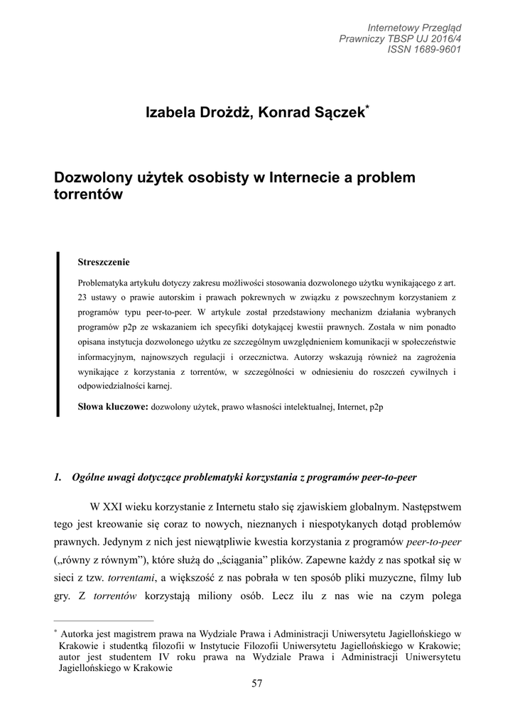 Internetowy Przegląd Prawniczy TBSP UJ 2016/4 ISSN 1689-9601 Izabela Drożdż, Konrad Sączek* Dozwolony użytek osobisty w Internecie a problem torrentów Streszczenie Problematyka artykułu dotyczy zakresu możliwości stosowania dozwolonego użytku wynikającego z art. 23 ustawy o prawie autorskim i prawach pokrewnych w związku z powszechnym korzystaniem z programów typu peer-to-peer. W artykule został przedstawiony mechanizm działania wybranych programów p2p ze wskazaniem ich specyfiki dotykającej kwestii prawnych. Została w nim ponadto opisana instytucja dozwolonego użytku ze szczególnym uwzględnieniem komunikacji w społeczeństwie informacyjnym, najnowszych regulacji i orzecznictwa. Autorzy wskazują również na zagrożenia wynikające z korzystania z torrentów, w szczególności w odniesieniu do roszczeń cywilnych i odpowiedzialności karnej. Słowa kluczowe: dozwolony użytek, prawo własności intelektualnej, Internet, p2p 1. Ogólne uwagi dotyczące problematyki korzystania z programów peer-to-peer W XXI wieku korzystanie z Internetu stało się zjawiskiem globalnym. Następstwem tego jest kreowanie się coraz to nowych, nieznanych i niespotykanych dotąd problemów prawnych. Jedynym z nich jest niewątpliwie kwestia korzystania z programów peer-to-peer („równy z równym”), które służą do „ściągania” plików. Zapewne każdy z nas spotkał się w sieci z tzw. torrentami, a większość z nas pobrała w ten sposób pliki muzyczne, filmy lub gry. Z torrentów korzystają miliony osób. Lecz ilu z nas wie na czym polega ∗ Autorka jest magistrem prawa na Wydziale Prawa i Administracji Uniwersytetu Jagiellońskiego w Krakowie i studentką filozofii w Instytucie Filozofii Uniwersytetu Jagiellońskiego w Krakowie; autor jest studentem IV roku prawa na Wydziale Prawa i Administracji Uniwersytetu Jagiellońskiego w Krakowie (57 funkcjonowanie tychże programów i czy używając ich, jesteśmy bezkarni w świetle prawa? W większości opinii prawnych czy komentarzy wskazuje się ogólnikowo, że pobieranie plików z sieci jest dozwolone, natomiast dopiero ich udostępnianie wiąże ze sobą negatywne konsekwencje. Przedmiotem omówienia będzie problematyka legalności korzystania z tego typu instrumentów. W pierwszej kolejności zostanie podjęta próba określenia, czym są programy typu p2p, a także kwestia zasad i sposobów ich funkcjonowania. Następnie przedstawione zostanie tło prawne – a więc wszelkie kwestie legalności tego typu programów, pozwalających na ściąganie plików z Internetu, w oparciu o instytucję dozwolonego użytku. 2. Czym właściwie są torrenty? Torrenty to pliki, które są używane w sieciach typu peer-to-peer. Sieci peer-to-peer stanowią „model komunikacji w sieci komputerowej zapewniający wszystkim hostom te same uprawnienia, w odróżnieniu od architektury klient–serwer. W sieciach p2p każdy węzeł sieci zwany hostem, to znaczy komputer użytkownika, może jednocześnie pełnić rolę klienta i serwera. W najpopularniejszej implementacji modelu p2p, jaką są programy do wymiany plików w Internecie, każdy host spełnia rolę serwera, przyjmując połączenia od innych użytkowników sieci oraz klienta, łącząc się i wysyłając lub pobierając pliki z innych hostów działających w tej samej sieci p2p. Wymiana plików jest prowadzona bezpośrednio pomiędzy hostami”1 . Mówiąc słowami zrozumiałymi dla przeciętnego odbiorcy, chodzi o to, że gdy korzystamy z programu typu p2p i chcemy pobrać wybrany przez nas plik, stajemy się użytkownikami tej sieci i pobieramy dany plik wprost z komputerów innych jej użytkowników. Należy jednakże pamiętać, że najczęściej wiąże się to umożliwieniem innym uczestnikom tego systemu pobierania plików również z naszych komputerów. Od początku istnienia sieci Internet, tj. od lat 60. ubiegłego wieku powstało wiele programów typu p2p, m.in.: IRC, Napster, Audiogalaxy, Gnutella, Fast Track, Direct Connect, eDonkey, Bittorent, Skype2. Należy wspomnieć, że pierwszym z nich był Napster, który rozpoczął działalność w 1999 roku w celu umożliwienia kopiowania plików muzycznych mp3. Zdobył on wielką popularność przede wszystkim dzięki łatwości obsługi i zasobie plików, jednakże już po roku działalności perkusista zespołu Metallica, Lars Ulrich, wytoczył sprawę przeciw Napsterowi, a za nim poszli kolejni artyści i wytwórnie fonograficzne, co doprowadziło do 1 https://pl.wikipedia.org/wiki/Peer-to-peer, [dostęp: 25.06.2016 r.]. 2 http://alterweb.pl/-peer-to-peer-definicja-historia-powstania-i-wplyw-na-rozwoj-internetu-cz-2, [dostęp: 25.06.2016 r.]. (58 przekierowania działania Napstera w formę aplikacji odpłatnej3. Wskazuje się, że to właśnie muzyka i możliwość jej darmowego pobierania była główną przyczyną powstania programów p2p4 . Jak wiemy, dzięki programom typu p2p obecnie możemy pobrać praktycznie wszystko: od zajmujących niewiele pamięci masowej ebooków, aż po wielkie pliki gier komputerowych. Wyróżnić można wiele podziałów programów peer-to-peer, m.in. ze względu na posiadania centralnego serwera lub ze względu na kontynuację downloadingu w zależności od aktywności innych uczestników. Jedynym relewantnym podziałem w związku z tematem niniejszego artykułu jest selekcja ze względu na wymuszanie jednoczesnego udostępniania utworów podczas pobierania plików. Wbrew wiedzy przeciętnego użytkownika korzystanie z programów p2p nie zawsze musi łączyć się z jednoczesnym udostępnianiem pliku. Jak wskazuje Jakub Chwalba, programy p2p według tego kryterium można sklasyfikować na programy: – „Porcjujące”, które symultanicznie udostępniają pobrane już fragmenty „ściąganych” plików (eMule, eDonkey2000, BitTorrent, GoKadCek); samo pobieranie za ich pomocą nie jest możliwe; – Programy, które technicznie nie wymuszają udostępniania plików. Program um