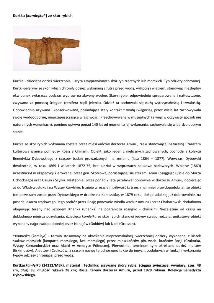 Kurtka (kamlejka*) ze skór rybich Kurtka - dziecięca odzież wierzchnia, uszyta z wyprawionych skór ryb rzecznych lub morskich. Typ odzieży ochronnej. Kurtki-peleryny ze skór rybich chroniły odzież wykonaną z futra przed wodą, wilgocią i wiatrem, stanowiąc niezbędny ekwipunek zwłaszcza podczas wypraw na akweny wodne. Skóry rybie, odpowiednio spreparowane i natłuszczone, zszywano za pomocą ścięgien (renifera bądź jelenia). Odzież ta cechowała się dużą wytrzymałością i trwałością. Odpowiednio używana i konserwowana, posiadająca stały kontakt z wodą (wilgocią), przez wiele lat zachowywała swoje wodoodporne, nieprzepuszczające właściwości. Przechowywana w muzealnych (a więc w oczywisty sposób nie naturalnych warunkach), pomimo upływu ponad 140 lat od momentu jej wykonania, zachowała się w bardzo dobrym stanie. Kurtka ze skór rybich wykonana została przez mieszkańców dorzecza Amuru, rzeki stanowiącej naturalną i zarazem kulturową granicę pomiędzy Rosją a Chinami. Obiekt, jako jeden z nielicznych zachowanych, pochodzi z kolekcji Benedykta Dybowskiego z czasów badań prowadzonych na zesłaniu (lata 1864 – 1877). Wówczas, Dybowski dwukrotnie, w roku 1869 i w latach 1872-75, brał udział w wyprawach naukowo-badawczych. Wpierw (1869) uczestniczył w ekspedycji kierowanej przez gen. Skołkowa, poruszającej się rzekami Amur (osiągając ujście do Morza Ochockiego) oraz Ussuri i Szyłka. Następnie, przez ponad 2 lata przebywał ponownie w dorzeczu Amuru, docierając aż do Władywostoku i na Wyspy Kurylskie. Istnieje wreszcie możliwość (z trzech najmniej prawdopodobna), że obiekt ten pozyskany został przez Dybowskiego w drodze na Kamczatkę, w 1879 roku, dokąd udał się już dobrowolnie, na posadę lekarza rządowego. Jego podróż przez Rosję ponownie wiodła wzdłuż Amuru i przez Chabarowsk, dodatkowo obejmując tereny nad jeziorem Khanka (Chanka) na pograniczu rosyjsko - chińskim. Niezależnie od czasu mi dokładnego miejsca pozyskania, dziecięca kamlejka ze skór rybich stanowi jedyny swego rodzaju, unikatowy obiekt wykonany najprawdopodobniej przez Nanajów (Goldów) lub Nani (Oroczan). *Kamlejka (kamleja) - termin stosowany na określenie nieprzemakalnej, wierzchniej odzieży wykonanej z kiszek ssaków morskich (lamparta morskiego, lwa morskiego) przez mieszkańców płn.-wsch. krańców Rosji (Czukotka, Wyspy Komandorskie) oraz Alaski w Ameryce Północnej. Pierwotnie, terminem tym określano odzież Inuitów (Eskimosów), Aleutów i Czukczów, z czasem nazwę tę odnoszono także do innych, podobnych w funkcji i wykonaniu typów odzieży chroniącej przed wodą. Kurtka/kamlejka (24212/MEK), materiał i technika: zszywane skóry rybie, ścięgna zwierzęce; wymiary: szer. 48 cm, dług. 38; długość rękawa 28 cm; Rosja, tereny dorzecza Amuru, przed 1879 rokiem. Kolekcja Benedykta Dybowskiego.