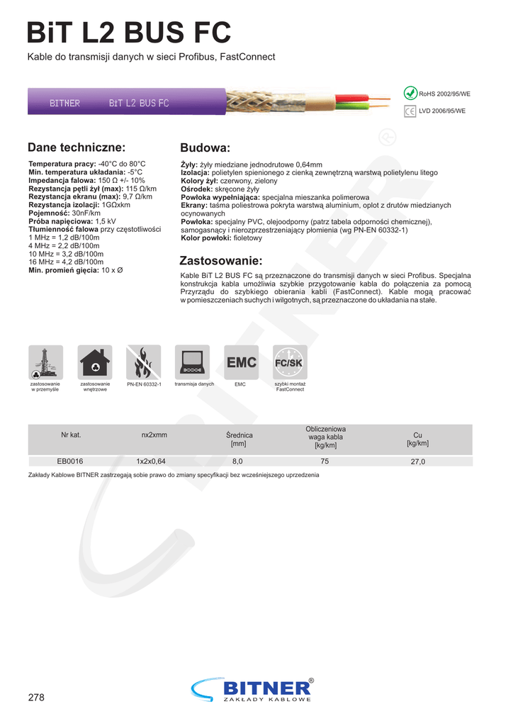 BiT L2 BUS FC Kable do transmisji danych w sieci Profibus, FastConnect RoHS RoHS 2002/95/WE LVD 2006/95/WE Dane techniczne: Budowa: Temperatura pracy: -40°C do 80°C Min. temperatura układania: -5°C Impedancja falowa: 150 Ω +/- 10% Rezystancja pętli żył (max): 115 Ω/km Rezystancja ekranu (max): 9,7 Ω/km Rezystancja izolacji: 1GΩxkm Pojemność: 30nF/km Próba napięciowa: 1,5 kV Tłumienność falowa przy częstotliwości 1 MHz = 1,2 dB/100m 4 MHz = 2,2 dB/100m 10 MHz = 3,2 dB/100m 16 MHz = 4,2 dB/100m Min. promień gięcia: 10 x Ø Żyły: żyły miedziane jednodrutowe 0,64mm Izolacja: polietylen spienionego z cienką zewnętrzną warstwą polietylenu litego Kolory żył: czerwony, zielony Ośrodek: skręcone żyły Powłoka wypełniająca: specjalna mieszanka polimerowa Ekrany: taśma poliestrowa pokryta warstwą aluminium, oplot z drutów miedzianych ocynowanych Powłoka: specjalny PVC, olejoodporny (patrz tabela odporności chemicznej), samogasnący i nierozprzestrzeniający płomienia (wg PN-EN 60332-1) Kolor powłoki: fioletowy Zastosowanie: Kable BiT L2 BUS FC są przeznaczone do transmisji danych w sieci Profibus. Specjalna konstrukcja kabla umożliwia szybkie przygotowanie kabla do połączenia za pomocą Przyrządu do szybkiego obierania kabli (FastConnect). Kable mogą pracować w pomieszczeniach suchych i wilgotnych, są przeznaczone do układania na stałe. EMC zastosowanie w przemyśle zastosowanie wnętrzowe PN-EN 60332-1 Nr kat. nx2xmm EB0016 1x2x0,64 transmisja danych EMC FC/SK szybki montaż FastConnect Średnica [mm] Obliczeniowa waga kabla [kg/km] Cu [kg/km] 8,0 75 27,0 Zakłady Kablowe BITNER zastrzegają sobie prawo do zmiany specyfikacji bez wcześniejszego uprzedzenia ® 278