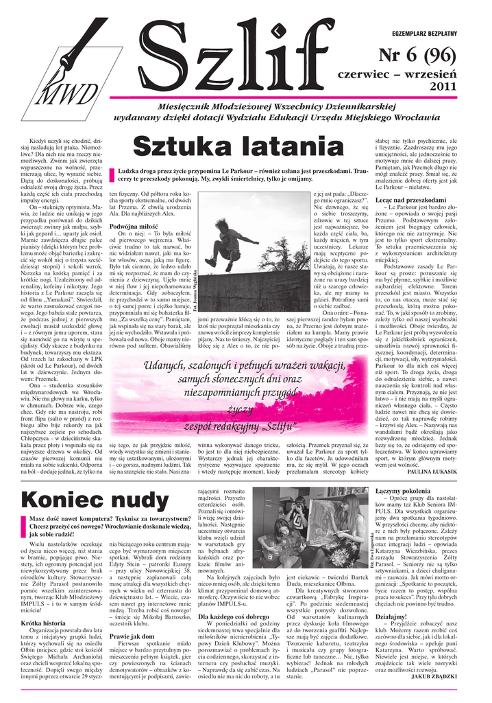 EGZEMPLARZ BEZPŁATNY Nr 6 (96) czerwiec – wrzesień 2011 Miesięcznik Młodzieżowej Wszechnicy Dziennikarskiej wydawany dzięki dotacji Wydziału Edukacji Urzędu Miejskiego Wrocławia Sztuka latania ten fizyczny. Od półtora roku ko cha sporty ekstremalne, od dwóch lat Przema. Z chwilą urodzenia Ala. Dla najbliższych Alex. Podwójna miłość On o niej: – To była miłość od pierwszego wejrzenia. Właś ciwie trudno to tak nazwać, bo nie widziałem nawet, jaki ma ko lor włosów, oczu, jaką ma figurę. Było tak ciemno, że ledwo udało mi się rozpoznać, że mam do czy nienia z dziewczyną. Ujęło mnie w niej flow i jej niepohamowana determinacja. Gdy zobaczyłem, że przychodzi w to samo miejsce, o tej samej porze i ciężko haruje, przypomniała mi się bohaterka fil mu „Za wszelką cenę”. Pamiętam, jak wspinała się na stary barak, ale jej nie wychodziło. Wstawała i pró bowała od nowa. Oboje mamy nie równo pod sufitem. Obawialiśmy Organizacja powstała dwa lata temu z inicjatywy grupki ludzi, którzy wychowali się na osiedlu Ołbin (miejsce, gdzie stoi kościół Świętego Michała Archanioła) oraz chcieli wesprzeć lokalną spo łeczność. Dopięli swego między innymi poprzez otwarcie 29 stycz lecąc nad przeszkodami – Le Parkour jest bardzo zło żone – opowiada o swojej pasji Przemo. Podstawowym zało żeniem jest biegnący człowiek, którego nic nie zatrzymuje. Nie jest to tylko sport ekstremalny. To sztuka przemieszczenia się z wykorzystaniem architektury miejskiej. Podstawowe zasady Le Par kour są proste: poruszanie się ma być płynne, szybkie i możliwie najbardziej efektowne. Torem przeszkód jest miasto. Wszystko to, co nas otacza, może stać się przeszkodą, którą można poko nać. To, w jaki sposób to zrobimy, zależy tylko od naszej wyobraźni i możliwości. Oboje twierdzą, że Le Parkour jest próbą wyzwolenia się z jakichkolwiek ograniczeń, umożliwia rozwój sprawności fi zycznej, koordynacji, determina cji, motywacji, siły, wytrzymałości. Parkour to dla nich coś więcej niż sport. To droga życia, droga do odnalezienia siebie, a nawet nauczenia się kontroli nad włas nym ciałem. Przyznają, że nie jest łatwo – i nie mają na myśli ogra niczeń własnego ciała. – Często ludzie nawet nie chcą się dowie dzieć, co tak naprawdę robimy – krzywi się Alex. – Nazywają nas wandalami bądź określają jako rozwydrzoną młodzież. Jednak liczy się to, że odstajemy od spo łeczeństwa. W końcu uprawiamy sport, w którym głównym moty wem jest wolność. PAUlINA ŁUKASIK nia bieżącego roku centrum mają cego być wymarzonym miejscem spotkań. Wybrali dom rodzinny Edyty Stein – patronki Europy – przy ulicy Nowowiejskiej 38, a następnie zaplanowali całą masę atrakcji dla wszystkich chęt nych w wieku od czternastu do dziewiętnastu lat. – Wiecie, cza sem nawet gry internetowe mnie nudzą. Trzeba robić coś nowego! – śmieje się Mikołaj Bartoszko, uczestnik klubu. Prawie jak dom Pierwsze spotkanie miało miejsce w bardzo przytulnym po mieszczeniu pełnym książek, gier czy powieszonych na ścianach demotywatorów – obrazków z ko mentującymi je podpisami, zawie winna wykonywać danego tricku, bo jest to dla niej niebezpieczne. Wystarczy jednak jej charakte rystyczne wyzywające spojrzenie i wtedy następuje moment, kiedy rającymi rozmaite mądrości. Przyszło czterdzieści osób. Poznali się i omówi li wizję swojej dzia łalności. Następnie uczestnicy otwarcia klubu wzięli udział w warsztatach gry na bębnach afry kańskich oraz po kazie filmów ani mowanych. Na kolejnych zajęciach było nieco mniej osób, ale dzięki temu klimat przypominał domową at mosferę. Oczywiście to nic wobec planów IMPULSu. Dla każdego coś dobrego W poniedziałki od godziny siedemnastej trwa specjalnie dla miłośników nicnierobienia „Ty powy Dzień Klubowy”. Można porozmawiać o problemach ży cia codziennego, skorzystać z in ternetu czy posłuchać muzyki. – Naprawdę da się zabić czas. Na osiedlu nie ma nic do roboty, a tu szłością. Przemek przyznał się, że uważał Le Parkour za sport tyl ko dla facetów. Ja udowodniłam mu, że się mylił. W jego oczach przełamałam stereotyp kobiety Łączymy pokolenia Fot. Ewa Ługowska się tego, że jak przyjdzie miłość, wtedy wszystko się zmieni i stanie my się ustatkowanymi, ułożonymi i – co gorsza, nudnymi ludźmi. Tak się na szczęście nie stało. Nasi zna Masz dość nawet komputera? Tęsknisz za towarzystwem? Chcesz przeżyć coś nowego? Wrocławianie doskonale wiedzą, jak sobie radzić! Krótka historia jomi przeważnie kłócą się o to, że ktoś nie posprzątał mieszkania czy znowu wrócił z imprezy kompletnie pijany. Nas to śmieszy. Najczęściej kłócę się z Alex o to, że nie po z jej ust pada: „Dlacze go mnie ograniczasz?”. Nic dziwnego, że się o siebie troszczymy, zdrowie w tej sztuce jest najważniejsze, bo każda część ciała, ba, każdy mięsień, w tym uczestniczy. Lekarze mają sceptyczne po dejście do tego sportu. Uważają, że nasze sta wy są obciążone i nara żone na urazy bardziej niż u szarego człowie ka, ale my mamy to gdzieś. Potrafimy sami o siebie zadbać. Ona o nim: – Po na szej pierwszej randce byłam pew na, że Przemo jest dobrym mate riałem na kumpla. Mamy prawie identyczne poglądy i ten sam spo sób na życie. Oboje z trudną prze Udanych, szalonych i pełnych wrażeń wakacji, samych słonecznych dni oraz niezapomnianych przygód życzy zespół redakcyjny „Szlifu” Koniec nudy Wielu nastolatków oczekuje od życia nieco więcej, niż stania w bramie, popijając piwo. Nie stety, ich ogromny potencjał jest niewykorzystywany przez brak ośrodków kultury. Stowarzysze nie Żółty Parasol postanowiło pomóc wszelkim zainteresowa nym, tworząc Klub Młodzieżowy IMPULS – i to w samym śród mieściu! słabej nie tylko psychicznie, ale i fizycznie.