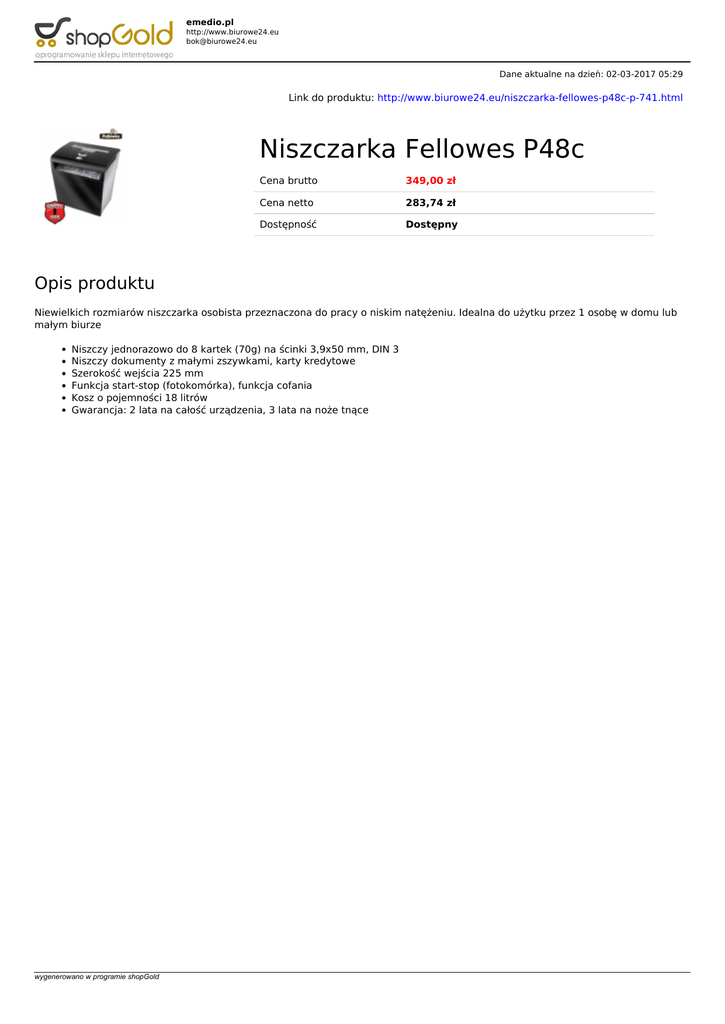emedio.pl http://www.biurowe24.eu [email protected] Dane aktualne na dzień: 02-03-2017 05:29 Link do produktu: http://www.biurowe24.eu/niszczarka-fellowes-p48c-p-741.html Niszczarka Fellowes P48c Cena brutto 349,00 zł Cena netto 283,74 zł Dostępność Dostępny Opis produktu Niewielkich rozmiarów niszczarka osobista przeznaczona do pracy o niskim natężeniu. Idealna do użytku przez 1 osobę w domu lub małym biurze Niszczy jednorazowo do 8 kartek (70g) na ścinki 3,9x50 mm, DIN 3 Niszczy dokumenty z małymi zszywkami, karty kredytowe Szerokość wejścia 225 mm Funkcja start-stop (fotokomórka), funkcja cofania Kosz o pojemności 18 litrów Gwarancja: 2 lata na całość urządzenia, 3 lata na noże tnące wygenerowano w programie shopGold Powered by TCPDF (www.tcpdf.org)