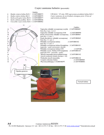 Części zamienne hełmów (pozostałe) · · · · · Ramka wizjera hełmu ReS-1 Siatka wizjera hełmu ReS-1 Szyba poliwęglan hełmu ReS-1 Szyba szklana podklej. ReS-1 Uszczelka wizjera hełmu ReS-1 | Indeks: | CA0TOB0073 | CA0TOB0075 | CA0TOB0077 | CA0TOB0046 | CA0TOB0082 UWAGA ! W roku 1999 zaprzestano produkcji hełmu ReS-1 Części zamienne do tych hełmów dostępne przez 10 lat od zaprzestania produkcji. | Indeks: Tapicerka wkładki wewnętrznej zwykła | CA0TOB0069 ¨ · Patrz Rys.3 poz. 1,2,3,4 ¨ ¨ Tapicerka wkładki wewnętrznej O/H | CA0TOB0099 Pasek zawieszenia wkładki wewnętrznej | CA0TOB0067 · Patrz Rys. 3.1 poz. 1 ¨ Pasek dociskowy wkładki wewnętrznej · | CA0TOB0065 Patrz Rys. 3.1. poz. 2 ¨ Wkładka wewnętrzna hełmu · | CA0TOB0182 Patrz Rys. 3.1 poz. 4 ¨ Wkładka wewnętrzna hełmu Kompletna | CA0TOB0183 · [tapicerka + paski zawieszenia i docisk] ¨ ¨ Wkładka wewnętrzna hełmu O/H Wkładka wewn. Hełmu O/H kompletna · | CA0TOB.... | CA0TOB0145 [tapicerka O/H + nauszniki + paski] ¨ Muszla nausznika przeciwhałasowego · | CA0TOB0142 [muszla+poduszka+pianka tłumiąca 1 szt] ¨ ¨ ¨ Poduszka muszli nausznika Czepek ochronny hełmu Płyn dezynfekujący CAGROSEPT | CA0TOB0124 | CA0TOB0060 | CA0TWB0001 Opaska gumowa Fartuch hełmu A4 Centrum Antykorozji RESIN PL 32-052 Radziszów Jurczyce 111 tel: +48 12 275 17 45 fax: +48 12 275 17 46 www.resin.com.pl * [email protected] Hełmy powietrzne RESIN posiadają odpinany (wymienny) fartuch ochronny. Dzięki zastosowaniu taśmy velcro do połączenia fartucha z krawędzią hełmu, demontaż w celu wymiany lub konserwacji zajmuje dosłownie minutę. Fartuch jest wykonany z materiałów odpornych na ścieranie, zapewniających długą i bezpieczną pracę. Dodatkowo, miejsce połączenia fartucha z krawędzią hełmu zabezpieczone jest opaską gumowa. | Indeks: · · · · · · · · Fartuch wymienny hełmu Fartuch wymienny hełmu „długi” | CA0TOB0016 | CA0TOB0177 [do komór śrutowniczych] Fartuch wymienny „plecakowy” | CA0TOB0061 [do Zest. Kliamatyzacyjnego ReS-KL/F] Fartuch wymienny „metalizowany” | CA0TOB0058 [dla hełmu do metalizacji ReS-4M] Opaska gumowa fartucha A4 | CA0TOB0054 Centrum Antykorozji RESIN PL 32-052 Radziszów Jurczyce 111 tel: +48 12 275 17 45 fax: +48 12 275 17 46 www.resin.com.pl * [email protected]