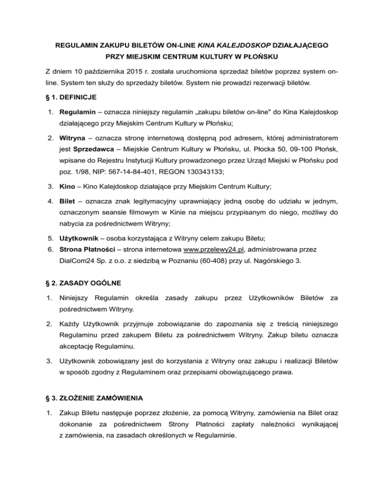 REGULAMIN ZAKUPU BILETÓW ON-LINE KINA KALEJDOSKOP DZIAŁAJĄCEGO PRZY MIEJSKIM CENTRUM KULTURY W PŁOŃSKU Z dniem 10 października 2015 r. została uruchomiona sprzedaż biletów poprzez system online. System ten służy do sprzedaży biletów. System nie prowadzi rezerwacji biletów. § 1. DEFINICJE 1. Regulamin – oznacza niniejszy regulamin „zakupu biletów on-line" do Kina Kalejdoskop działającego przy Miejskim Centrum Kultury w Płońsku; 2. Witryna – oznacza stronę internetową dostępną pod adresem, której administratorem jest Sprzedawca – Miejskie Centrum Kultury w Płońsku, ul. Płocka 50, 09-100 Płońsk, wpisane do Rejestru Instytucji Kultury prowadzonego przez Urząd Miejski w Płońsku pod poz. 1/98, NIP: 567-14-84-401, REGON 130343133; 3. Kino – Kino Kalejdoskop działające przy Miejskim Centrum Kultury; 4. Bilet – oznacza znak legitymacyjny uprawniający jedną osobę do udziału w jednym, oznaczonym seansie filmowym w Kinie na miejscu przypisanym do niego, możliwy do nabycia za pośrednictwem Witryny; 5. Użytkownik – osoba korzystająca z Witryny celem zakupu Biletu; 6. Strona Płatności – strona internetowa www.przelewy24.pl, administrowana przez DialCom24 Sp. z o.o. z siedzibą w Poznaniu (60-408) przy ul. Nagórskiego 3. § 2. ZASADY OGÓLNE 1. Niniejszy Regulamin określa zasady zakupu przez Użytkowników Biletów za pośrednictwem Witryny. 2. Każdy Użytkownik przyjmuje zobowiązanie do zapoznania się z treścią niniejszego Regulaminu przed zakupem Biletu za pośrednictwem Witryny. Zakup biletu oznacza akceptację Regulaminu. 3. Użytkownik zobowiązany jest do korzystania z Witryny oraz zakupu i realizacji Biletów w sposób zgodny z Regulaminem oraz przepisami obowiązującego prawa. § 3. ZŁOŻENIE ZAMÓWIENIA 1. Zakup Biletu następuje poprzez złożenie, za pomocą Witryny, zamówienia na Bilet oraz dokonanie za pośrednictwem Strony Płatności zapłaty należności wynikającej z zamówienia, na zasadach określonych w Regulaminie. 2. Złożenie zamówienia odbywa się poprzez każdorazowe przejście przez Użytkownika ścieżki składającej się z następujących kroków: 1) wybór daty uczestnictwa w seansie z listy, zakończony naciśnięciem przycisku KUP BILET; 2) wybór ilości (max 6) i rodzaju Biletów oraz przypisanych im miejsc na sali kinowej; 3) podanie danych osobowych Użytkownika (imię, nazwisko, adres, e-mail, numer telefonu komórkowego); 4) złożenie oświadczeń o akceptacji warunków niniejszego Regulaminu oraz oświadczeń związanych z przetwarzaniem danych osobowych Użytkownika, o treści wskazanej na podstronie Witryny. 3. Sprzedawca nie ponosi odpowiedzialności za skutki podania nieprawdziwych lub błędnych danych w formularzu zamówienia. 4. Sprzedawca zastrzega sobie możliwość zakończenia sprzedaży w każdej chwili bez podania przyczyn. § 4. PŁATNOŚCI 1. Płatność za Bilet zamówiony za pośrednictwem Witryny możliwa będzie wyłącznie za pomocą Strony Płatności, na którą Użytkownik zostanie przekierowany bezpośrednio po złożeniu zamówienia. 2. Użytkownik ma możliwość zapłaty za zamówione Bilety wyłącznie za pomocą form płatności udostępnionych na Stronie Płatności. 3. Płatność wynikająca z jednego zamówienia powinna zostać dokonana jednorazowo, w całości oraz zawierać cenę wszystkich zamówionych Biletów wraz z kosztem ich dostawy. 4. Płatność powinna być dokonana nie wcześniej niż w momencie złożenia zamówienia i nie później niż w terminie 15 minut od złożenia zamówienia. Po bezskutecznym upływie terminu na dokonanie płatności zamówienie Użytkownika zostanie anulowane, o czym Użytkownik zostanie poinformowany wiadomością email wysłaną na adres email wskazany w zamówieniu. 5. Momentem decydującym o wykonaniu płatności jest otrzymanie przez Sprzedawcę informacji o wykonaniu płatności. 6. Ceny wskazane na stronach Witryny, w potwierdzeniu zamówienia oraz na Bilecie są kwotami brutto, zawierającymi podatek VAT obliczony zgodnie z obowiązującymi przepisami. § 5. DOSTAWA I REALIZACJA BILETU 1. Po dokonaniu płatności Użytkownik otrzyma Bilet około 5 minut od dokonania płatności, nie później jednak niż w terminie 20 minut od złożenia zamówienia; na adres email podany przez Użytkownika zostanie wysłana wiadomość email zawierająca Bilet w formacie PDF do samodzielnego wydruku. Użytkownik jest zobowiązany do niezwłocznego skontrolowania otrzymanych Biletów pod kątem ich zgodności ze złożonym zamówieniem. 2. Wyposażeniem niezbędnym do wykorzystania Biletu wysłanego Użytkownikowi w formie e-mail jest komputer z oprogramowaniem obsługującym pliki w formacie PDF, oraz drukarka komputerowa z czarnym tuszem. Bilet musi być wydrukowany na białym papierze. 3. Koszt połączenia z siecią Internet w celu pobrania biletu w formie e-mail ponosi Użytkownik, zgodnie z taryfą swojego operatora. 4. Bilet należy przechowywać w bezpiecznym miejscu. Przekazanie go przez Użytkownika innej osobie, kopiowanie, zagubienie lub jego utrata, jak również udostępnienie biletu lub numeru identyfikatora transakcji, osobom trzecim może uniemożliwić Użytkownikowi uczestnictwo w seansie filmowym, na który został zakupiony bilet. 5. Sprzedawca jest zwolniony z odpowiedzialności wobec Użytkownika oraz nie jest zobowiązany do zwrotu ceny Biletu lub rekompensaty w sytuacji, gdy na skutek zdarzeń opisanych w pkt 4 osoba nieuprawniona posłuży się biletem w celu wejścia na seans filmowy. 6. Realizacja Biletu następuje poprzez okazanie bileterowi wpuszczającemu widzów do sal wydruku w kolorze czarnym na białym papierze. 7. Bilet jest ważny od momentu jego otrzymania po dokonaniu płatności, do momentu zakończenia seansu, którego dotyczył. § 6. ZWROT BILETÓW 1. Na podstawie art. 38 pkt 12 ustawy o prawach konsumenta prawo odstąpienia od umowy zawartej poza lokalem przedsiębiorstwa lub na odleg