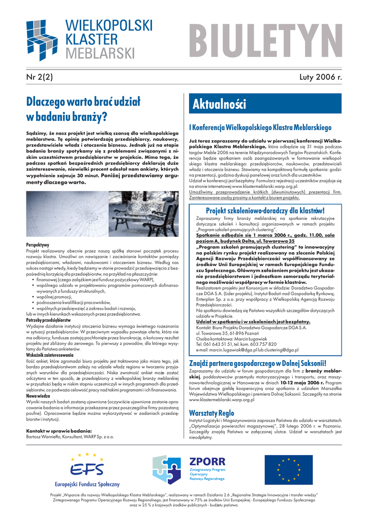 Nr 2(2) Dlaczego warto braæ udzia³ w badaniu bran¿y? S¹dzimy, ¿e nasz projekt jest wielk¹ szans¹ dla wielkopolskiego meblarstwa. Tê opiniê potwierdzaj¹ przedsiêbiorcy, naukowcy, przedstawiciele w³adz i otoczenia biznesu. Jednak ju¿ na etapie badania bran¿y spotykamy siê z problemami zwi¹zanymi z niskim uczestnictwem przedsiêbiorstw w projekcie. Mimo tego, ¿e podczas spotkañ bezpoœrednich przedsiêbiorcy deklaruj¹ du¿e zainteresowanie, niewielki procent odes³a³ nam ankiety, których wype³nienie zajmuje 30 minut. Poni¿ej przedstawiamy argu- menty dlaczego warto. Luty 2006 r. Aktualnoœci I Konferencja Wielkopolskiego Klastra Meblarskiego Ju¿ teraz zapraszamy do udzia³u w pierwszej konferencji Wielkopolskiego Klastra Meblarskiego, która odbêdzie siê 31 maja podczas targów Meble 2006 na terenie Miêdzynarodowych Targów Poznañskich. Konferencja bêdzie spotkaniem osób zaanga¿owanych w formowanie wielkopolskiego klastra meblarskiego: przedsiêbiorców, naukowców, przedstawicieli w³adz i otoczenia biznesu. Stawiamy na kompaktow¹ formu³ê spotkania: godzina prezentacji, godzina dyskusji panelowej oraz lunch dla uczestników. Udzia³ w konferencji jest bezp³atny. Formularz rejestracji uczestników znajduje siê na stronie internetowej www.klastermeblarski.warp.org.pl. Umo¿liwimy przeprowadzenie krótkich (dwuminutowych) prezentacji firm. Zainteresowane osoby prosimy o kontakt z biurem projektu. Projekt szkoleniowo-doradczy dla klastrów! Perspektywy Projekt realizowany obecnie przez nasz¹ spó³kê stanowi pocz¹tek procesu rozwoju klastra. Umo¿liwi on nawi¹zanie i zacieœnianie kontaktów pomiêdzy przedsiêbiorcami, w³adzami, naukowcami i otoczeniem biznesu. Wed³ug nas sukces nast¹pi wtedy, kiedy bêdziemy w stanie prowadziæ przedsiêwziêcia z bezpoœredni¹ korzyœci¹ dla przedsiêbiorstw, na przyk³ad na p³aszczyŸnie: • finansowej (czego zal¹¿kiem jest fundusz po¿yczkowy WARP), • wspólnego udzia³u w projektowaniu programów pomocowych dofinansowywanych z funduszy strukturalnych, • wspólnej promocji, • podnoszenia kwalifikacji pracowników, • wspólnych przedsiêwziêæ z zakresu badañ i rozwoju, lub w innych kierunkach wskazanych przez przedsiêbiorstwa. Potrzeby przedsiêbiorstw Wydajne dzia³anie instytucji otoczenia biznesu wymaga œwietnego rozeznania w sytuacji przedsiêbiorców. W przeciwnym wypadku powstaje oferta, która nie ma odbiorcy, fundusze zostaj¹ poch³oniête przez biurokracjê, a koñcowy rezultat projektu jest zbli¿ony do zerowego. To pierwszy z powodów, dla którego wysy³amy do Pañstwa ankieterów. Zapraszamy firmy bran¿y meblarskiej na spotkanie rekrutacyjne dotycz¹ce szkoleñ i konsultacji organizowanych w ramach projektu „Program szkoleñ promuj¹cych clustering”. Spotkanie odbêdzie siê 1 marca 2006 r., godz. 11.00, sala poziom A, budynek Delta, ul. Towarowa 35 „Program szkoleñ promuj¹cych clustering” to innowacyjny na polskim rynku projekt realizowany na zlecenie Polskiej Agencji Rozwoju Przedsiêbiorczoœci wspó³finansowany ze œrodków Unii Europejskiej w ramach Europejskiego Funduszu Spo³ecznego. G³ównym za³o¿eniem projektu jest ukazanie przedsiêbiorstwom i jednostkom samorz¹du terytorialnego mo¿liwoœci wspó³pracy w formie klastrów. Realizatorem projektu jest Konsorcjum w sk³adzie: Doradztwo Gospodarcze DGA S.A. (Lider projektu), Instytut Badañ nad Gospodark¹ Rynkow¹, Enterplan Sp. z o.o. przy wspó³pracy z Wielkopolsk¹ Agencj¹ Rozwoju Przedsiêbiorczoœci. Na spotkaniu dowiedz¹ siê Pañstwo wszystkich szczegó³ów dotycz¹cych udzia³u w Projekcie. Udzia³ w spotkaniu i w szkoleniach jest bezp³atny. Kontakt: Biuro Projektu Doradztwo Gospodarcze DGA S.A. ul. Towarowa 35, 61-896 Poznañ Osoba kontaktowa: Marcin £ugawiak Tel. 061 643 51 51, tel. kom. 603 757 820 e-mail: [email protected] lub [email protected] WskaŸnik zainteresowania Iloœæ ankiet, które zgromadzi biuro projektu jest traktowana jako miara tego, jak bardzo przedsiêbiorstwom zale¿y na udziale w³adz regionu w tworzeniu przyjaznych warunków dla przedsiêbiorczoœci. Niska zwrotnoœæ ankiet mo¿e zostaæ odczytana w ten sposób, ¿e przedsiêbiorcy z wielkopolskiej bran¿y meblarskiej w przysz³oœci bêd¹ w niskim stopniu uczestniczyli w innych programach dla przedsiêbiorstw, co podwa¿a celowoœæ pracy nad takimi programami i ich finansowania. Nowa wiedza Wyniki naszych badañ zostan¹ ujawnione (oczywiœcie ujawnione zostanie opracowanie badania a informacje przekazane przez poszczególne firmy pozostan¹ poufne). Opracowanie bêdzie mo¿na wykorzystywaæ w zadaniach przedsiêbiorstw i instytucji. Kontakt w sprawie badania: Bartosz Warnie³³o, Konsultant, WARP Sp. z o.o. ZnajdŸ partnera gospodarczego w Dolnej Saksonii! Zapraszamy do udzia³u w forum gospodarczym dla firm z bran¿y meblarskiej, poddostawców przemys³u motoryzacyjnego i transportu, oraz maszynowo-technologicznej w Hanowerze w dniach 10-12 maja 2006 r. Program forum obejmuje gie³dê kooperacyjn¹ oraz spotkania z udzia³em Marsza³ka Województwa Wielkopolskiego i premiera Dolnej Saksonii. Szczegó³y na stronie www.klastermeblarski.warp.org.pl Warsztaty Reglo Instytut Logistyki i Magazynowania zaprasza Pañstwa do udzia³u w warsztatach „Optymalizacja powierzchni magazynowej”, 28 lutego 2006 r. w Poznaniu. Szczegó³y znajd¹ Pañstwo w za³¹czonej ulotce. Udzia³ w warsztatach jest nieodp³atny. Projekt „Wsparcie dla rozwoju Wielkopolskiego Klastra Meblarskiego”, realizowany w ramach Dzia³ania 2.6 „Regionalne Strategie Innowacyjne i transfer wiedzy” Zintegrowanego Programu Operacyjnego Rozwoju Regionalnego, jest finansowany w 75% ze œrodków Unii Europejskiej - Europejskiego Funduszu Spo³ecznego oraz w 25 % z krajowych œrodków publicznych - bud¿etu pañstwa. Biuletyn Wielkopolski Klaster Meblarski W styczniu po raz kolejny spad³o oprocentowanie po¿yczek udzielanych przez WARP Sp. z o.o. Wi