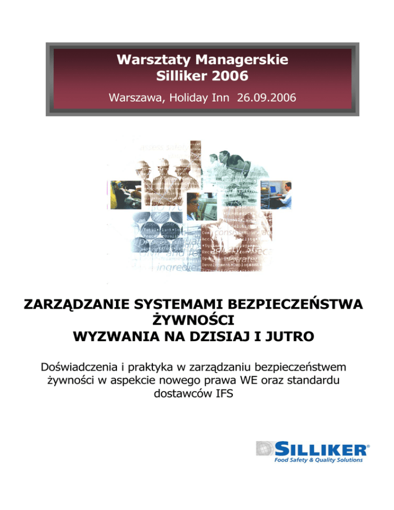 Warsztaty Managerskie Silliker 2006 Warszawa, Holiday Inn 26.09.2006 ZARZĄDZANIE SYSTEMAMI BEZPIECZEŃSTWA ŻYWNOŚCI WYZWANIA NA DZISIAJ I JUTRO Doświadczenia i praktyka w zarządzaniu bezpieczeństwem żywności w aspekcie nowego prawa WE oraz standardu dostawców IFS Warsztaty Managerskie – Silliker 2006 Przesłanie: Nowe uwarunkowania prawne WE oraz coraz większe oczekiwania partnerów handlowych efektywnie zwiększają potrzebę ciągłego rozwoju systemów zarządzania bezpieczeństwem i jakością żywności. Kluczowym elementem staje się poszerzanie wiedzy i świadomości osób odpowiedzialnych za wprowadzenie produktu na rynek. Wychodząc naprzeciw tym potrzebom przedstawiamy Państwu program Warsztatów Managerskich skierowanych do kadry zarządzającej jakością i bezpieczeństwem żywności. Układając ten program kierowaliśmy się myślą przewodnią założyciela firmy Dr John H. Silliker: „Dostarczyć klientowi więcej niż tylko wyniki analiz, dostarczyć mu praktyczne rozwiązanie jego problemu” PROGRAM 8h30-9h15 Rejestracja (kawa) WROWADZENIE 9h15-9h20 Powitanie JANUSZ OLEJNIK Dyrektor Generalny Silliker Sp. z o.o. 9h20-9h30 Inne spojrzenie na koszty jakości JANUSZ OLEJNIK PRAWO I SYSTEMY JAKOŚCI 9h30- 10h30 10h30-11h30 Nowe tendencje w zakresie odpowiedzialności producentów żywności w świetle zmian prawa żywnościowego • Wielość reżimów odpowiedzialności producenta: administracyjny, cywilny i karny • Stan aktualny i projektowane zmiany w zakresie odpowiedzialności administracyjnej • Zmiany dotychczasowych koncepcji w przedmiocie odpowiedzialności cywilnej. - odpowiedzialność o charakterze ogólnym - odpowiedzialność za produkt niebezpieczny • Karne aspekty działalności producenta • Charakterystyka przypadków na tle praktyki administracji i orzecznictwa sądów krajowych i ETS System IFS • rezultaty po dwóch latach od pierwszych certyfikacji IFS • główne przyczyny nie osiągnięcia wymogów certyfikacji • zapowiedzi wersji 5 2007 PRZERWA KAWOWA RAFAŁ ROGALA Naczelnik Wydziału Prawnego Główny Inspektorat Sanitarny Dr ULRICH SINGER Silliker Europe – Dyrektor Usług Technicznych, expert IFS ELEMENTY ZARZĄDZANIA BEZPIECZEŃSTWEM ŻYWNOŚCI 12h-13h00 Żywność źle oznakowana żywnością niebezpieczną • praktyczne przykłady „niebezpiecznego znakowania” • informacje wprowadzające konsumenta w błąd • oświadczenia żywieniowe i zdrowotne Dr ROMUALDA DOLIŃSKA Specjalista ds. prawa żywnościowego Silliker Sp. z o.o. LUNCH W RESTAURACJI „ BRASSERIE” 14h00-15h30 Wykorzystanie standardów jakości do kontrolowania ryzyka występowania ALERGENÓW w żywności • Alergia – problem zdrowotny a świadomość producenta i konsumenta • Zmiany przepisów istotne w kontroli występowania alergenów • Całościowe zarządzanie zagadnieniem zagrożeń alergenami • Zarządzanie ryzykiem występowania alergenów w zakładzie produkcyjnym • Znaczenie i metody szkoleń Dr ULRICH SINGER EKSPRESOWA PRZERWA KAWOWA NARZĘDZIA DLA PROFESJONALISTÓW 15h45-16h45 16h45-17h30 Kryteria mikrobiologiczne jako narzędzie do zarządzania bezpieczeństwem żywności, higieną procesu produkcyjnego, ryzykiem zagrożeń w ujęciu Rozp. WE 2073/2005 • Obowiązki producenta. Prawidłowa klasyfikacja produktów. • Typologia kryteriów - kryteria bezpieczeństwa, kryteria higieny procesu • Planowanie badań, ocena ich efektywności oraz szacowanie ryzyka • Ocena aktualnego stanu badań oraz tendencji w powiązaniu z Rozp. WE 2073/2005 Dr ANNA BUGAJEWSKA Trwałość produktu (życie produktu) a odpowiedzialność producenta ze szczególnym uwzględnieniem problematyki Listeria monocytogenes • Znaczenie badań przechowalniczych a ochrona interesów producenta. • Zasady projektowania badań przechowalniczych. • Listeria monocytogenes – case study. Dr STEFANO COLOMBO Dyrektor Naukowo-Techniczny Silliker Sp. z o.o. Silliker Europe – Dyrektor Usług Analitycznych MATERIAŁY DODATKOWE Temat 1 Analizy sensoryczne w ocenie i wyznaczaniu trwałości handlowej produktu Temat 2 Zagrożenia występowania bakterii Legionella w instalacjach wodnych • Charakterystyka problemu • Metody poboru i badań w kierunku bakterii Legionella WYKŁADOWCY Dr inż. Anna Bugajewska, absolwentka Wydziału Technologii Żywności SGGW, specjalista w dziedzinach: mikrobiologia żywności, bezpieczeństwo i jakość żywności, analiza laboratoryjna, systemy zarządzania jakością w przemyśle spożywczym, gastronomii (GMP, GHP, HACCP, IFS), oraz zarządzanie jakością w laboratorium badawczym (ISO 17025). Doświadczenia zawodowe: nauczyciel akademicki, adiunkt, ekspert techniczny oceniający laboratoria badawcze wg ISO 17025, ekspert systemu IFS (formalnie zaakceptowany), członek trzech Komitetów Technicznych PKN z zakresu Mikrobiologii żywności (Nr 3), Analizy żywności (Nr 235) i Biotechnologii (Nr 287), szkoleniowiec, konsultant systemów bezpieczeństwa i jakości żywności, obecnie zatrudniona na stanowisku Dyrektora Naukowo-Technicznego w międzynarodowej firmie Silliker Group Corporation. Dr inż. Romualda Dolińska, absolwentka Wydziału Technologii Żywności Akademii Rolniczej w Poznaniu, specjalista w dziedzinach: bezpieczeństwo żywności, biochemia żywności, immunologia żywności i metody immunochemiczne w analizie żywności, napromienianie żywności. Od 2005 roku w pracuje w firmie Silliker, zajmuje się prawem żywnościowym, w szczególności pakietem higienicznym, regulacjami prawnymi z zakresu zanieczyszczeń żywności, aspektami prawnymi związanymi ze znakowaniem żywności. Prowadzi szkolenia oraz konsultacje z zakresu znakowania żywności. Rafał Rogala – prawnik, legislator, absolwent Wydziału Prawa, Prawa Kanonicznego i Administracji Katolickiego Uniwersytetu Lubelskiego, doktorant w Katedrze Prawa Cywilnego KUL, absolwent studiów podyplomowych prowadzonych przez Centrum Europejskie Uniwersyt