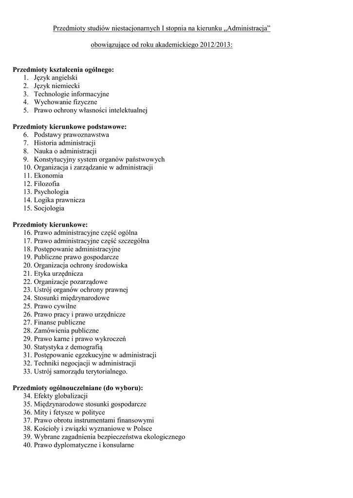 Przedmioty studiów niestacjonarnych I stopnia na kierunku „Administracja” obowiązujące od roku akademickiego 2012/2013: Przedmioty kształcenia ogólnego: 1. Język angielski 2. Język niemiecki 3. Technologie informacyjne 4. Wychowanie fizyczne 5. Prawo ochrony własności intelektualnej Przedmioty kierunkowe podstawowe: 6. Podstawy prawoznawstwa 7. Historia administracji 8. Nauka o administracji 9. Konstytucyjny system organów państwowych 10. Organizacja i zarządzanie w administracji 11. Ekonomia 12. Filozofia 13. Psychologia 14. Logika prawnicza 15. Socjologia Przedmioty kierunkowe: 16. Prawo administracyjne część ogólna 17. Prawo administracyjne część szczególna 18. Postępowanie administracyjne 19. Publiczne prawo gospodarcze 20. Organizacja ochrony środowiska 21. Etyka urzędnicza 22. Organizacje pozarządowe 23. Ustrój organów ochrony prawnej 24. Stosunki międzynarodowe 25. Prawo cywilne 26. Prawo pracy i prawo urzędnicze 27. Finanse publiczne 28. Zamówienia publiczne 29. Prawo karne i prawo wykroczeń 30. Statystyka z demografią 31. Postępowanie egzekucyjne w administracji 32. Techniki negocjacji w administracji 33. Ustrój samorządu terytorialnego. Przedmioty ogólnouczelniane (do wyboru): 34. Efekty globalizacji 35. Międzynarodowe stosunki gospodarcze 36. Mity i fetysze w polityce 37. Prawo obrotu instrumentami finansowymi 38. Kościoły i związki wyznaniowe w Polsce 39. Wybrane zagadnienia bezpieczeństwa ekologicznego 40. Prawo dyplomatyczne i konsularne Przedmioty modułowe Specjalność administracja sądowa Księgi wieczyste i postępowanie wieczystoksięgowe Mediacje w postępowaniach sądowych Ochrona danych osobowych i informacji niejawnych Organizacja i funkcjonowanie sądów i prokuratury Rejestry sądowe w prawie polskim Warsztaty modułowe Specjalność administracja bezpieczeństwa wewnętrznego Administrowanie sprawami bezpieczeństwa Bezpieczeństwo państwa Bezpieczeństwo społeczności lokalnych i kształtowanie bezpiecznych przestrzeni Zarządzanie w sytuacjach kryzysowych Zwalczanie przestępczości Warsztaty modułowe Specjalność administracja rządowa i służba cywilna Dostęp do informacji publicznej Organizacja pracy urzędu administracji publicznej Polityka społeczna Służba cywilna w Polsce i Europie Ustrój administracji rządowej Warsztaty modułowe Specjalność administracja samorządowa Gospodarka komunalna Polityka rozwoju lokalnego i regionalnego Prawo gospodarki nieruchomościami Prawo miejscowe System finansowy jednostek samorządu terytorialnego Warsztaty modułowe Specjalność zarządzanie publiczne Ekonomia sektora publicznego Kontrola zarządcza w jednostkach sektora finansów publicznych Partnerstwo publiczno-prywatne Pomoc publiczna dla przedsiębiorców Prawna ochrona obrotu gospodarczego Warsztaty modułowe