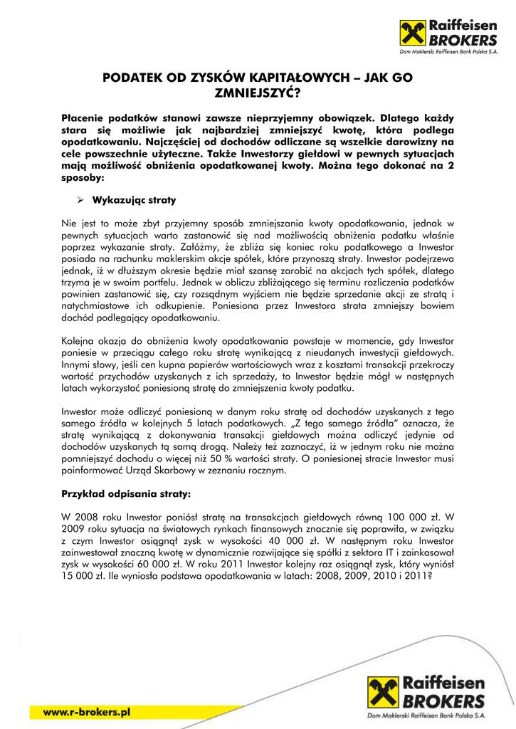 PODATEK OD ZYSKÓW KAPITAŁOWYCH – JAK GO ZMNIEJSZYĆ? Płacenie podatków stanowi zawsze nieprzyjemny obowiązek. Dlatego każdy stara się możliwie jak najbardziej zmniejszyć kwotę, która podlega opodatkowaniu. Najczęściej od dochodów odliczane są wszelkie darowizny na cele powszechnie użyteczne. Także Inwestorzy giełdowi w pewnych sytuacjach mają możliwość obniżenia opodatkowanej kwoty. Można tego dokonać na 2 sposoby: Wykazując straty Nie jest to może zbyt przyjemny sposób zmniejszania kwoty opodatkowania, jednak w pewnych sytuacjach warto zastanowić się nad możliwością obniżenia podatku właśnie poprzez wykazanie straty. Załóżmy, że zbliża się koniec roku podatkowego a Inwestor posiada na rachunku maklerskim akcje spółek, które przynoszą straty. Inwestor podejrzewa jednak, iż w dłuższym okresie będzie miał szansę zarobić na akcjach tych spółek, dlatego trzyma je w swoim portfelu. Jednak w obliczu zbliżającego się terminu rozliczenia podatków powinien zastanowić się, czy rozsądnym wyjściem nie będzie sprzedanie akcji ze stratą i natychmiastowe ich odkupienie. Poniesiona przez Inwestora strata zmniejszy bowiem dochód podlegający opodatkowaniu. Kolejna okazja do obniżenia kwoty opodatkowania powstaje w momencie, gdy Inwestor poniesie w przeciągu całego roku stratę wynikającą z nieudanych inwestycji giełdowych. Innymi słowy, jeśli cen kupna papierów wartościowych wraz z kosztami transakcji przekroczy wartość przychodów uzyskanych z ich sprzedaży, to Inwestor będzie mógł w następnych latach wykorzystać poniesioną stratę do zmniejszenia kwoty podatku. Inwestor może odliczyć poniesioną w danym roku stratę od dochodów uzyskanych z tego samego źródła w kolejnych 5 latach podatkowych. „Z tego samego źródła” oznacza, że stratę wynikającą z dokonywania transakcji giełdowych można odliczyć jedynie od dochodów uzyskanych tą samą drogą. Należy też zaznaczyć, iż w jednym roku nie można pomniejszyć dochodu o więcej niż 50 % wartości straty. O poniesionej stracie Inwestor musi poinformować Urząd Skarbowy w zeznaniu rocznym. Przykład odpisania straty: W 2008 roku Inwestor poniósł stratę na transakcjach giełdowych równą 100 000 zł. W 2009 roku sytuacja na światowych rynkach finansowych znacznie się poprawiła, w związku z czym Inwestor osiągnął zysk w wysokości 40 000 zł. W następnym roku Inwestor zainwestował znaczną kwotę w dynamicznie rozwijające się spółki z sektora IT i zainkasował zysk w wysokości 60 000 zł. W roku 2011 Inwestor kolejny raz osiągnął zysk, który wyniósł 15 000 zł. Ile wyniosła podstawa opodatkowania w latach: 2008, 2009, 2010 i 2011? 2008 Inwestor nie osiągnął żadnych opodatkowania wyniosła więc 0 zł. zysków kapitałowych. Podstawa 2009 Inwestor osiągnął dochód w wysokości 40 000 zł. Ponieważ można odliczyć do 50 % straty z poprzednich 5 lat (50 %×100 000 zł=50 000 zł), kwota podlegająca opodatkowaniu wyniosła 0 zł (gdyż strata pokryła cały zysk). 2010 Inwestor osiągnął dochód w wysokości 60 000 zł. Po odliczeniu max. 50 % straty podstawa opodatkowania wyniosła 10 000 zł (60 000 zł – 50 000 zł). 2011 Inwestor osiągnął dochód w wysokości 15 000 zł. W poprzednich latach odliczył on od zysków kapitałowych w sumie 90 000 zł straty. Pozostało mu więc jedynie 10 000 zł straty do odliczenia. W związku z tym dochód podlegający opodatkowaniu wyniósł 5 000 zł (15 000 zł – 10 000 zł). Kalkulując koszty Zdecydowanie przyjemniejszym sposobem ograniczania wielkości podatku giełdowego jest odliczanie od dochodu kosztów związanych z dokonywaniem inwestycji. Podstawowe koszty, tj. koszt zakupu walorów, prowizje i koszt prowadzenia rachunków, uwzględnia dom maklerski w przesyłanym Inwestorowi formularzu PIT-8C. Jednak niekiedy istnieją także dodatkowe koszty, których dom maklerski nie wykazał w rozliczeniu, a które mogą być odliczone od kwoty opodatkowania. Mogą to być np. koszty zakupu książek na temat inwestowania lub zaciągnięcie kredytu na poczet zakupu papierów wartościowych. Jeśli Inwestor będzie umiał udokumentować powstałe koszty i udowodnić ich związek z dokonywanymi inwestycjami, wówczas będzie mógł je odpisać od kwoty podlegającej opodatkowaniu.