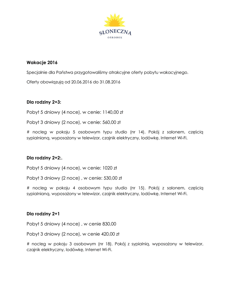 Wakacje 2016 Specjalnie dla Państwa przygotowaliśmy atrakcyjne oferty pobytu wakacyjnego. Oferty obowiązują od 20.06.2016 do 31.08.2016 Dla rodziny 2+3: Pobyt 5 dniowy (4 noce), w cenie: 1140,00 zł Pobyt 3 dniowy (2 noce), w cenie: 560,00 zł # nocleg w pokoju 5 osobowym typu studio (nr 14). Pokój z salonem, częścią sypialnianą, wyposażony w telewizor, czajnik elektryczny, lodówkę, Internet Wi-Fi. Dla rodziny 2+2:. Pobyt 5 dniowy (4 noce), w cenie: 1020 zł Pobyt 3 dniowy (2 noce) , w cenie: 530,00 zł # nocleg w pokoju 4 osobowym typu studio (nr 15). Pokój z salonem, częścią sypialnianą, wyposażony w telewizor, czajnik elektryczny, lodówkę, Internet Wi-Fi. Dla rodziny 2+1 Pobyt 5 dniowy (4 noce) , w cenie 830,00 Pobyt 3 dniowy (2 noce), w cenie 420,00 zł # nocleg w pokoju 3 osobowym (nr 18). Pokój z sypialnią, wyposażony w telewizor, czajnik elektryczny, lodówkę, Internet Wi-Fi. Dla dwojga Pobyt 5 dniowy (4 noce), w cenie: 675,00 zł Pobyt 3 dniowy (2 noce), w cenie: 340,00 zł # nocleg w pokoju 2 osobowym (nr 11, 12, 13, 16, 17, 19). Pokój z sypialnią, wyposażony w telewizor, czajnik elektryczny, lodówkę, Internet Wi-Fi. W cenie wakacji: # wyżywienie: śniadanie oraz dwudaniowy obiad. # podczas pobytu krajoznawcza wycieczka bryczką po okolicznych lasach # leżaki plażowe dostępne dla Gości hotelowych w recepcji # dla najmłodszych, kącik zabaw w restauracji, codziennie bajki dla dzieci w ogródku # dodatkowo możliwość wyposażenia pokoju w : łóżeczko dziecięce, podgrzewacz do butelek, wanienkę dziecięcą # możliwość przedłużenia pobytu za dodatkową opłatą. Oferty obowiązują od 20.06. do 31.08.2016