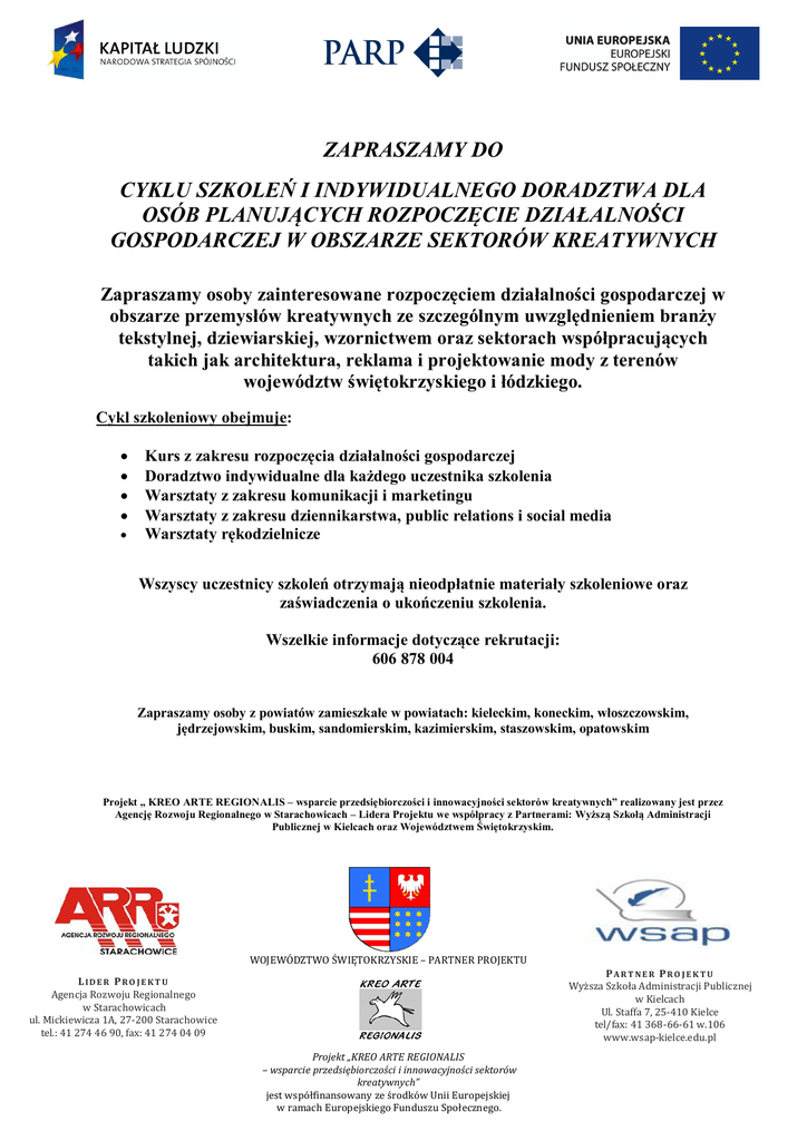 ZAPRASZAMY DO CYKLU SZKOLEŃ I INDYWIDUALNEGO DORADZTWA DLA OSÓB PLANUJĄCYCH ROZPOCZĘCIE DZIAŁALNOŚCI GOSPODARCZEJ W OBSZARZE SEKTORÓW KREATYWNYCH Zapraszamy osoby zainteresowane rozpoczęciem działalności gospodarczej w obszarze przemysłów kreatywnych ze szczególnym uwzględnieniem branży tekstylnej, dziewiarskiej, wzornictwem oraz sektorach współpracujących takich jak architektura, reklama i projektowanie mody z terenów województw świętokrzyskiego i łódzkiego. Cykl szkoleniowy obejmuje: Kurs z zakresu rozpoczęcia działalności gospodarczej Doradztwo indywidualne dla każdego uczestnika szkolenia Warsztaty z zakresu komunikacji i marketingu Warsztaty z zakresu dziennikarstwa, public relations i social media Warsztaty rękodzielnicze Wszyscy uczestnicy szkoleń otrzymają nieodpłatnie materiały szkoleniowe oraz zaświadczenia o ukończeniu szkolenia. Wszelkie informacje dotyczące rekrutacji: 606 878 004 Zapraszamy osoby z powiatów zamieszkałe w powiatach: kieleckim, koneckim, włoszczowskim, jędrzejowskim, buskim, sandomierskim, kazimierskim, staszowskim, opatowskim Projekt „ KREO ARTE REGIONALIS – wsparcie przedsiębiorczości i innowacyjności sektorów kreatywnych” realizowany jest przez Agencję Rozwoju Regionalnego w Starachowicach – Lidera Projektu we współpracy z Partnerami: Wyższą Szkołą Administracji Publicznej w Kielcach oraz Województwem Świętokrzyskim. WOJEWÓDZTWO ŚWIĘTOKRZYSKIE – PARTNER PROJEKTU PARTNER PRO JEKTU Wyższa Szkoła Administracji Publicznej w Kielcach Ul. Staffa 7, 25-410 Kielce tel/fax: 41 368-66-61 w.106 www.wsap-kielce.edu.pl LIDER PRO JEKT U Agencja Rozwoju Regionalnego w Starachowicach ul. Mickiewicza 1A, 27-200 Starachowice tel.: 41 274 46 90, fax: 41 274 04 09 Projekt „KREO ARTE REGIONALIS – wsparcie przedsiębiorczości i innowacyjności sektorów kreatywnych” jest współfinansowany ze środków Unii Europejskiej w ramach Europejskiego Funduszu Społecznego.