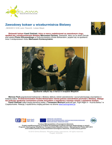 Zawodowy bokser u wiceburmistrza Bielawy , 06/03/2013 12:00, autor: Rzecznik - Łukasz Masyk Bielawski bokser Kamil Zieliński, który w marcu zadebiutował na zawodowym ringu, spotkał się z wiceburmistrzem Bielawy Mariuszem Pachem. Zawodnik, który na co dzień trenuje pod opieką Piotra Wilczewskiego w Dzierżoniowskim Klubie Bokserskim, pojawił się na spotkaniu wraz z wiceprezesem klubu Mariuszem Konieczyńskim. Spotkanie odbyło się 5 marca w Urzędzie Miejskim Mariusz Pach pogratulował bokserowi z Bielawy debiutu wśród zawodowców i życzył pierwszego zwycięstwa w kolejnej walce. W Dzierżoniowskim Klubie Bokserskim niemal połowa zawodników pochodzi z Bielawy, dlatego też podczas spotkania rozmawiano przede wszystkim o współpracy naszego miasta z sąsiednim klubem. Kamil Zieliński odbył swoją pierwszą walkę z Tomaszem Moznym podczas gali „Fight Night 4 – Kuźnia Boksu” w Częstochowie. Relację z wydarzenia znajdą państwo na stronie www.boxingnews.pl. © 2010 Gmina Bielawa. Wszelkie prawa zastrzeżone. All rights reserved. Projekt: XOOOM