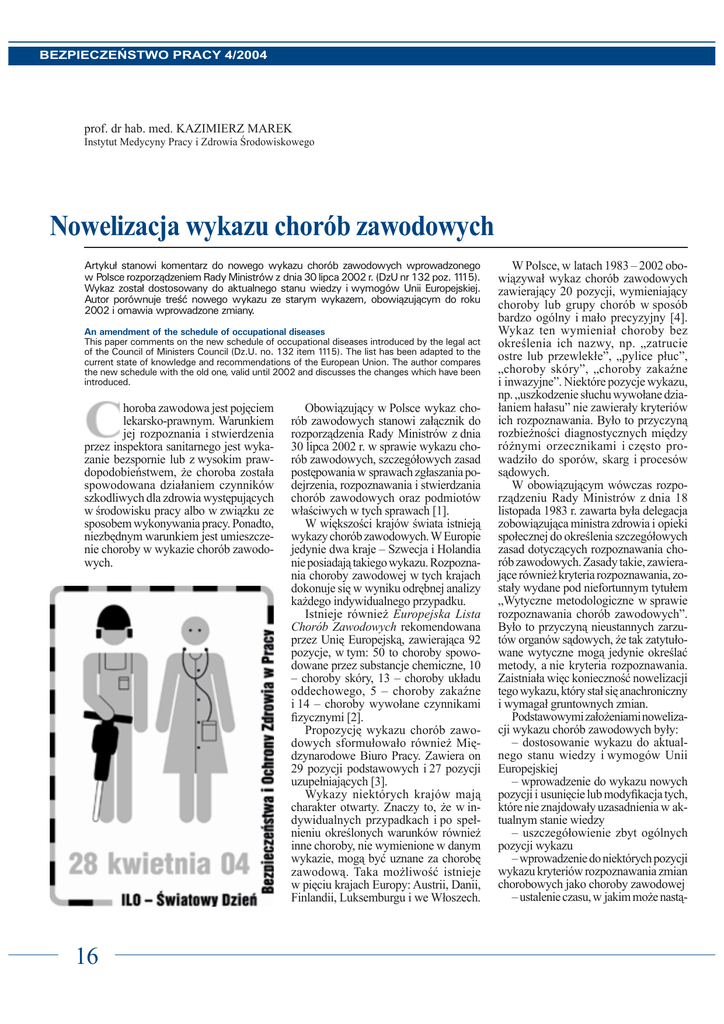 BEZPIECZEŃSTWO PRACY 4/2004 prof. dr hab. med. KAZIMIERZ MAREK Instytut Medycyny Pracy i Zdrowia Środowiskowego Nowelizacja wykazu chorób zawodowych Artykuł stanowi komentarz do nowego wykazu chorób zawodowych wprowadzonego w Polsce rozporządzeniem Rady Ministrów z dnia 30 lipca 2002 r. (DzU nr 132 poz. 1115). Wykaz został dostosowany do aktualnego stanu wiedzy i wymogów Unii Europejskiej. Autor porównuje treść nowego wykazu ze starym wykazem, obowiązującym do roku 2002 i omawia wprowadzone zmiany. An amendment of the schedule of occupational diseases This paper comments on the new schedule of occupational diseases introduced by the legal act of the Council of Ministers Council (Dz.U. no. 132 item 1115). The list has been adapted to the current state of knowledge and recommendations of the European Union. The author compares the new schedule with the old one, valid until 2002 and discusses the changes which have been introduced. horoba zawodowa jest pojęciem lekarsko-prawnym. Warunkiem jej rozpoznania i stwierdzenia przez inspektora sanitarnego jest wykazanie bezspornie lub z wysokim prawdopodobieństwem, że choroba została spowodowana działaniem czynników szkodliwych dla zdrowia występujących w środowisku pracy albo w związku ze sposobem wykonywania pracy. Ponadto, niezbędnym warunkiem jest umieszczenie choroby w wykazie chorób zawodowych. 16 Obowiązujący w Polsce wykaz chorób zawodowych stanowi załącznik do rozporządzenia Rady Ministrów z dnia 30 lipca 2002 r. w sprawie wykazu chorób zawodowych, szczegółowych zasad postępowania w sprawach zgłaszania podejrzenia, rozpoznawania i stwierdzania chorób zawodowych oraz podmiotów właściwych w tych sprawach [1]. W większości krajów świata istnieją wykazy chorób zawodowych. W Europie jedynie dwa kraje – Szwecja i Holandia nie posiadają takiego wykazu. Rozpoznania choroby zawodowej w tych krajach dokonuje się w wyniku odrębnej analizy każdego indywidualnego przypadku. Istnieje również Europejska Lista Chorób Zawodowych rekomendowana przez Unię Europejską, zawierająca 92 pozycje, w tym: 50 to choroby spowodowane przez substancje chemiczne, 10 – choroby skóry, 13 – choroby układu oddechowego, 5 – choroby zakaźne i 14 – choroby wywołane czynnikami fizycznymi [2]. Propozycję wykazu chorób zawodowych sformułowało również Międzynarodowe Biuro Pracy. Zawiera on 29 pozycji podstawowych i 27 pozycji uzupełniających [3]. Wykazy niektórych krajów mają charakter otwarty. Znaczy to, że w indywidualnych przypadkach i po spełnieniu określonych warunków również inne choroby, nie wymienione w danym wykazie, mogą być uznane za chorobę zawodową. Taka możliwość istnieje w pięciu krajach Europy: Austrii, Danii, Finlandii, Luksemburgu i we Włoszech. W Polsce, w latach 1983 – 2002 obowiązywał wykaz chorób zawodowych zawierający 20 pozycji, wymieniający choroby lub grupy chorób w sposób bardzo ogólny i mało precyzyjny [4]. Wykaz ten wymieniał choroby bez określenia ich nazwy, np. „zatrucie ostre lub przewlekłe”, „pylice płuc”, „choroby skóry”, „choroby zakaźne i inwazyjne”. Niektóre pozycje wykazu, np. „uszkodzenie słuchu wywołane działaniem hałasu” nie zawierały kryteriów ich rozpoznawania. Było to przyczyną rozbieżności diagnostycznych między różnymi orzecznikami i często prowadziło do sporów, skarg i procesów sądowych. W obowiązującym wówczas rozporządzeniu Rady Ministrów z dnia 18 listopada 1983 r. zawarta była delegacja zobowiązująca ministra zdrowia i opieki społecznej do określenia szczegółowych zasad dotyczących rozpoznawania chorób zawodowych. Zasady takie, zawierające również kryteria rozpoznawania, zostały wydane pod niefortunnym tytułem „Wytyczne metodologiczne w sprawie rozpoznawania chorób zawodowych”. Było to przyczyną nieustannych zarzutów organów sądowych, że tak zatytułowane wytyczne mogą jedynie określać metody, a nie kryteria rozpoznawania. Zaistniała więc konieczność nowelizacji tego wykazu, który stał się anachroniczny i wymagał gruntownych zmian. Podstawowymi założeniami nowelizacji wykazu chorób zawodowych były: – dostosowanie wykazu do aktualnego stanu wiedzy i wymogów Unii Europejskiej – wprowadzenie do wykazu nowych pozycji i usunięcie lub modyfikacja tych, które nie znajdowały uzasadnienia w aktualnym stanie wiedzy – uszczegółowienie zbyt ogólnych pozycji wykazu – wprowadzenie do niektórych pozycji wykazu kryteriów rozpoznawania zmian chorobowych jako choroby zawodowej – ustalenie czasu, w jakim może nastą- BEZPIECZEŃSTWO PRACY 4/2004 W nowym wykazie nie znalazły się następujące choroby: 1) rozedma płuc u dmuchaczy szkła i muzyków orkiestr dętych; w świetle aktualnego stanu wiedzy brak jest dowodów, że natężone wydechy mogą spowodować rozedmę płuc, 2) choroby wywołane działaniem przeciążeń grawitacyjnych (przyspieszeń); choroby te w większym stopniu odpowiadają kryteriom wypadku, a ponadto mogą się zdarzyć u lotników – zwłaszcza samolotów wojskowych – i są wówczas oceniane według odrębnych przepisów, 3) choroby ośrodkowego układu nerwowego, układu bodźcotwórczego i przewodzącego serca oraz gonad wywołane działaniem pól elektromagnetycznych; wielu autorów opisuje ujemne skutki zdrowotne tego narażenia, jednak wyniki badań nie są jednoznaczne, a objawy chorobowe mało swoiste i nie pozwalają na wyodrębnienie określonych jednostek chorobowych odpowiadających definicji choroby zawodowej. Obecnie obowiązujący wykaz chorób zawodowych różni się znacznie od poprzedniego także stopniem szczegółowości, np.: – wprowadzono 57 nazw substancji chemicznych wywołujących zatrucia ostre albo przewlekłe lub ich następstwa – w pkt. 3 wymieniono 5 najczęściej występujących pylic – w pkt.16 wymieniono 6 chorób wywołanych działaniem promieniowania jonizującego 
