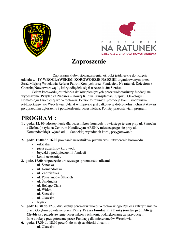 Zaproszenie Zapraszam kluby, stowarzyszenia, ośrodki jeździeckie do wzięcia udziału w IV WROCŁAWSKIM KOROWODZIE NADZIEI organizowanym przez Straż Miejską Wrocławia Referat Patroli Konnych oraz Fundację „ Na ratunek Dzieciom z Chorobą Nowotworową ” , który odbędzie się 5 września 2015 roku. Celem korowodu jest zbiórka datków pieniężnych przez wolontariuszy fundacji na wyposażenie Przylądka Nadziei – nowej Kliniki Transplantacji Szpiku, Onkologii i Hematologii Dziecięcej we Wrocławiu. Będzie to również promocja koni i środowiska jeździeckiego we Wrocławiu. Udział w imprezie jest całkowicie dobrowolny i charytatywny po uprzednim zgłoszeniu i potwierdzeniu uczestnictwa. Poniżej przedstawiam program PROGRAM : 1 . godz. 12. 00 udostępnienie dla uczestników konnych trawiastego terenu przy ul. Sanocka a Ślężna ( z tyłu za Centrum Handlowym ARENA mieszczącego się przy ul. Komandorskiej) wjazd od ul. Sanockiej wyładunek koni , przygotowanie 2. godz. 15.00 do 16.00 powitanie uczestników przemarszu i utworzenie korowodu - orkiestra - piesi uczestnicy korowodu - bryczki z podopiecznymi fundacji - konni uczestnicy 3. godz. 16.00 rozpoczęcie uroczystego przemarszu ulicami - ul. Sanocka - ul. Komandorska - ul. Zaolziańska - ul. Powstańców Śląskich - ul. Świdnicka - ul. Bożego Ciała - ul. Widok - ul. Szewska - ul. Oławska - Rynek 5. godz.16.30 do 17.30 dwukrotny przemarsz wokół Wrocławskiego Rynku i zatrzymanie na placu Gołębim powitanie przez Panią Prezes Fundacji i i Panią senator prof. Alicję Chybicką , przedstawienie uczestników i ich koni, podziękowanie za przybycie . Inne atrakcje przygotowane przez Fundację dla mieszkańców Wrocławia 6. godz. 17.30 do 18.00 powrót do miejsca zbiórki ulicami : - ul. Oławska - ul. Szewska - ul. Widok - plac Teatralny - ul. Świdnicka - ul. Powstańców Śląskich - ul . Szczęśliwa - ul. Komandorska - ul. Sanocka 7. godz.18.00 zakończenie, podziękowania , rozwiązanie parady konnej i poczęstunek dla uczestników. Pozostawione na miejscu zbiórki samochody i przyczepy będą zabezpieczane przez funkcjonariuszy Straży Miejskiej Wrocławia . Bardzo proszę o przemyślany dobór koni i jeźdźców ze względu na bezpieczeństwo swoje, swoich koni i innych uczestników spotkania. Będziemy poruszać się kolumną w ruchu ulicznym ,po kostce brukowej i asfalcie. Trzeba przygotować się na bardzo dużo bodźców wzrokowych i dźwiękowych dla koni jeżeli chodzi o przemarsz w Rynku . Liczę na profesjonalizm osób zgłaszających się świadomych własnych umiejętności i znających własne konie . Przejście całej trasy zabezpieczy policja drogowa. Straż Miejska nie ponosi odpowiedzialności za wypadki powstałe w trakcie korowodu. W przypadku zainteresowania bardzo proszę o kontakt na maila [email protected] wyślę druk zgłoszenia Potwierdzone zgłoszenia zbieramy do 21.08.2015r ze względu na sprawy organizacyjne Zbigniew Golonka Kierownik Referatu Patroli Konnych Straży Miejskiej Wrocławia