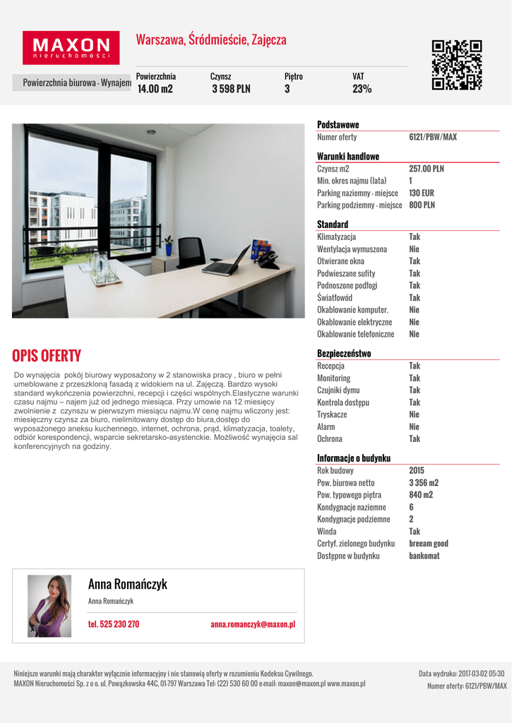 Warszawa, Śródmieście, Zajęcza Powierzchnia biurowa - Wynajem Powierzchnia 14.00 m2 Czynsz 3 598 PLN Piętro VAT 3 23% Podstawowe Numer oferty 6121/PBW/MAX Warunki handlowe Czynsz m2 257.00 PLN Min. okres najmu (lata) 1 Parking naziemny - miejsce 130 EUR Parking podziemny - miejsce 800 PLN Standard Klimatyzacja Tak Wentylacja wymuszona Nie Otwierane okna Tak Podwieszane sufity Tak Podnoszone podłogi Tak Światłowód Tak Okablowanie komputer. Nie Okablowanie elektryczne Nie Okablowanie telefoniczne Nie OPIS OFERTY Bezpieczeństwo Do wynajęcia pokój biurowy wyposażony w 2 stanowiska pracy , biuro w pełni umeblowane z przeszkloną fasadą z widokiem na ul. Zajęczą. Bardzo wysoki standard wykończenia powierzchni, recepcji i części wspólnych.Elastyczne warunki czasu najmu – najem już od jednego miesiąca. Przy umowie na 12 miesięcy zwolnienie z czynszu w pierwszym miesiącu najmu.W cenę najmu wliczony jest: miesięczny czynsz za biuro, nielimitowany dostęp do biura,dostęp do wyposażonego aneksu kuchennego, internet, ochrona, prąd, klimatyzacja, toalety, odbiór korespondencji, wsparcie sekretarsko-asystenckie. Możliwość wynajęcia sal konferencyjnych na godziny. Recepcja Tak Monitoring Tak Czujniki dymu Tak Kontrola dostępu Tak Tryskacze Nie Alarm Nie Ochrona Tak Informacje o budynku Rok budowy 2015 Pow. biurowa netto 3 356 m2 Pow. typowego piętra 840 m2 Kondygnacje naziemne 6 Kondygnacje podziemne 2 Winda Tak Certyf. zielonego budynku breeam good Dostępne w budynku bankomat Anna Romańczyk Anna Romańczyk tel. 525 230 270 [email protected] Niniejsze warunki mają charakter wyłącznie informacyjny i nie stanowią oferty w rozumieniu Kodeksu Cywilnego. MAXON Nieruchomości Sp. z o o. ul. Powązkowska 44C, 01-797 Warszawa Tel: (22) 530 60 00 e-mail: [email protected] www.maxon.pl Data wydruku: 2017-03-02 05:30 Numer oferty: 6121/PBW/MAX