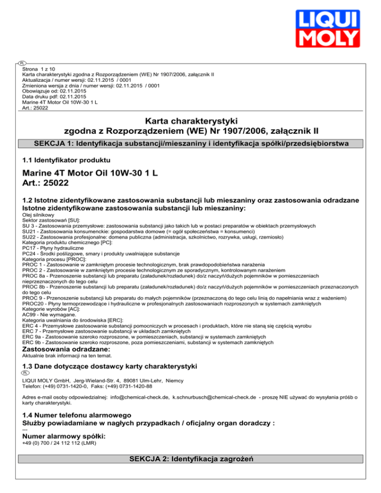 Strona 1 z 10 Karta charakterystyki zgodna z Rozporządzeniem (WE) Nr 1907/2006, załącznik II Aktualizacja / numer wersji: 02.11.2015 / 0001 Zmieniona wersja z dnia / numer wersji: 02.11.2015 / 0001 Obowiązuje od: 02.11.2015 Data druku pdf: 02.11.2015 Marine 4T Motor Oil 10W-30 1 L Art.: 25022 Karta charakterystyki zgodna z Rozporządzeniem (WE) Nr 1907/2006, załącznik II SEKCJA 1: Identyfikacja substancji/mieszaniny i identyfikacja spółki/przedsiębiorstwa 1.1 Identyfikator produktu Marine 4T Motor Oil 10W-30 1 L Art.: 25022 1.2 Istotne zidentyfikowane zastosowania substancji lub mieszaniny oraz zastosowania odradzane Istotne zidentyfikowane zastosowania substancji lub mieszaniny: Olej silnikowy Sektor zastosowań [SU]: SU 3 - Zastosowania przemysłowe: zastosowania substancji jako takich lub w postaci preparatów w obiektach przemysłowych SU21 - Zastosowania konsumenckie: gospodarstwa domowe (= ogół społeczeństwa = konsumenci) SU22 - Zastosowania profesjonalne: domena publiczna (administracja, szkolnictwo, rozrywka, usługi, rzemiosło) Kategoria produktu chemicznego [PC]: PC17 - Płyny hydrauliczne PC24 - Środki poślizgowe, smary i produkty uwalniające substancje Kategoria procesu [PROC]: PROC 1 - Zastosowanie w zamkniętym procesie technologicznym, brak prawdopodobieństwa narażenia PROC 2 - Zastosowanie w zamkniętym procesie technologicznym ze sporadycznym, kontrolowanym narażeniem PROC 8a - Przenoszenie substancji lub preparatu (załadunek/rozładunek) do/z naczyń/dużych pojemników w pomieszczeniach nieprzeznaczonych do tego celu PROC 8b - Przenoszenie substancji lub preparatu (załadunek/rozładunek) do/z naczyń/dużych pojemników w pomieszczeniach przeznaczonych do tego celu PROC 9 - Przenoszenie substancji lub preparatu do małych pojemników (przeznaczoną do tego celu linią do napełniania wraz z ważeniem) PROC20 - Płyny termoprzewodzące i hydrauliczne w profesjonalnych zastosowaniach rozproszonych w systemach zamkniętych Kategorie wyrobów [AC]: AC99 - Nie wymagane. Kategoria uwalniania do środowiska [ERC]: ERC 4 - Przemysłowe zastosowanie substancji pomocniczych w procesach i produktach, które nie staną się częścią wyrobu ERC 7 - Przemysłowe zastosowanie substancji w układach zamkniętych ERC 9a - Zastosowanie szeroko rozproszone, w pomieszczeniach, substancji w systemach zamkniętych ERC 9b - Zastosowanie szeroko rozproszone, poza pomieszczeniami, substancji w systemach zamkniętych Zastosowania odradzane: Aktualnie brak informacji na ten temat. 1.3 Dane dotyczące dostawcy karty charakterystyki LIQUI MOLY GmbH, Jerg-Wieland-Str. 4, 89081 Ulm-Lehr, Niemcy Telefon: (+49) 0731-1420-0, Faks: (+49) 0731-1420-88 Adres e-mail osoby odpowiedzialnej: [email protected], [email protected] - proszę NIE używać do wysyłania próśb o karty charakterystyki. 1.4 Numer telefonu alarmowego Służby powiadamiane w nagłych przypadkach / oficjalny organ doradczy : --- Numer alarmowy spółki: +49 (0) 700 / 24 112 112 (LMR) SEKCJA 2: Identyfikacja zagrożeń Strona 2 z 10 Karta charakterystyki zgodna z Rozporządzeniem (WE) Nr 1907/2006, załącznik II Aktualizacja / numer wersji: 02.11.2015 / 0001 Zmieniona wersja z dnia / numer wersji: 02.11.2015 / 0001 Obowiązuje od: 02.11.2015 Data druku pdf: 02.11.2015 Marine 4T Motor Oil 10W-30 1 L Art.: 25022 2.1 Klasyfikacja substancji lub mieszaniny Klasyfikacja zgodnie z rozporządzeniem (WE) Nr 1272/2008 (CLP) Zgodnie z rozporządzeniem (WE) Nr 1272/2008 (CLP) mieszanina nie została sklasyfikowana jako niebezpieczna. 2.2 Elementy oznakowania Oznakowanie zgodnie z rozporządzeniem (WE) Nr 1272/2008 (CLP) EUH210-Karta charakterystyki dostępna na żądanie. 2.3 Inne zagrożenia Mieszanina nie zawiera substancji vPvB (vPvB = very persistent, very bioaccumulative) bądź nie jest wykazana w załączniku XIII rozporządzenia (WE) 1907/2006. Mieszanina nie zawiera substancji PBT (PBT = persistent, bioaccumulative, toxic) bądź nie jest wykazana w załączniku XIII rozporządzenia (WE) 1907/2006. Produkty rozkładu przy spalaniu fluorowanych polimerów mogą powodować u ludzi gorączkę polimerową z objawami grypopodobnymi. Rozporządzenie (WE) Nr 648/2004 n.s. SEKCJA 3: Skład/informacja o składnikach 3.1 Substancja n.s. 3.2 Mieszanina Oleju mineralnego Numer rejestracji (REACH) Index EINECS, ELINCS, NLP CAS Stęż.% Klasyfikacja zgodnie z rozporządzeniem (WE) Nr 1272/2008 (CLP) -----1-5 Asp. Tox. 1, H304 Tekst formuł H, a także ich kod klasyfikacji (GHS/CLP) patrz sekcja 16. Substancje wymienione w tym punkcie mają określoną faktycznie obowiązującą klasyfikację! W przypadku substancji wymienionych w załączniku VI, tabela 3.1/3.2 rozporządzenia (WE) nr 1272/2008 (rozporządzenie CLP) oznacza to, że zostały uwzględnione wszystkie ewentualne wymienione tam uwagi dla podanej tutaj klasyfikacji. SEKCJA 4: Środki pierwszej pomocy 4.1 Opis środków pierwszej pomocy Drogi oddechowe Osobie zapewnić dopływ świeżego powietrza, w zależności od objawów skonsultować się z lekarzem. Kontakt ze skórą Zanieczyszczone, nasączone ubranie należy niezwłocznie zdjąć, dokładnie wyprać w wodzie z mydłem, w razie podrażnienia skóry (zaczerwienienie itd.), zasięgnać porady lekarskiej. Kontakt z oczami Usunąć szkła kontaktowe. Przez kilka minut dokładnie spłukać dużą ilością wody, jeżeli potrzeba, udać się do lekarza. Drogi pokarmowe Jamę ustną dokładnie przepłukać wodą. Nie wywoływać wymiotów, natychmiast udać się do lekarza. 4.2 Najważniejsze ostre i opóźnione objawy oraz skutki narażenia Jeśli dotyczy, objawy występujące z opóźnieniem i działanie podane są w punkcie 11. lub wśród dróg wchłaniania w punkcie 4.1. Strona 3 z 10 Karta charakterystyki zgodna z Rozporządzeniem (WE) Nr 1907/2006, załącznik II Aktualizacja / numer wersji: 02.11.2015 / 0001 Zmieniona wersja z dnia / numer wersji: 02.11.2015 / 0001 Obowiązuje od: 02.11.2015 Data druku pdf: 0