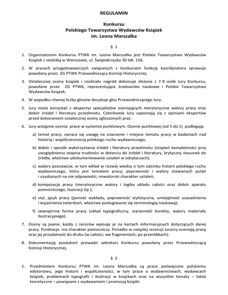 REGULAMIN Konkursu Polskiego Towarzystwa Wydawców Książek im. Leona Marszałka § 1 1. Organizatorem Konkursu PTWK im. Leona Marszałka jest Polskie Towarzystwo Wydawców Książek z siedzibą w Warszawie, ul. Świętokrzyska 30 lok. 156. 2. W pracach przygotowawczych związanych z konkursem funkcję koordynatora sprawuje powołany przez ZG PTWK Przewodniczący Komisji Historycznej. 3. Ostatecznej oceny książek i rozdziału nagród dokonuje złożone z 7-9 osób Jury Konkursu, powołane przez ZG PTWK, reprezentujące środowisko naukowe i Polskie Towarzystwo Wydawców Książek. 4. W wypadku równej liczby głosów decyduje głos Przewodniczącego Jury. 5. Jury może korzystać z ekspertyz specjalistów oceniających merytoryczne walory pracy oraz dobór źródeł i literatury przedmiotu. Członkowie Jury zapoznają się z opiniami ekspertów przed dokonaniem ostatecznej oceny zgłoszonych prac. 6. Jury wstępnie ocenia prace w systemie punktowym. Ocenie punktowej (od 5 do 1) podlegają: a) temat pracy; zwraca się uwagę na znaczenie i miejsce tematu pracy w badaniach nad historią i współczesnością polskiego ruchu wydawniczego; b) dobór i sposób wykorzystania źródeł i literatury przedmiotu (stopień kompletności przy uwzględnieniu stopnia trudności w dotarciu do źródeł i literatury, krytyczny stosunek do źródła, właściwe udokumentowanie ustaleń w odsyłaczach); c) walory poznawcze, w tym wkład w rozwój wiedzy o tym odcinku historii polskiego ruchu wydawniczego, który jest tematem pracy; poprawność i walory stawianych pytań i uzyskanych na nie odpowiedzi, nowatorski charakter ustaleń; d) kompozycja pracy (merytoryczne walory i logika układu całości oraz dobór aparatu pomocniczego, ilustracji itp.); e) styl, język pracy (jasność wykładu, poprawność stylistyczna, umiejętność uzasadnienia i wyjaśnienia twierdzeń, właściwe posługiwanie się terminologią naukową); f) zewnętrzna forma pracy (układ typograficzny, staranność korekty, walory materiału ilustracyjnego). 7. Oceny są jawne, każdy z Jurorów wpisuje je na kartach informacyjnych dotyczących danej pracy. Punktacja ma charakter pomocniczy. Ponadto w zwięzłej recenzji Jurorzy oceniają pracę oraz jej przydatność do druku (w całości; we fragmentach; po przeróbkach). 8. Dokumentację posiedzeń prowadzi sekretarz Konkursu powołany przez Przewodniczącą Komisji Historycznej. § 2 1. Przedmiotem Konkursu PTWK im. Leona Marszałka są prace poświęcone polskiemu edytorstwu, jego historii i współczesności, w tym prace o wydawnictwach, wydawcach książek, problemach typografii i ilustracji w książkach oraz na wszystkie tematy – także teoretyczne – powiązane z wydawaniem i promocją książki. 2. Prace mogą być zgłaszane przez ich autorów oraz opiekunów naukowych. 3. Prace rozpatrywane będą w kategoriach: a) prace doktorskie b) prace magisterskie c) prace licencjackie 4. Prace powinny być nadsyłane w wersji papierowej i elektronicznej. § 3 Konkurs PTWK im. Leona Marszałka odbywa się co 4 lata. §4 1. Z nadesłanych na Konkurs prac Jury wyłania grupę nominowanych do nagrody w każdej z trzech kategorii. 2. W ostatnim etapie Jury przyznaje w jawnym głosowaniu 3 nagrody (po jednej w każdej kategorii) i wyróżnienia. 3. Autorzy nagrodzonych prac mogą otrzymać nagrody pieniężne. 4. Rodzaj i wysokość nagród pieniężnych określa Zarząd Główny PTWK. § 5 Wyniki Konkursu podawane są do powszechnej wiadomości w prasie i innych środkach masowego przekazu. § 6 Wręczenie nagród i dyplomów następuje podczas uroczystości kończącej konkurs. Organizatorzy przewidują możliwość dodatkowych spotkań promocyjnych z laureatami. § 7 Szczegółowe zasady organizacyjne poszczególnych edycji Konkursu ustalane są przez organizatora w odrębnej dokumentacji. §8 Laureatom przybywającym na uroczystość wręczenia nagród przysługuje zwrot kosztów podróży. §9 Po zakończeniu Konkursu autorzy otrzymują zwrot prac w wersji drukowanej. Regulamin Konkursu PTWK im. Leona Marszałka i Regulamin prac jury konkursu KLM zatwierdzony w dniu 19 listopada 2013 r. przez Zarząd Główny PTWK REGULAMIN PRAC JURY KONKURSU PTWK im. LEONA MARSZAŁKA 1. Jury wstępnie ocenia prace w systemie punktowym. Ocenie punktowej (od 5 do 1) podlegają: a) Temat pracy. Zwraca się uwagę na znaczenie i miejsce tematu pracy w badaniach nad historią i współczesnością polskiego ruchu wydawniczego. b) Dobór i sposób wykorzystania źródeł oraz literatury przedmiotu (stopień kompletności przy uwzględnieniu stopnia trudności w dotarciu do źródeł i literatury, krytyczny stosunek do źródła, właściwe udokumentowanie ustaleń w odsyłaczach). c) Walory poznawcze, w tym wkład w rozwój wiedzy o tym odcinku historii polskiego ruchu wydawniczego, który jest tematem pracy; poprawność i walory stawianych pytań oraz uzyskanych na nie odpowiedzi, nowatorski charakter ustaleń. d) Kompozycja pracy (merytoryczne walory i logika układu całości oraz dobór aparatu pomocniczego, ilustracji itp.). e) Styl, język pracy (jasność wykładu, poprawność stylistyczna, umiejętność uzasadnienia i wyjaśnienia twierdzeń, właściwe posługiwanie się terminologią naukową). f) Zewnętrzna forma pracy (układ typograficzny, staranność korekty, walory materiału ilustracyjnego). 2. Oceny są jawne, każdy z Jurorów wpisuje je na kartach informacyjnych dotyczących danej pracy. Punktacja ma charakter pomocniczy. 3. Ponadto w zwięzłej recenzji Jurorzy oceniają pracę oraz jej przydatność do druku (w całości; we fragmentach; po gruntownych przeróbkach). 4. Jury może korzystać z ekspertyz specjalistów. Jury decyduje, czy powołani będą eksperci i kto spełniał tę rolę. Członkowie Jury zapoznają się z opiniami ekspertów przed dokonaniem ostatecznej oceny zgłoszonych prac. 5. Przyznanie nagród i wyróżnień następuje na zebraniu Jury po dyskus
