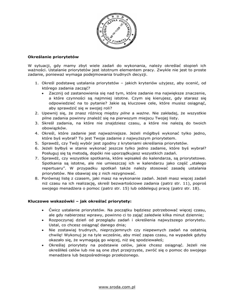 www.sroda.com.pl Określanie priorytetów W sytuacji, gdy mamy zbyt