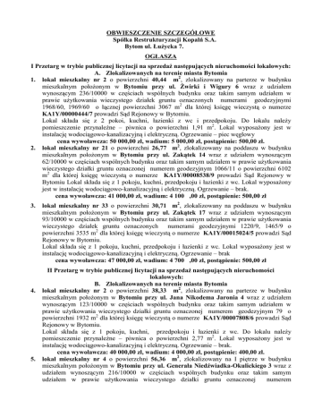 OBWIESZCZENIE SZCZEGÓŁOWE Spółka Restrukturyzacji Kopalń S.A. Bytom ul. Łużycka 7. OGŁASZA I Przetarg w trybie publicznej licytacji na sprzedaż następujących nieruchomości lokalowych: A. Zlokalizowanych na terenie miasta Bytomia 1. lokal mieszkalny nr 2 o powierzchni 40,44 m2, zlokalizowany na parterze w budynku mieszkalnym położonym w Bytomiu przy ul. Żwirki i Wigury 6 wraz z udziałem wynoszącym 236/10000 w częściach wspólnych budynku oraz takim samym udziałem w prawie użytkowania wieczystego działek gruntu oznaczonych numerami geodezyjnymi 1968/60, 1969/60 o łącznej powierzchni 3067 m2 dla której księgę wieczystą o numerze KA1Y/00000444/7 prowadzi Sąd Rejonowy w Bytomiu. Lokal składa się z 2 pokoi, kuchni, łazienki z wc i przedpokoju. Do lokalu należy pomieszczenie przynależne – piwnica o powierzchni 1,91 m2. Lokal wyposażony jest w instalację wodociągowo-kanalizacyjną i elektryczną. Ogrzewanie – piec węglowy cena wywoławcza: 50 000,00 zł, wadium: 5 000,00 zł, postąpienie: 500,00 zł. 2. lokal mieszkalny nr 21 o powierzchni 26,77 m2, zlokalizowany na poddaszu w budynku mieszkalnym położonym w Bytomiu przy ul. Zakątek 14 wraz z udziałem wynoszącym 62/10000 w częściach wspólnych budynku oraz takim samym udziałem w prawie użytkowania wieczystego działki gruntu oznaczonej numerem geodezyjnym 1066/11 o powierzchni 6102 m2 dla której księgę wieczystą o numerze KA1Y/00008538/9 prowadzi Sąd Rejonowy w Bytomiu Lokal składa się z 1 pokoju, kuchni, przedpokoju i łazienki z wc. Lokal wyposażony jest w instalację wodociągowo-kanalizacyjną i elektryczną. Ogrzewanie – brak. cena wywoławcza: 41 000,00 zł, wadium: 4 100 ,00 zł, postąpienie: 500,00 zł 3. 4. 5. lokal mieszkalny nr 33 o powierzchni 30,71 m2, zlokalizowany na poddaszu w budynku mieszkalnym położonym w Bytomiu przy ul. Zakątek 17 wraz z udziałem wynoszącym 93/10000 w częściach wspólnych budynku oraz takim samym udziałem w prawie użytkowania wieczystego działek gruntu oznaczonych numerami geodezyjnymi 1220/9, 1465/9 o powierzchni 3535 m2 dla której księgę wieczystą o numerze KA1Y/00015024/5 prowadzi Sąd Rejonowy w Bytomiu. Lokal składa się z 1 pokoju, kuchni, przedpokoju i łazienki z wc. Lokal wyposażony jest w instalację wodociągowo-kanalizacyjną i elektryczną. Ogrzewanie – brak cena wywoławcza: 47 000,00 zł, wadium: 4 700 ,00 zł, postąpienie: 500,00 zł II Przetarg w trybie publicznej licytacji na sprzedaż następujących nieruchomości lokalowych: B. Zlokalizowanych na terenie miasta Bytomia lokal mieszkalny nr 2 o powierzchni 38,33 m2, zlokalizowany na parterze w budynku mieszkalnym położonym w Bytomiu przy ul. Jana Nikodema Jaronia 4 wraz z udziałem wynoszącym 123/10000 w częściach wspólnych budynku oraz takim samym udziałem w prawie użytkowania wieczystego działki gruntu oznaczonej numerem geodezyjnym 79 o powierzchni 1932 m2 dla której księgę wieczystą o numerze KA1Y/00007808/6 prowadzi Sąd Rejonowy w Bytomiu. Lokal składa się z 1 pokoju, kuchni, przedpokoju i łazienki z wc. Do lokalu należy pomieszczenie przynależne – piwnica o powierzchni 2,77 m2. Lokal wyposażony jest w instalację wodociągowo-kanalizacyjną i elektryczną. Ogrzewanie – brak. cena wywoławcza: 40 000,00 zł, wadium: 4 000,00 zł, postąpienie: 400,00 zł. lokal mieszkalny nr 4 o powierzchni 56,36 m2, zlokalizowany na I piętrze w budynku mieszkalnym położonym w Bytomiu przy ul. Generała Niedźwiadka-Okulickiego 3 wraz z udziałem wynoszącym 216/10000 w częściach wspólnych budynku oraz takim samym udziałem w prawie użytkowania wieczystego działki gruntu oznaczonej numerem 6. geodezyjnym 199/43 o łącznej powierzchni 1964 m2 dla której księgę wieczystą o numerze KA1Y/00010022/6 prowadzi Sąd Rejonowy w Bytomiu. Lokal składa się z 2 pokoi, kuchni, łazienki z wc i przedpokoju. Do lokalu należy pomieszczenie przynależne – piwnica o powierzchni 3,78 m2 i komórka o powierzchni 1,46 m2. Lokal wyposażony jest w instalację wodociągowo-kanalizacyjną i elektryczną. Ogrzewanie – piec węglowy. cena wywoławcza: 76 000,00 zł, wadium7 600,00 zł, postąpienie: 800,00 zł. lokal mieszkalny nr 5 o powierzchni 42,83 m2, zlokalizowany na I piętrze w budynku mieszkalnym położonym w Bytomiu przy ul. Pomorska 2 wraz z udziałem wynoszącym 137/10000 w częściach wspólnych budynku oraz takim samym udziałem w prawie użytkowania wieczystego działki gruntu oznaczonej numerem geodezyjnym 1457/9 o powierzchni 1997 m2 dla której księgę wieczystą o numerze KA1Y/00015206/5 prowadzi Sąd Rejonowy w Bytomiu. Lokal składa się z 2 pokoi, kuchni, przedpokoju i łazienki z wc. Do lokalu należy pomieszczenie przynależne – piwnica o powierzchni 1,66 m2. Lokal wyposażony jest w instalację wodociągowo-kanalizacyjną, elektryczną, gazową i c.o. cena wywoławcza: 82 000,00 zł, wadium: 8 200,00 zł, postąpienie: 900,00 zł. C. Zlokalizowanych na terenie miasta Zabrze 7. 8. 9. lokal mieszkalny nr 1 o powierzchni 55,14 m2, zlokalizowany na parterze w budynku mieszkalnym położonym w Zabrzu przy ul. Stanisława Moniuszki 5 wraz z udziałem wynoszącym 2339/10000 w częściach wspólnych budynku oraz takim samym udziałem w prawie użytkowania wieczystego działki gruntu oznaczonej numerem geodezyjnym 4998/59 o powierzchni 450 m2 dla której księgę wieczystą o numerze GL1Z/00043318/8 prowadzi Sąd Rejonowy w Zabrzu. Lokal składa się z 2 pokoi, kuchni, przedpokoju i łazienki z wc . Do lokalu należy pomieszczenie przynależne – piwnica o powierzchni 20,61 m2 i wc o powierzchni 1,40 m2. Lokal wyposażony jest w instalację wodociągowo-kanalizacyjną i elektryczną. Ogrzewanie – brak. cena wywoławcza: 53 000,00 zł, wadium: 5 300,00 zł, postąpienie: 600,00 zł. lokal mieszkalny nr 1 o powierzchni 42,12 m2, zlokalizowany na parterze w budynku mieszkalnym położonym w Zabrzu przy ul. Bytomska 63 wraz z udziałem