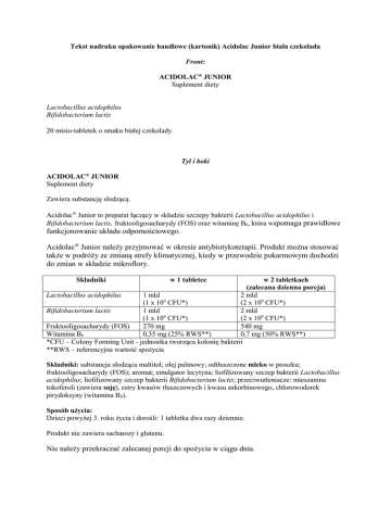 Tekst nadruku opakowanie handlowe (kartonik) Acidolac Junior biała czekolada Front: ACIDOLAC® JUNIOR Suplement diety Lactobacillus acidophilus Bifidobacterium lactis 20 misio-tabletek o smaku białej czekolady Tył i boki ACIDOLAC® JUNIOR Suplement diety Zawiera substancję słodzącą. Acidolac® Junior to preparat łączący w składzie szczepy bakterii Lactobacillus acidophilus i Bifidobacterium lactis, fruktooligosacharydy (FOS) oraz witaminę B6, która wspomaga prawidłowe funkcjonowanie układu odpornościowego. Acidolac® Junior należy przyjmować w okresie antybiotykoterapii. Produkt można stosować także w podróży ze zmianą strefy klimatycznej, kiedy w przewodzie pokarmowym dochodzi do zmian w składzie mikroflory. Składniki w 1 tabletce w 2 tabletkach (zalecana dzienna porcja) Lactobacillus acidophilus 1 mld 2 mld (1 x 109 CFU*) (2 x 109 CFU*) Bifidobacterium lactis 1 mld 2 mld (1 x 109 CFU*) (2 x 109 CFU*) Fruktooligosacharydy (FOS) 270 mg 540 mg Witamina B6 0,35 mg (25% RWS**) 0,7 mg (50% RWS**) *CFU – Colony Forming Unit - jednostka tworząca kolonię bakterii **RWS – referencyjna wartość spożycia Składniki: substancja słodząca maltitol; olej palmowy; odtłuszczone mleko w proszku; fruktooligosacharydy (FOS); aromat; emulgator lecytyna; liofilizowany szczep bakterii Lactobacillus acidophilus; liofilizowany szczep bakterii Bifidobacterium lactis; przeciwutleniacze: mieszanina tokoferoli (zawiera soję), estry kwasów tłuszczowych i kwasu askorbinowego, chlorowodorek pirydoksyny (witamina B6). Sposób użycia: Dzieci powyżej 3. roku życia i dorośli: 1 tabletka dwa razy dziennie. Produkt nie zawiera sacharozy i glutenu. Nie należy przekraczać zalecanej porcji do spożycia w ciągu dnia. Zrównoważona i zróżnicowana dieta oraz zdrowy styl życia są podstawą zapewnienia prawidłowego funkcjonowania organizmu. Suplement diety nie może być stosowany jako substytut zróżnicowanej diety. Korzystny efekt wynikający z deklarowanego działania występuje w przypadku spożycia 2 tabletek dziennie. Nie stosować u osób uczulonych na którykolwiek ze składników produktu. Spożycie w nadmiernych ilościach może mieć efekt przeczyszczający. Najlepiej spożyć przed końcem: data podana na boku opakowania. Przechowywanie: Przechowywać w temperaturze od 15°C do 25°C. Chronić od światła i wilgoci. Przechowywać w sposób niedostępny dla małych dzieci. Zawartość netto: 56 g (20 x 2,8 g) 20 tabletek Producent: Medana Pharma SA 98-200 Sieradz ul. Władysława Łokietka 10 tel.: (43) 829 92 00 (logo) Nr partii: Najlepiej spożyć przed końcem: mm/rrrr Kod kreskowy