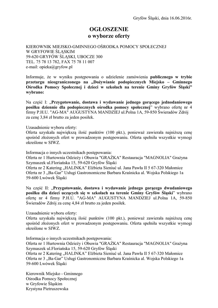 Gryfów Śląski, dnia 16.06.2016r. OGŁOSZENIE o wyborze oferty KIEROWNIK MIEJSKO-GMINNEGO OŚRODKA POMOCY SPOŁECZNEJ W GRYFOWIE ŚLĄSKIM 59-620 GRYFÓW ŚLĄSKI, UBOCZE 300 TEL. 75 78 13 782, FAX 75 78 11 007 e-mail: [email protected] Informuje, że w wyniku postępowania o udzielenie zamówienia publicznego w trybie przetargu nieograniczonego na „Dożywianie podopiecznych Miejsko – Gminnego Ośrodka Pomocy Społecznej i dzieci w szkołach na terenie Gminy Gryfów Śląski” wybrano: Na część I: „Przygotowanie, dostawa i wydawanie jednego gorącego jednodaniowego posiłku dziennie dla podopiecznych ośrodka pomocy społecznej” wybrano ofertę nr 4 firmy P.H.U. "AG-MA" AUGUSTYNA MANDZIEJ ul.Polna 1A, 59-850 Świeradów Zdrój za cenę 3,84 zł brutto za jeden posiłek. Uzasadnienie wyboru oferty: Oferta uzyskała największą ilość punktów (100 pkt.), ponieważ zawierała najniższą cenę spośród złożonych ofert w prowadzonym postępowaniu. Oferta spełniła wszystkie wymogi określone w SIWZ. Informacja o innych uczestnikach postępowania: Oferta nr 1 Hurtownia Odzieży i Obuwia "GRAŻKA" Restauracja "MAGNOLIA" Grażyna Szymaszek ul.Floriańska 15, 59-620 Gryfów Śląski Oferta nr 2 Katering „HALINKA” Elżbieta Sieniuć ul. Jana Pawła II 5 67-320 Małomice Oferta nr 3 „Ba-Gar” Usługi Gastronomiczne Barbara Kraśnicka al. Wojska Polskiego 1a 59-600 Lwówek Śląski Na część II: „Przygotowanie, dostawa i wydawanie jednego gorącego dwudaniowego posiłku dla dzieci uczących się w szkołach na terenie Gminy Gryfów Śląski” wybrano ofertę nr 4 firmy P.H.U. "AG-MA" AUGUSTYNA MANDZIEJ ul.Polna 1A, 59-850 Świeradów Zdrój za cenę 4,84 zł brutto za jeden posiłek. Uzasadnienie wyboru oferty: Oferta uzyskała największą ilość punktów (100 pkt.), ponieważ zawierała najniższą cenę spośród złożonych ofert w prowadzonym postępowaniu. Oferta spełniła wszystkie wymogi określone w SIWZ. Informacja o innych uczestnikach postępowania: Oferta nr 1 Hurtownia Odzieży i Obuwia "GRAŻKA" Restauracja "MAGNOLIA" Grażyna Szymaszek ul.Floriańska 15, 59-620 Gryfów Śląski Oferta nr 2 Katering „HALINKA” Elżbieta Sieniuć ul. Jana Pawła II 5 67-320 Małomice Oferta nr 3 „Ba-Gar” Usługi Gastronomiczne Barbara Kraśnicka al. Wojska Polskiego 1a 59-600 Lwówek Śląski Kierownik Miejsko - Gminnego Ośrodka Pomocy Społecznej w Gryfowie Śląskim Krystyna Pietruszewska