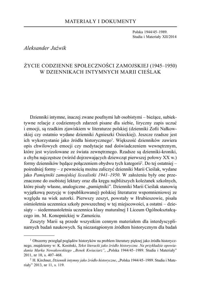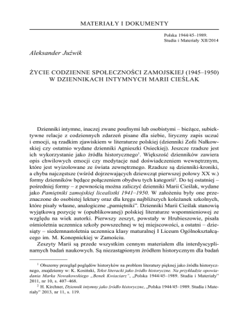 MATERIAŁY I DOKUMENTY Polska 1944/45–1989. Studia i Materiały XII/2014 Aleksander Juźwik ŻYCIE CODZIENNE SPOŁECZNOŚCI ZAMOJSKIEJ (1945–1950) W DZIENNIKACH INTYMNYCH MARII CIEŚLAK Dzienniki intymne, inaczej zwane poufnymi lub osobistymi – bieżące, subiektywne relacje z codziennych zdarzeń pisane dla siebie, liryczny zapis uczuć i emocji, są rzadkim zjawiskiem w literaturze polskiej (dzienniki Zofii Nałkowskiej czy ostatnio wydane dzienniki Agnieszki Osieckiej). Jeszcze rzadsze jest ich wykorzystanie jako źródła historycznego1. Większość dzienników zawiera opis chwilowych emocji czy medytacje nad doświadczeniem wewnętrznym, które jest wyizolowane ze świata zewnętrznego. Rzadsze są dzienniki-kroniki, a chyba najczęstsze (wśród dojrzewających dziewcząt pierwszej połowy XX w.) formy dzienników będące połączeniem obydwu tych kategorii2. Do tej ostatniej – pośredniej formy – z pewnością można zaliczyć dzienniki Marii Cieślak, wydane jako Pamiętniki zamojskiej licealistki 1941–1950. W założeniu były one przeznaczone do osobistej lektury oraz dla kręgu najbliższych koleżanek szkolnych, które pisały własne, analogiczne „pamiętniki”. Dzienniki Marii Cieślak stanowią wyjątkową pozycję w (opublikowanej) polskiej literaturze wspomnieniowej ze względu na wiek autorki. Pierwszy zeszyt, powstały w Hrubieszowie, pisała ośmioletnia uczennica szkoły powszechnej w tej miejscowości, a ostatni – dziesiąty – siedemnastoletnia uczennica klasy maturalnej I Liceum Ogólnokształcącego im. M. Konopnickiej w Zamościu. Zeszyty Marii są przede wszystkim cennym materiałem dla interdyscyplinarnych badań naukowych. Są niezastąpionym źródłem historycznym dla badań 1 Obszerny przegląd poglądów historyków na problem literatury pięknej jako źródła historycznego, znajdziemy w: K. Kosiński, Tekst literacki jako źródło historyczne. Na przykładzie opowiadania Marka Nowakowskiego „Benek Kwiaciarz”, „Polska 1944/45–1989. Studia i Materiały” 2011, nr 10, s. 407–468. 2 H. Kirchner, Dziennik intymny jako źródło historyczne, „Polska 1944/45–1989. Studia i Materiały” 2013, nr 11, s. 119. 384 Aleksander Juźwik życia codziennego społeczności szkolnej w historycznym gmachu Akademii Zamojskiej oraz inteligenckiej społeczności zamojskiej w drugiej połowie lat czterdziestych. Socjolodzy mają możność przeanalizować relacje łączące szkolne bohaterki i bohaterów w grupie społecznej, jaką tworzyła licealna klasa Marii. Psycholodzy i pedagodzy znajdą tutaj kopalnię informacji o problemach dojrzewających nastolatek i nastolatków. Krytyczna postawa wobec otoczenia (charakterystyczna dla wieku dojrzewania, a będąca równocześnie szczególną cechą osobowości autorki), szczera autoanaliza, poparta wysoką inteligencją, jest jednym z najmocniejszych atutów dziennika. Autorka – Maria Cieślak3 była córką znanego i popularnego w Zamościu lekarza Jana4 i nauczycielki Reginy Cieślak5. Centralną rolę w jej dziennikach, prócz samej autorki (występującej pod imieniem Magda), pełnią dwie najbliższe jej przyjaciółki, tworzące tzw. rodzinkę: mąż Magdy „Symp”, „Sympek” czyli Hanka Skopińska6 i jej brat „Kalas”, „Miluta” – Emilka Przeździecka7. Szczególnie z tą pierwszą łączy autorkę wyjątkowa więź; poznały się w szkole powszechnej w Hrubieszowie, razem dojrzewały w Szkole Powszechnej im. A. Mickiewicza i Liceum Ogólnokształcącym im. M. Konopnickiej w Zamościu. 3 Maria Ludwika Magdalena Cieślak-Łastowiecka (1933–1979), absolwentka zamojskiego liceum im. M. Konopnickiej, po skończeniu muzykologii na Uniwersytecie Warszawskim pracowała w Redakcji Muzycznej Polskiego Radia w Warszawie. Była autorką słuchowisk muzycznych i literackich, spośród nich wyróżniały się „Dobranocki”. Za twórczość radiową otrzymała w 1974 r. w Sapporo „Prix Japan”; zob. A. Kędziora, Encyklopedia ludzi Zamościa, Zamość 2007, s. 47. 4 Jan Cieślak (1903–1988), lekarz internista. Ukończył studia medyczne na Uniwersytecie Warszawskim. W latach 1932–1944 pracował w szpitalu hrubieszowskim. Był członkiem Stronnictwa Narodowego. Od 1945 r. pełnił funkcję naczelnego lekarza w Ubezpieczalni Społecznej, ponadto był ordynatorem oddziału wewnętrznego męskiego do lat sześćdziesiątych, kierował też Pogotowiem Ratunkowym. Od 1974 pracował w przychodni, niedaleko swego miejsca zamieszkania, przy ul. Partyzantów w Zamościu. Prezes Tymczasowego Przymusowego Zarządu Zrzeszenia Katolików „Caritas” na miasto Zamość (1950) po przejęciu agendy rozwiązanego przez władze kościelnego Stowarzyszenia Miłosierdzia „Caritas” od ks. Kanonika Franciszka Zawiszy, A. Kędziora, op. cit., s. 47; K. Radziejewski, Kontrwywiadowcza charakterystyka Zamościa w 1956 r., s. 129, zob.: http://zamosc.ap.gov.pl/wp-content/uploads/2012/02/125-138Radziejewski.pdf. 5 Regina Cieślak (ur. 1910) matka Marii, Marka i Karola, absolwentka Gimnazjum im. M. Konopnickiej, z zawodu nauczycielka. Nie pracowała, zajmując się domem; wywarła decydujący wpływ na osobowość Marii. Udostępniła dzienniki zmarłej córki znanej historyczce zamojskiej dr Bogumile Sawie, która je wydała w 2000 r., dedykując je właśnie pani Reginie, Pamiętniki zamojskiej licealistki 1941–1950, Zamość 2000 (dalej: Pamiętniki…). 6 Hanna Skopińska (ur. 1933), absolwentka historii sztuki na KUL, pracowała razem z Marią w Polskim Radio, w 1981 r. wyemigrowała do Danii, zob. Pamiętniki…, s. 593, przyp. 1. 7 Emilia Przeździecka (ur. 1933) ukończyła chemię i w 1959 r. wyszła za mąż za matematyka, hrabiego Jana Stanisława Mycielskiego, który od 1967 r. jako profesor wykładał na Uniwersytecie stanowym Colorado w miejscowości Boulder; wraz z mężem Emilia wyemigrowała do Stanów Zjednoczonych, gdzie mieszkają jej dzieci, zob.: http://www.genealogiapolska