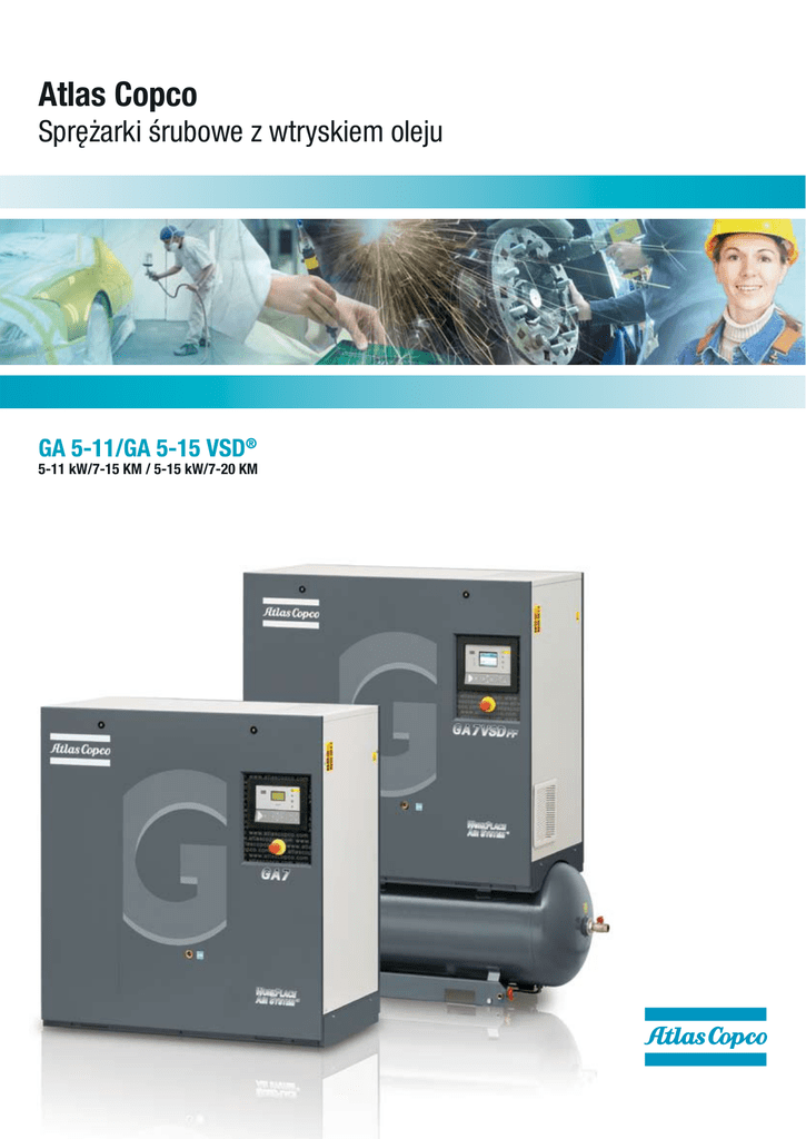 Atlas Copco Sprężarki śrubowe z wtryskiem oleju GA 5-11/GA 5-15 VSD® 5-11 kW/7-15 KM / 5-15 kW/7-20 KM Inteligentne rozwiązanie dopasowane do potrzeb rynku Rodzina sprężarek GA Atlas Copco charakteryzuje się doskonałą wydajnością, elastycznością pracy i bardzo wysoką efektywnością przy ograniczonych do minimum kosztach eksploatacji. Różnorodność wyboru maszyn należących do dwóch wyjątkowych serii GA 5 –11 i GA 5–15 VSD pozwala na znalezienie rozwiązania dopasowanego do indywidualnych wymagań każdego użytkownika. Oddając naszym Klientom do dyspozycji sprężarki przystosowane do pracy w najtrudniejszych warunkach roboczych z pełnym zaangażowaniem przyczyniamy się do optymalizacji przebiegu procesów produkcyjnych w ich firmach. Najwyższy stopień niezawodności Sprężarki serii GA i GA VSD zostały zaprojektowane, wyprodukowane i poddane testom zgodnie z wymaganiami ISO 9001, ISO 14001 i ISO1217, wydanie 3, aneks C. Wyposażone w najnowocześniejsze śrubowe elementy sprężające z wtryskiem oleju gwarantują długą i bezawaryjną pracę przy najniższym koszcie eksploatacji. Minimalizacja kosztów energii Koszt energii może stanowić ponad 80% całkowitego kosztu eksploatacji sprężarki (LCC). Koszt wytworzenia sprężonego powietrza może stanowić ponad 40% całkowitego kosztu energii zużywanej przez zakład produkcyjny. Dzięki zastosowaniu niezwykle wydajnych elementów sprężających i nowoczesnych rozwiązań konstrukcyjnych sprężarki GA mogą minimalizować koszty energii jak również całkowite koszty eksploatacyjne. Ponadto sprężarki GA VSD dodatkowo obniżają koszt energii nawet o dalsze 35% automatycznie dopasowując wydatek sprężonego powietrza do jego poboru. Instalacja sprężonego powietrza zintegrowana ze sprężarką GA 5-11/GA 5-15 VSD® 5-11 kW/7-15 hp / 5-15 kW/7-20 hp Sprężarki GA WorkPlace Air System dzięki niskiemu poziomowi generowanego hałasu mogą być instalowane w pobliżu punktu poboru sprężonego powietrza. Zintegrowany system uzdatniania sprężonego powietrza i zbiornik powietrza zamontowany pod sprężarką pozwalają na ich pracę bez konieczności tworzenia osobnej sprężarkowni. Wszystkie sprężarki dostarczane są w stanie pozwalającym na ich natychmiastowe użytkowanie, co ogranicza koszty instalacji do minimum. GA & GA VSD: spełniają oczekiwania naszych Klientów GA 5-11: rozwiązanie klasy Premium Najbardziej niezawodne rozwiązanie sprężarki montowanej na zbiorniku dostarczającej wysokiej klasy sprężone powietrze i oferowanej w stanie gotowości do natychmiastowego użycia ▸ Jakość klasy Premium i jeszcze większa łatwość wykonywania prac serwisowych przy najniższym koszcie eksploatacji. ▸ Nowy sterownik Elektronikon® zapewniający pełną kontrolę nad sprężarką i gwarantujący wysoką efektywność pracy. ▸ Wyjątkowo małe zużycie energii i niski poziom generowanego hałasu. ▸ Sprężone powietrze najwyższej jakości dzięki wbudowanemu nowoczesnemu osuszaczowi powietrza. GA 5-15 VSD: wyjątkowa oszczędność energii Ograniczone do minimum zużycie energii nawet w najtrudniejszych zastosowaniach pozwala na realne oszczędności. ▸ GA 15 VSD: zupełnie nowy model w rodzinie sprężarek z napędem o zmiennej prędkości obrotowej. ▸ Średnia oszczędność energii na poziomie 35%. ▸ Nowoczesna technologia napędu o zmiennej prędkości obrotowej (VSD). ▸ Elastyczny wybór wartości ciśnienia: 4–13 bar. ▸ Sprężone powietrze najwyższej jakości przy najniższym koszcie energii dzięki wbudowanemu nowoczesnemu osuszaczowi powietrza. ▸ Najnowocześniejszy z dostępnych na rynku, łatwy w obsłudze sterownik graficzny Elektronikon®. GA 5-11/GA 5-15 VSD® 5-11 kW/7-15 hp / 5-15 kW/7-20 hp ▸ Różnorodność opcji pozwalająca na dopasowanie pracy maszyny do indywidualnych oczekiwań każdego użytkownika. GA 5-11: rozwiązanie klasy Premium Montowane na zbiorniku powietrza sprężarki serii GA, charakteryzujące się wysoką wydajnością i przystosowaniem do codziennego podejmowania najtrudniejszych wyzwań, stanowią najlepsze rozwiązanie do wszelkich zastosowań warsztatowych. Przygotowane do rozpoczęcia pracy natychmiast po dostawie, dostarczają wysokiej jakości sprężone powietrze, utrzymując instalację sprężonego powietrza w doskonałym stanie i zachowując ciągłość procesu produkcyjnego. Zbudowane by trwać ▸ Wyposażone w element sprężający nowej generacji z nowoczesnymi łożyskami i systemem uszczelnień. ▸ Zaprojektowany i wykonany zgodnie z najwyższymi obowiązującymi w przemyśle standardami system napędu pasowego zapewnia wyjątkową niezawodność pracy w czasie całego okresu eksploatacji. ▸ Maksymalna trwałość osiągnięta dzięki wykorzystaniu najlepszych praktyk, nowoczesnych narzędzi projektowo – konstrukcyjnych i bogatego doświadczenia zdobytego podczas długich lat codziennej pracy. ▸ Możliwość pracy przy temperaturach otoczenia sięgających do 46°C dzięki optymalnemu układowi elementów sprężarki. Ochrona procesu produkcyjnego ▸ Podgląd stanu roboczego sprężarki w trybie online w nowym sterowniku Elektronikon® pozwala na zdalne monitorowanie pracy sprężarki poprzez standardowe połączenie Ethernetowe. ▸ Zabezpieczenie przeciw zanieczyszczeniu olejem: wyjątkowo mała ilość przenoszonego oleju dzięki pionowej konstrukcji zbiornika olejowego. ▸ System uzdatniania sprężonego powietrza zapewniający ochronę we wszystkich warunkach roboczych. Zintegrowany osuszacz zapobiega kondensacji i korozji sieci powietrznej. Opcjonalne filtry, które mogą zostać dodatkowo zamontowane, zapewniają jakość sprężonego powietrza aż do poziomu klasy 1 (<0,01 ppm). ▸ Separator wody w wyposażeniu standardowym. ▸ Separacja wody na poziomie bliskim 100% we wszystkich warunkach roboczych, elektroniczny spust kondensatu nie powodujący strat ciśnienia, dodatkowy separator wod
