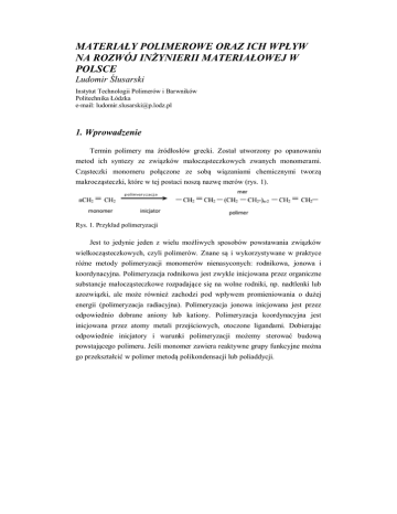MATERIAŁY POLIMEROWE ORAZ ICH WPŁYW NA ROZWÓJ INŻYNIERII MATERIAŁOWEJ W POLSCE Ludomir Ślusarski Instytut Technologii Polimerów i Barwników Politechnika Łódzka e-mail: [email protected] 1. Wprowadzenie Termin polimery ma źródłosłów grecki. Został utworzony po opanowaniu metod ich syntezy ze związków małocząsteczkowych zwanych monomerami. Cząsteczki monomeru połączone ze sobą wiązaniami chemicznymi tworzą makrocząsteczki, które w tej postaci noszą nazwę merów (rys. 1). Rys. 1. Przykład polimeryzacji Jest to jedynie jeden z wielu możliwych sposobów powstawania związków wielkocząsteczkowych, czyli polimerów. Znane są i wykorzystywane w praktyce różne metody polimeryzacji monomerów nienasyconych: rodnikowa, jonowa i koordynacyjna. Polimeryzacja rodnikowa jest zwykle inicjowana przez organiczne substancje małocząsteczkowe rozpadające się na wolne rodniki, np. nadtlenki lub azozwiązki, ale może również zachodzi pod wpływem promieniowania o dużej energii (polimeryzacja radiacyjna). Polimeryzacja jonowa inicjowana jest przez odpowiednio dobrane aniony lub kationy. Polimeryzacja koordynacyjna jest inicjowana przez atomy metali przejściowych, otoczone ligandami. Dobierając odpowiednie inicjatory i warunki polimeryzacji możemy sterować budową powstającego polimeru. Jeśli monomer zawiera reaktywne grupy funkcyjne można go przekształcić w polimer metodą polikondensacji lub poliaddycji. 98 Ludomir Ślusarski W inżynierii materiałowej rozróżnia się trzy podstawowe grupy materiałów, są to: materiały metaliczne, ceramiczne oraz polimerowe. Czwartą grupę stanowią kompozyty, które można wytwarzać z każdego z wymienionych rodzajów materiałów. Zasadnicza różnica między polimerami a metalami lub ceramiką polega na tym, że jedynie w przypadku tych pierwszych masa cząsteczkowa oraz budowa makrocząsteczek mogą być w szerokim zakresie kształtowane podczas ich syntezy, w zależności od przewidywanych zastosowań. Niektóre rodzaje polimerów, np. kauczuk naturalny, gutaperka, celuloza i in. powstają w wyniku reakcji biochemicznych, zachodzących w roślinach. Polimery, ze względu na budowę makrocząsteczek i właściwości, dzieli się na trzy podstawowe grupy (Tab. 1). Tabela 1 Klasyfikacja polimerów Rodzaj Liczba głównych (przybliżona) Plastomery1) Elastomery Duromery2) Polimery włóknotwórcze3) 22 15 19 19 odmian 1. Nazywane także „tworzywami sztucznymi” lub rzadziej, masami plastycznymi 2. Zwane również żywicami termo- lub chemoutwardzalnymi 3. Często nie uwzględniane w klasyfikacji W przypadku plastomerów, elastomerów i polimerów włóknotwórczych duże znaczenie ma przestrzenna budowa makrocząsteczek. Jeśli jest ona stereoregularna, dany polimer jest zdolny do krystalizacji. Wprawdzie zawartość powstającej w takim przypadku fazy krystalicznej zwykle nie przekracza kilkudziesięciu procent, ale wywiera ona bardzo duży wpływ na właściwości polimeru, wzrasta jego gęstość, stabilność termiczna i wytrzymałość mechaniczna. Przykłady różnorodnych postaci makrocząsteczek polimerów, czyli ich „architekturę” przedstawiono na poniższym rysunku (rys. 2). Materiały polimerowe oraz ich wpływ na rozwój inżynierii materiałowej w Polsce 99 Rys. 2. Architektura makrocząstek Łączna liczba znanych polimerów jest wielokrotnie większa, gdyż oprócz odmian zbudowanych z jednego rodzaju merów (homopolimery) są syntezowane kopolimery, zawierające mery dwojakiego rodzaju oraz terpolimery (trzy różne rodzaje merów). W makrocząsteczkach ko- i terpolimerów rozkład merów jest zwykle statystyczny, ale mogą one również tworzyć bloki. Ponadto do makrocząsteczek są wbudowywane heteroatomy lub różne grupy boczne. Syntezowane są także polimery lub oligomery1 zawierające w obrębie lub na końcach cząsteczek wbudowane celowo grupy funkcyjne (te drugie noszą nazwę polimerów lub oligomerów telechelicznych). Duromery mogą różnić się znacznie gęstością usieciowania itd. Postęp w zakresie syntezy polimerów wiąże się w znacznej mierze z poznaniem mechanizmu polimeryzacji oraz katalizy. Ostatnio podjęto uwieńczone powodzeniem próby syntezy tzw. polimerów supramolekularnych. W tym przypadku jednostki strukturalne makrocząsteczek są połączone nie tylko wiązaniami chemicznymi, ale również wskutek szczególnej budowy przestrzennej, 1 Terminem oligomery określa się zwyczajowo związki o masie cząsteczkowej nie przekraczającym 10 000. 100 Ludomir Ślusarski np. w postaci układów katenanowych bądź rotaksanowych (rys. 2) [1] lub wskutek specyficznych oddziaływań, np. tworzenia międzycząsteczkowych wiązań wodorowych [2]. Uzyskane w ten sposób polimery mają częstokroć wyjątkowe właściwości, np. są zdolne do samorzutnego naprawiania uszkodzonych (przeciętych lub rozerwanych) próbek (self-healing materials) albo ulegają biodegradacji. Polimery niezbyt często są wykorzystywane jako takie, z reguły zawierają substancje pomocnicze nadające im pożądane cechy. W tej postaci noszą właśnie nazwę materiałów polimerowych. Do najczęściej stosowanych w technologii polimerów substancji pomocniczych należą: zmiękczacze, dyspergatory, środki przeciwstarzeniowe, napełniacze i nanonapełniacze, środki sieciujące, aktywatory i antypireny. Współcześnie wykorzystywane materiały polimerowe są doskonale dostosowane do określonych zastosowań. Stało się to możliwe dzięki rozwojowi nauki o materiałach i inżynierii materiałowej. Istotną zaletą polimerów jest również ich mała gęstość, na ogół <2 g/cm3. Z tego właśnie powodu światowa produkcja polimerów, która wynosi około 300 milionów ton, jeśli obliczyć ją w jednostkach objętości, jest już większa (224 mln m3) niż produkcja stali (133 mln m3) [3]. Roczna produkcja polimerów w Polsce wynosi około 2,1 mln ton [4]. Produkcję polimerów w Polsce uru