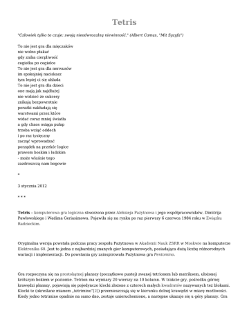 Tetris "Człowiek tylko to czuje: swoją nieodwracalną niewinność." (Albert Camus, "Mit Syzyfa") To nie jest gra dla mięczaków nie wolno płakać gdy znika cierpliwość cegiełka po cegiełce To nie jest gra dla nerwusów im spokojniej naciskasz tym lepiej ci się układa To nie jest gra dla dzieci one mają jak najdłużej nie widzieć że sukcesy znikają bezpowrotnie porażki nakładają się warstwami przez które widać coraz mniej światła a gdy chaos osiąga pułap trzeba wziąć oddech i po raz tysięczny zacząć wprowadzać porządek na przekór logice prawom boskim i ludzkim - może właśnie tego zazdroszczą nam bogowie * 3 stycznia 2012 *** Tetris – komputerowa gra logiczna stworzona przez Aleksieja Pażytnowa i jego współpracowników, Dimitrija Pawłowskiego i Wadima Geriasimowa. Pojawiła się na rynku po raz pierwszy 6 czerwca 1984 roku w Związku Radzieckim. Oryginalna wersja powstała podczas pracy zespołu Pażytnowa w Akademii Nauk ZSRR w Moskwie na komputerze Elektronika 60. Jest to jedna z najbardziej znanych gier komputerowych, posiadająca dużą liczbę różnorodnych wariacji i implementacji. Do powstania gry zainspirowała Pażytnowa gra Pentomino. Gra rozpoczyna się na prostokątnej planszy (początkowo pustej) zwanej tetrionem lub matriksem, ułożonej krótszym bokiem w poziomie. Tetrion ma wymiary 20 wierszy na 10 kolumn. W trakcie gry, pośrodku górnej krawędzi planszy, pojawiają się pojedynczo klocki złożone z czterech małych kwadratów nazywanych też blokami. Klocki te (określane mianem „tetrimino”[2]) przemieszczają się w kierunku dolnej krawędzi w miarę możliwości. Kiedy jedno tetrimino opadnie na samo dno, zostaje unieruchomione, a następne ukazuje się u góry planszy. Gra trwa aż do momentu, w którym klocek nie będzie mógł pojawić się na planszy. Zadaniem gracza jest układanie tetrimino na planszy (poprzez wykorzystanie rotacji i przesuwanie klocków w poziomie) w taki sposób, aby kwadraty składające się na nie utworzyły wiersz na całej szerokości prostokąta. W takiej sytuacji wiersz ten zostaje usunięty, a pozostałe klocki opadają w kierunku dna, tworząc więcej przestrzeni dla następnych elementów. Po usunięciu określonej liczby wierszy prędkość gry wzrasta o pół sekundy, co utrudnia tym samym precyzyjne sterowanie kolejnymi tetrimino. Możliwe jest jednoczesne usunięcie maksymalnie 4 wierszy – umożliwia to tetrimino „I”. Sytuacja taka nosi nazwę identyczną jak gra, czyli „tetris”. Historia i kwestie prawne Niemal od początku swego istnienia Tetris był związany z bataliami prawnymi dotyczącymi tej gry. Sprawę komplikował fakt, iż jej twórca – jako obywatel ZSRR – nie mógł uzyskać żadnego zabezpieczenia przed wykorzystaniem jej wbrew jego woli. Wkrótce po powstaniu Tetrisa Wadim Gierasimow – inny radziecki programista, wówczas szesnastolatek – stworzył wersję programu dla komputerów IBM PC i rozpowszechnił ją w Moskwie. Jednak dopiero rok później, w 1986 roku, gra przedostała się na zachód – na Węgry, gdzie powstały jej kolejne wersje dla maszyn Commodore 64 i Apple II. Na Węgrzech z grą zapoznał się Robert Stein, prezes brytyjskiej firmy informatycznej Andromeda. Próbował się on skontaktować z Moskiewską Akademią Nauk i Pażytnowem, lecz jeszcze zanim to nastąpiło, odsprzedał prawa (których nie posiadał) do gry powiązanym ze sobą firmom: brytyjskiemu Mirrorsoft i amerykańskiemu Spectrum Holobyte. Kilka miesięcy po tym Stein spotkał się z Pażytnowem, lecz – wobec braku zainteresowania grami komputerowymi przez radzieckich naukowców – niczego nie uzyskał. Wskutek tego próbował przejąć prawa od programistów węgierskich. W międzyczasie wersja Tetrisa pod IBM PC odniosła sukces w Stanach Zjednoczonych i Wielkiej Brytanii. W 1987 roku Andromeda uzyskała, mimo braku kontraktu z Rosjanami, prawa autorskie do gry – zarówno dla IBM PC, jak i dla innych komputerów osobistych. Do początku następnego roku udało się stworzyć wersję Tetrisa dla znacznej większości (jeżeli nie wszystkich) modeli komputerów osobistych. Wkrótce w Związku Radzieckim powstała organizacja Elektronorgtechnica (w skrócie ELORG), która przejęła negocjacje w sprawie gry z Robertem Steinem, lecz zatrzymały się one do maja 1988 roku, gdy radziecka strona dowiedziała się o bezprawnej sprzedaży praw do Tetrisa przez Andromedę. Podpisany kontrakt zawierał jednak zakaz rozpowszechniania gry dla automatów oraz konsol przenośnych. Jednak zarówno Mirrorsoft, jak i Spectrum Holobyte podpisały kontrakty z – odpowiednio – Bullet-Proof Software i Atari Games na rozpowszechnianie wersji na automaty na terenie Japonii, przez co nastąpił konflikt. Jednocześnie prawa te otrzymało także Nintendo, a Atari zaczęło (poprzez oddział Tengen) tworzyć grę opartą na schemacie Tetrisa i nazwało ją TETЯIS. ELORG wkrótce został zaangażowany w walkę o prawa do gry, jednocześnie komplikując sytuację przez nowo zawarte umowy. Walki pomiędzy Tengen a Nintendo o wersje dla systemów Famicom i Nintendo Entertainment System trwały do 1993 roku. Aleksiej Pażytnow nie zyskał na tym wiele pieniędzy, w przeciwieństwie do ELORG, której wpływy z tytułu umów szacuje się na 3-5 milionów dolarów. W 1996 roku do walki o Tetrisa dołączyła The Tetris Company LLC (TTC), zarządzana przez Henka Rogersa – będącego wcześniej prezesem Bullet-Proof Software i przedstawicielem Nintendo w sprawie licencji do gry – firma, która wywalczyła ostatecznie (w 2001 roku) prawa do znaku handlowego Tetris. (z Wiki) *** Aleksiej Pażytnow - geniusz, który sięgnął dna: Od zawsze, kiedy myślę o Pażytnowie, nasuwa mi się na myśl kariera Kazimierza Deyny - jednego z najlepszych piłkarzy wszech czasów, gwiazdy Igrzysk olimpijskich w Monachium i brązowego medalisty mistrzostw świata, który w latach 70. mógł stanowić 