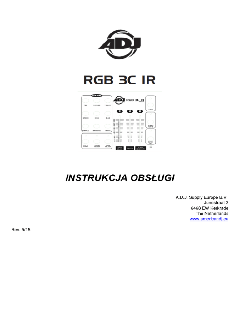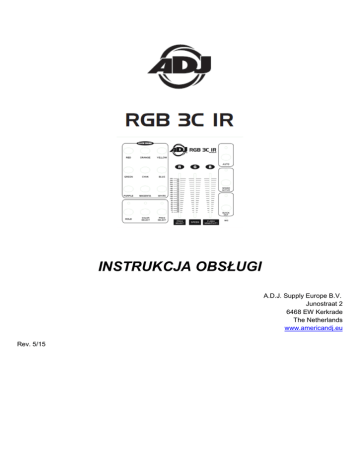 INSTRUKCJA OBSŁUGI A.D.J. Supply Europe B.V. Junostraat 2 6468 EW Kerkrade The Netherlands www.americandj.eu Rev. 5/15 ©2013 ADJ Products, LLC wszystkie prawa zastrzeżone. Informacje, specyfikacje, rysunki, zdjęcia oraz instrukcje zawarte w niniejszej instrukcji mogą ulec zmianie bez wcześniejszego powiadomienia. Produkty marki ADJ, logo LLC oraz nazwy i numery identyfikujące produkty opisane w niniejszym dokumencie stanowią znak handlowy ADJ Products, LLC. Zgłoszona ochrona praw autorskich obejmuje wszelkie formy i wszelkie kwestie dotyczące materiałów i informacji podlegających ochronie prawem autorskim, dozwolone obecnie przez obowiązujące ustawy bądź rozstrzygnięcia sądowe. Nazwy produktów użyte w niniejszym dokumencie mogą stanowić znaki towarowe bądź zarejestrowane znaki towarowe produkujących je spółek i zostają niniejszym prawnie uznane. Wszelkie marki oraz nazwy produktów nie pochodzące od ADJ Products, LLC, stanowią znaki towarowe lub zarejestrowane znaki towarowe odpowiednich, produkujących je spółek. ADJ Products, LLC oraz wszystkie powiązane z nią spółki wyłączają niniejszym wszelką swoją odpowiedzialność za szkody we własności, sprzęcie, budynkach lub szkody elektryczne, za obrażenia poniesione przez jakiekolwiek osoby, jak też za bezpośrednie lub pośrednie straty ekonomiczne związane z lub zależne od użycia jakichkolwiek informacji zawartych w niniejszym dokumencie, oraz/lub wynikłe z niewłaściwego, niebezpiecznego, niepełnego lub niestarannego montażu, instalacji, konfiguracji osprzętu oraz działania opisanych tutaj produktów. A.D.J. Supply Europe B.V. - www.americandj.eu - RGB 3C IR Podręcznik Użytkownika Strona 2 Spis treści INFORMACJE OGÓLNE ............................................................................................................................................................ 4 INSTRUKCJE OGÓLNE .............................................................................................................................................................. 4 CECHY:..................................................................................................................................................................................... 4 USTAWIENIA DMX .................................................................................................................................................................. 4 PRZEŁĄCZNIKI I FUNKCJE ........................................................................................................................................................ 6 PRZEŁĄCZNIKI I FUNKCJE - TYŁ URZĄDZENIA .......................................................................................................................... 7 DZIAŁANIE ............................................................................................................................................................................... 7 FUNKCJE FADERA .................................................................................................................................................................... 8 STEROWNIK ADJ LED RC2 ....................................................................................................................................................... 9 SPECYFIKACJE ........................................................................................................................................................................ 10 ROHS – Ważny wkład w ochronę środowiska ...................................................................................................................... 11 WEEE – Utylizacja odpadów elektrycznych i elektronicznych .............................................................................................. 11 A.D.J. Supply Europe B.V. - www.americandj.eu - RGB 3C IR Podręcznik Użytkownika Strona 3 INOZIONE INFORMACJE OGÓLNE Wypakowanie: Dziękujemy za zakup efektu RGB 3C IR firmy ADJ Products, LLC. Każdy egzemplarz RGB 3C IR został gruntownie przetestowany, co jest gwarancją jego prawidłowego funkcjonowania. Należy dokładnie sprawdzić czy opakowanie nie posiada uszkodzeń powstałych w czasie transportu. W razie stwierdzenia uszkodzenia opakowania, dokładnie sprawdź, czy nie nastąpiło uszkodzenie sprzętu oraz upewnij się, że wszystkie części konieczne do obsługi urządzenia przybyły w stanie nienaruszonym. W razie stwierdzenia uszkodzeń lub braku części, należy skontaktować się z wsparciem klienta poprzez nasz bezpłatny numer. Prosimy o taki kontakt przed podjęciem decyzji o zwrocie urządzenia do sprzedawcy. Wstęp: RGB 3C IR to mały i lekki sterownik, który jest łatwy w użyciu i obsługuje 3 kanały RGB LED. RGB 3C IR zaprojektowano do sterowania dowolnymi 3-kanałowymi urządzeniami RGB. RGB 3C IR posiada tryb reakcji na dźwięk, tryb programów, tryb auto oraz tryb koloru statycznego. Posiada również fadery RGB pozwalające tworzyć własne niestandardowe kolory. Sterownik jest idealnym rozwiązaniem dla DJów, małych klubów i barów, które potrzebują prostego sterownika LED do zarządzania pokazem. Obsługa klienta: W razie jakichkolwiek problemów, prosimy o kontakt z zaufanym punktem sprzedaży American Audio. Istnieje również możliwość bezpośredniego kontaktu z nami. Można to zrobić poprzez naszą stronę internetową www.americandj.eu oraz pisząc na adres: [email protected] Ostrzeżenie! Aby zapobiec lub zmniejszyć ryzyko porażenia prądem lub pożaru, nie włączaj urządzenia w warunkach deszczowych lub przy podwyższonej wilgotności powietrza. Ostrzeżenie! Urządzenie może poważnie uszkodzić wzrok. Nie należy nigdy patrzeć bezpośrednio na źródło światła! INSTRUKCJE OGÓLNE Aby w pełni wykorzystać możliwości urządzenia, prosimy o przeczytanie instrukcji obsługi i zapoznanie się z podstawowymi funkcjami urządzenia