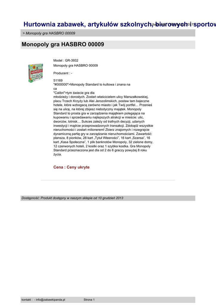 : 02 marzec 2017 Hurtownia zabawek, artykułów szkolnych,Utworzono biurowych i sportow > Monopoly gra HASBRO 00009 Monopoly gra HASBRO 00009 Model : GR-3932 Monopoly gra HASBRO 00009 Producent : 51169 "#000000">Monopoly Standard to kultowa i znana na ca "Calibri">łym świecie gra dla młodzieży i dorosłych. Zostań właścicielem ulicy Marszałkowskiej, placu Trzech Krzyży lub Alei Jerozolimskich, postaw tam bajeczne hotele, które wzbogacą zarówno miasto i jak Twój portfel… Przenieś się na ulicę, na której zbijesz niebotyczny majątek. Monopoly Standard to prosta gra w zarządzenia majątkiem polegająca na kupowaniu i sprzedawaniu najlepszych atrakcji w mieście: ulic, dworców, lotnisk… Sukces zależy od trafnych decyzji, udanych inwestycji i mądrze przeprowadzonych transakcji. Zdobądź wszystkie nieruchomości i zostań milionerem! Zbierz znajomych i rozegrajcie dynamiczną partię gry w zarządzanie nieruchomościami. Zawartość: plansza, 8 pionków, 28 kart „Tytuł Własności”, 16 kart „Szansa”, 16 kart „Kasa Społeczna”, 1 plik banknotów Monopoly, 32 zielone domy, 12 czerwonych hoteli, 2 kostki oraz 1 szybka kostka. Gra Monopoly Standard przeznaczona jest dla od 2 do 6 graczy powyżej 8 roku życia. Cena : Ceny ukryte Dostępność: Produkt dostępny w naszym sklepie od 10 grudzień 2013 kontakt : - [email protected] Strona 1