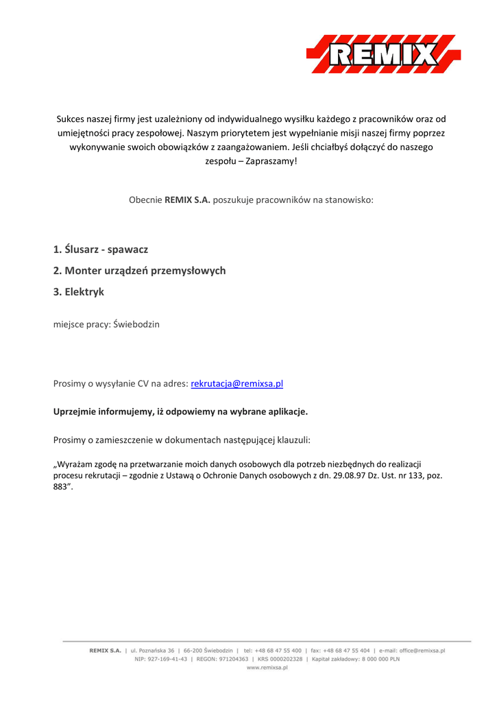 Sukces naszej firmy jest uzależniony od indywidualnego wysiłku każdego z pracowników oraz od umiejętności pracy zespołowej. Naszym priorytetem jest wypełnianie misji naszej firmy poprzez wykonywanie swoich obowiązków z zaangażowaniem. Jeśli chciałbyś dołączyć do naszego zespołu – Zapraszamy! Obecnie REMIX S.A. poszukuje pracowników na stanowisko: 1. Ślusarz - spawacz 2. Monter urządzeń przemysłowych 3. Elektryk miejsce pracy: Świebodzin Prosimy o wysyłanie CV na adres: [email protected] Uprzejmie informujemy, iż odpowiemy na wybrane aplikacje. Prosimy o zamieszczenie w dokumentach następującej klauzuli: „Wyrażam zgodę na przetwarzanie moich danych osobowych dla potrzeb niezbędnych do realizacji procesu rekrutacji – zgodnie z Ustawą o Ochronie Danych osobowych z dn. 29.08.97 Dz. Ust. nr 133, poz. 883”.