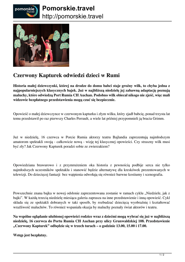Pomorskie.travel http://pomorskie.travel Czerwony Kapturek odwiedzi dzieci w Rumi Historia małej dziewczynki, której na drodze do domu babci staje groźny wilk, to chyba jedna z najpopularniejszych klasycznych bajek. Już w najbliższą niedzielę jej zabawną adaptację poznają maluchy, które odwiedzą Port Rumia CH Auchan. Podobno wilk obiecał nikogo nie zjeść, więc mali widzowie bezpłatnego przedstawienia mogą czuć się bezpiecznie. Opowieść o małej dziewczynce w czerwonym kapturku i złym wilku, który zjadł babcię, ponad trzysta lat temu przedstawił po raz pierwszy Charles Perrault, a wiele lat później przypomnieli ją bracia Grimm. Już w niedzielę, 16 czerwca w Porcie Rumia aktorzy teatru Bajlandia zaprezentują najmłodszym amatorom spektakli swoją - całkowicie nową - wizję tej klasycznej opowieści. Czy straszny wilk musi być zły? Jak Czerwony Kapturek poradzi sobie ze zwierzakiem? Opowiedziana brawurowo i z przymrużeniem oka historia z pewnością podbije serca nie tylko najmłodszych uczestników spektaklu i stanowić będzie alternatywę dla kreskówek prezentowanych w telewizji. Do dziecięcej fantazji bez wątpienia odwołają się również barwne kostiumy i scenografia. Powszechnie znana bajka w nowej odsłonie zaprezentowana zostanie w ramach cyklu „Niedziele, jak z bajki”. W każdą trzecią niedzielę miesiąca galeria zaprasza na inne przedstawienie i inną opowieść. Cykl składa się ze spektakli dobranych w taki sposób, by rozbudzać dziecięcą wyobraźnię i kształtować wrażliwość maluchów. To również wspaniała okazja by maluchy poznały świat aktorów i teatru. Na wspólne oglądanie ulubionej opowieści rodzice wraz z dziećmi mogą wybrać się już w najbliższą niedzielę, 16 czerwca do Portu Rumia CH Auchan przy ulicy Grunwaldzkiej 108. Przedstawienie „Czerwony Kapturek” odbędzie się w trzech turach – o godzinie 13.00, 15.00 i 17.00. Wstęp jest bezpłatny. 1/2 Pomorskie.travel http://pomorskie.travel PCIT 2/2 Powered by TCPDF (www.tcpdf.org)