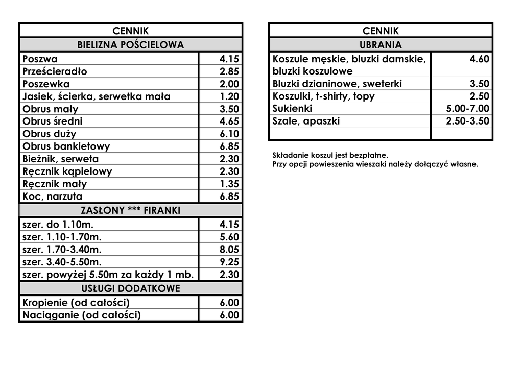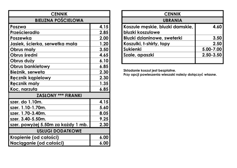 CENNIK BIELIZNA POŚCIELOWA Poszwa Prześcieradło Poszewka Jasiek, ścierka, serwetka mała Obrus mały Obrus średni Obrus duży Obrus bankietowy Bieżnik, serweta Ręcznik kąpielowy Ręcznik mały Koc, narzuta ZASŁONY *** FIRANKI szer. do 1.10m. szer. 1.10-1.70m. szer. 1.70-3.40m. szer. 3.40-5.50m. szer. powyżej 5.50m za każdy 1 mb. USŁUGI DODATKOWE Kropienie (od całości) Naciąganie (od całości) 4.15 2.85 2.00 1.20 3.50 4.65 6.10 6.85 2.30 2.30 1.35 6.85 4.15 5.60 8.05 9.25 2.30 6.00 6.00 CENNIK UBRANIA Koszule męskie, bluzki damskie, bluzki koszulowe Bluzki dzianinowe, sweterki Koszulki, t-shirty, topy Sukienki Szale, apaszki 4.60 3.50 2.50 5.00-7.00 2.50-3.50 Składanie koszul jest bezpłatne. Przy opcji powieszenia wieszaki należy dołączyć własne.