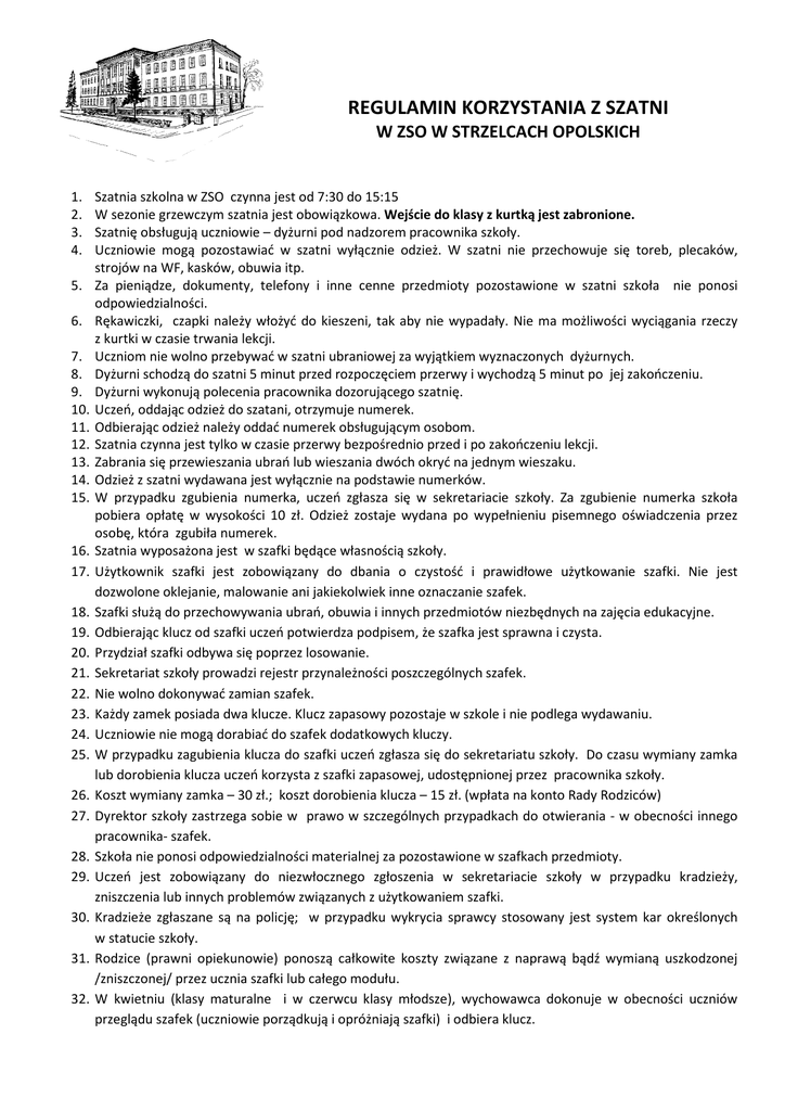 REGULAMIN KORZYSTANIA Z SZATNI W ZSO W STRZELCACH OPOLSKICH 1. 2. 3. 4. 5. 6. 7. 8. 9. 10. 11. 12. 13. 14. 15. 16. 17. 18. 19. 20. 21. 22. 23. 24. 25. 26. 27. 28. 29. 30. 31. 32. Szatnia szkolna kolna w ZSO czynna jest od 7:30 do 15:15 W sezonie grzewczym szatnia jest obowiązkowa. Wejście do klasy z kurtką jest zabronione. Szatnię obsługują uczniowie – dyżurni pod nadzorem pracownika szkoły. Uczniowie mogą pozostawiać w szatni wyłącznie wył odzież.. W szatni nie przechowuje się si toreb, plecaków, strojów na WF, kasków, obuwia itp. Za pieniądze, dze, dokumenty, telefony i inne cenne przedmioty pozostawione w szatni szkoła nie ponosi odpowiedzialności. Rękawiczki, czapki należy włożyć do kieszeni, tak aby nie wypadały. Nie ma możliwości wyciągania rzeczy z kurtki w czasie trwania lekcji. Uczniom nie wolno przebywać w szatni ubraniowej za wyjątkiem wyznaczonych dyżurnych. Dyżurni schodzą do szatni 5 minut przed rozpoczęciem rozpocz przerwy i wychodzą 5 minut po jej zakończeniu. Dyżurni wykonują polecenia pracownika dozorującego szatnię. Uczeń, oddając odzież do szatani, otrzymuje numerek. Odbierając odzież należy oddać numerek n obsługującym osobom. Szatnia czynna jest tylko w czasie przerwy bezpośrednio przed i po zakończeniu lekcji. Zabrania się przewieszania ubrań ń lub wieszania dwóch okryć na jednym wieszaku. Odzież z szatni wydawana jest wyłącznie wył na podstawie numerków. W przypadku zgubienia numerka, uczeń ucze zgłasza się w sekretariacie szkoły. Za zgubienie numerka szkoła pobiera opłatę w wysokości ci 10 zł. Odzież zostaje wydana po wypełnieniu pisemnego oświadczenia o przez osobę, która zgubiła numerek. Szatnia wyposażona jest w szafki będące własnością szkoły. Użytkownik szafki jest zobowiązany do dbania o czystość i prawidłowe użytkowanie szafki. Nie jest dozwolone oklejanie, malowanie ani jakiekolwiek inne oznaczanie szafek. Szafki służą do przechowywania ubrań, ubrań, obuwia i innych przedmiotów niezbędnych na zajęcia edukacyjne. Odbierając klucz od szafki uczeń potwierdza podpisem, że szafka jest sprawna i czysta. Przydział szafki odbywa się poprzez losowanie. Sekretariat szkoły prowadzi rejestr przynależności poszczególnych posz szafek. Nie wolno dokonywać zamian szafek. Każdy zamek posiada dwa klucze. Klucz zapasowy pozostaje w szkole i nie podlega wydawaniu. Uczniowie nie mogą dorabiać do szafek dodatkowych kluczy. W przypadku zagubienia klucza do szafki uczeń zgłasza się do sekretariatu szkoły. Do czasu wymiany zamka lub dorobienia klucza uczeń korzysta z szafki zapasowej, udostępnionej przez pracownika szkoły. Koszt wymiany zamka – 30 zł.; koszt k dorobienia klucza – 15 zł. (wpłata na konto Rady Rodziców) Dyrektor szkoły zkoły zastrzega sobie w prawo w szczególnych przypadkach do otwierania - w obecności innego pracownika- szafek. Szkoła nie ponosi odpowiedzialności materialnej za pozostawione w szafkach przedmioty. Uczeń jest zobowiązany do niezwłocznego zgłoszenia w sekretariacie sekretariacie szkoły w przypadku kradzieży, zniszczenia lub innych problemów związanych z użytkowaniem szafki. Kradzieże zgłaszane są na policję; w przypadku wykrycia sprawcy stosowany jest system kar określonych w statucie szkoły. Rodzice (prawni ni opiekunowie) ponoszą całkowite cał koszty związane z naprawą bądź wymianą uszkodzonej /zniszczonej/ przez ucznia szafki lub całego modułu. W kwietniu (klasy maturalne i w czerwcu klasy młodsze), wychowawca dokonuje w obecności uczniów przeglądu szafek (uczniowie zniowie porządkują i opróżniają szafki) i odbiera klucz. 33. Uczeń opuszczający szkołę w trakcie trwania roku szkolnego rozlicza się z użytkowania szafki na karcie obiegowej. 34. Nie należy przebywać w szatni gdy z niej nie korzystamy. W trakcie lekcji szatnia jest zamknięta. Wzór oświadczenia: Oświadczenie ucznia – zgubienie kluczyka z szafki .…….………….................... ....……………………………… …..………........ imię nazwisko klasa Oświadczam, że w dniu ………………………… zgubiłam(-em) kluczyk z szafki. Za zgubiony kluczyk zobowiązuję się zapłacić kwotę 15 zł w terminie 3 dni w sekretariacie szkoły ..…….………….................... ..…..……………………………… data podpis Oświadczenie ucznia – zgubienie numerka z szatni .…….………….................... ....……………………………… …..………........ imię nazwisko klasa Oświadczam, że w dniu dzisiejszym zgubiłam(-em) numerek z szatni i odebrałam(-em) odzież pozostawioną w szatni na wieszaku nr………… na podstawie niniejszego oświadczenia Za zgubiony numerek zobowiązuję się zapłacić kwotę 10 zł w terminie 3 dni w sekretariacie szkoły ..…….………….................... ..…..……………………………… data podpis Zapoznałem się i akceptuję treść regulaminu szatni szkolnej. Lp. 1 2 3 4 5 6 7 8 9 10 11 12 13 14 15 16 17 18 19 20 21 22 23 24 25 26 27 28 29 30 Imię nazwisko ucznia podpis ucznia podpis rodziców/prawnych opiekunów