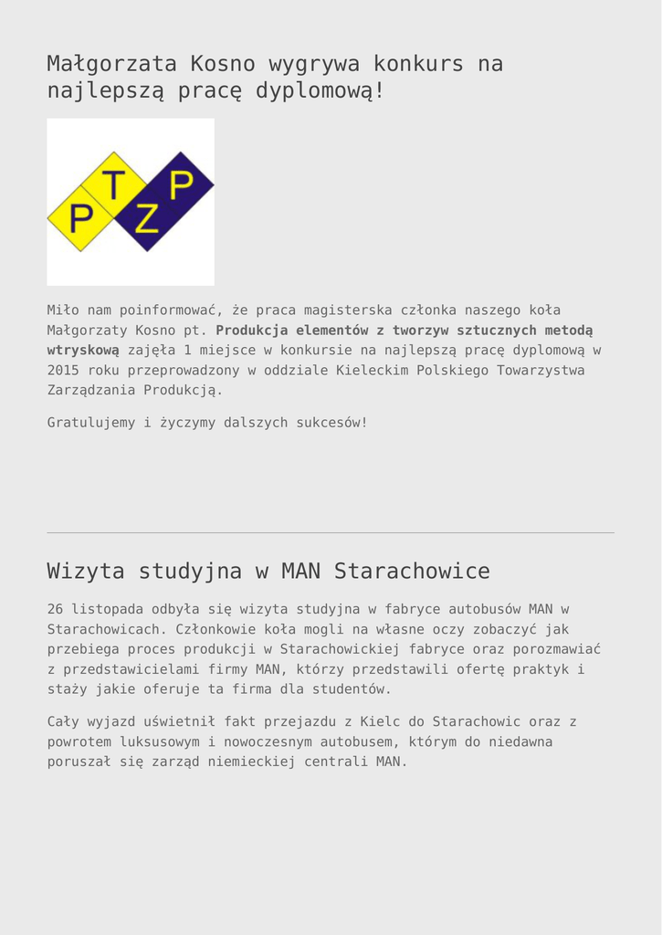 Małgorzata Kosno wygrywa konkurs na najlepszą pracę dyplomową! Miło nam poinformować, że praca magisterska członka naszego koła Małgorzaty Kosno pt. Produkcja elementów z tworzyw sztucznych metodą wtryskową zajęła 1 miejsce w konkursie na najlepszą pracę dyplomową w 2015 roku przeprowadzony w oddziale Kieleckim Polskiego Towarzystwa Zarządzania Produkcją. Gratulujemy i życzymy dalszych sukcesów! Wizyta studyjna w MAN Starachowice 26 listopada odbyła się wizyta studyjna w fabryce autobusów MAN w Starachowicach. Członkowie koła mogli na własne oczy zobaczyć jak przebiega proces produkcji w Starachowickiej fabryce oraz porozmawiać z przedstawicielami firmy MAN, którzy przedstawili ofertę praktyk i staży jakie oferuje ta firma dla studentów. Cały wyjazd uświetnił fakt przejazdu z Kielc do Starachowic oraz z powrotem luksusowym i nowoczesnym autobusem, którym do niedawna poruszał się zarząd niemieckiej centrali MAN. Członkowie koła: Adrian Wołos, Klaudia Wójcik, Maciej Płaza oraz Wojciech Grabowski biorący udział w wizycie studyjnej w zakładach MAN Milionerzy z Politechniki Świętokrzyskiej Trzej studenci Politechniki Świętokrzyskiej: Adrian Wołos, Andrzej Kwiatkowski i Wojciech Grabowski, zostali laureatami konkursu gry „Pierwszy Milion”, który zorganizował Urząd Marszałkowski Województwa Świętokrzyskiego w Kielcach wspólnie z Fundacją im. Leopolda Kronenberga w Warszawie. Dziś w Urzędzie Marszałkowskim odebrali czeki na odpowiednio: 3 000, 2 000 i 1000 zł, które były nagrodą w konkursie. Dodatkową nagrodą dla zwycięzcy jest możliwość odbycia płatnego, miesięcznego stażu w jednym z departamentów Urzędu. Kazimierz Kotowski, członek Zarządu Województwa Świętokrzyskiego, gratulując studentom wygranej podkreślał, że zdobyte w trakcie wirtualnej gry umiejętności z pewnością przydadzą się w realnym życiu. – Cieszę się, że wspólnie z Fundacją Kronenberga udało nam się przeprowadzić ten konkurs. Edukacja finansowa, ekonomiczna, ma współcześnie ogromne znaczenie, szczególnie dla młodych ludzi, studentów, którzy dopiero wkraczają w dorosłe życie i będą się mierzyć z gospodarowaniem własnymi finansami – mówił Kazimierz Kotowski. „Pierwszy Milion” to gra symulacyjna online, odtwarzająca realia rynkowe, dostępna przez Internet, która uczy jednocześnie: gospodarowania budżetem, oszczędzania oraz inwestowania na giełdzie. Użytkownik może korzystać z różnorodnych narzędzi i instrumentów finansowych, nabywa umiejętności zarządzania budżetem domowym, konstruowania strategii inwestycyjnych, a także oceny ryzyka. – Gra jest trudna, bo dotyczy zarządzania finansami osobistymi. Odpowiada na pytania: jak zarabiamy pieniądze, jak je wydajemy, jak to robić, by mieś stabilną domową sytuację finansową – mówi Krzysztof Kaczmar, prezes Fundacji Bankowej im. Leopolda Kronenberga w Warszawie – Gra daje możliwość sprawdzenia młodym ludziom swojej wiedzy, swoich umiejętności, strategii inwestycyjnych i zarobienia swojego pierwszego miliona. Jak to zrobić? – Inwestowałem w akcje, surowce, omijałem mało rentowne inwestycje, takie jak nieruchomości, czy obligacje. Gra była bardzo ciekawa, szczególnie dla osób, które dopiero zaczynają interesować się własnymi finansami, poznają dzięki temu różnorodne instrumenty i mechanizmy finansowe – zdradza Wojciech Grabowski, laureat III miejsca w konkursie. Konkurs był dedykowany wyłącznie osobom studiującym na świętokrzyskich uczelniach. W puli konkursu było 6 tysięcy złotych. Aby po nie sięgnąć, należało pomiędzy 7 a 18 kwietnia br. wejść na stronę gry: www.1milion.edu.pl i jak najszybciej zarobić wirtualny milion. Ta sztuka udała się 11 studentom, najlepsza spośród nich była trójka z Politechniki Świętokrzyskiej. źródło: http://www.sejmik.kielce.pl/item/40119-milionerzy-z-politechni ki-swietokrzyskiej